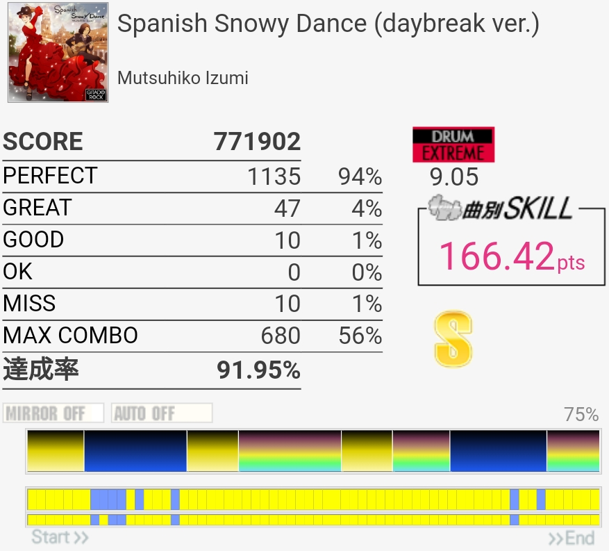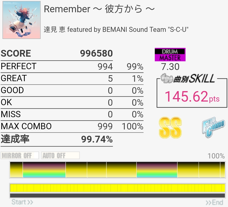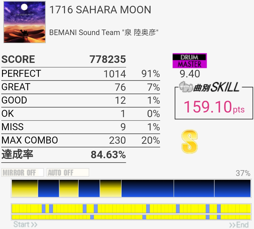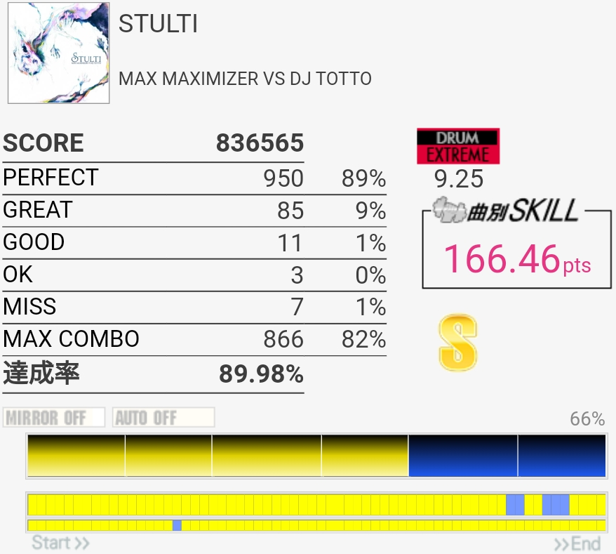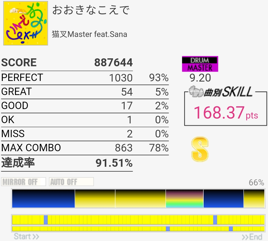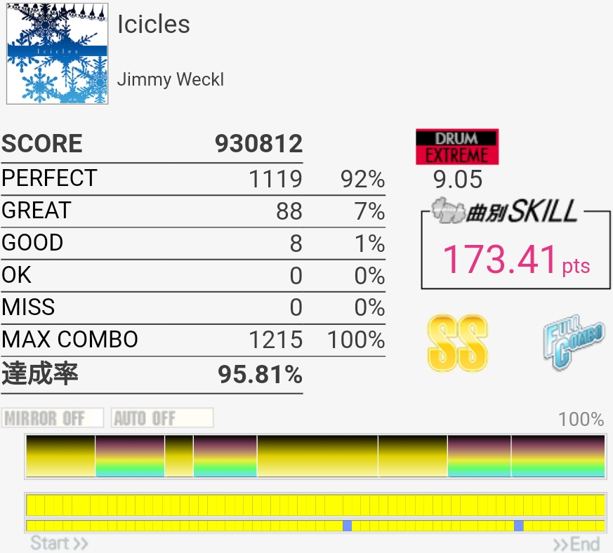 達成率0.3%、スキル0.5くらい伸びた。そう……イントロはけっこう繋がるようになってきたんだけどBメロのタム回し苦手なんだよなあ。LTかFTで左手を外してしまう。