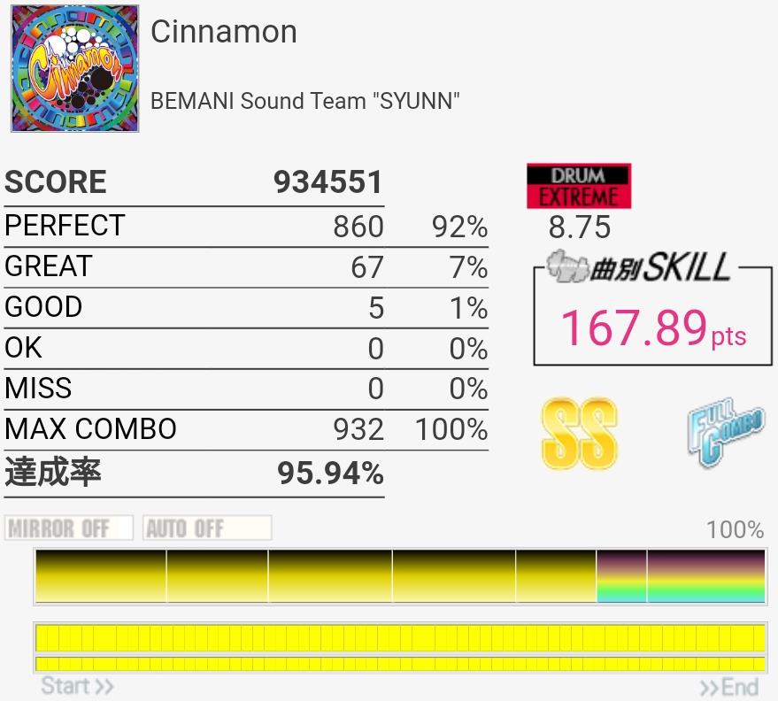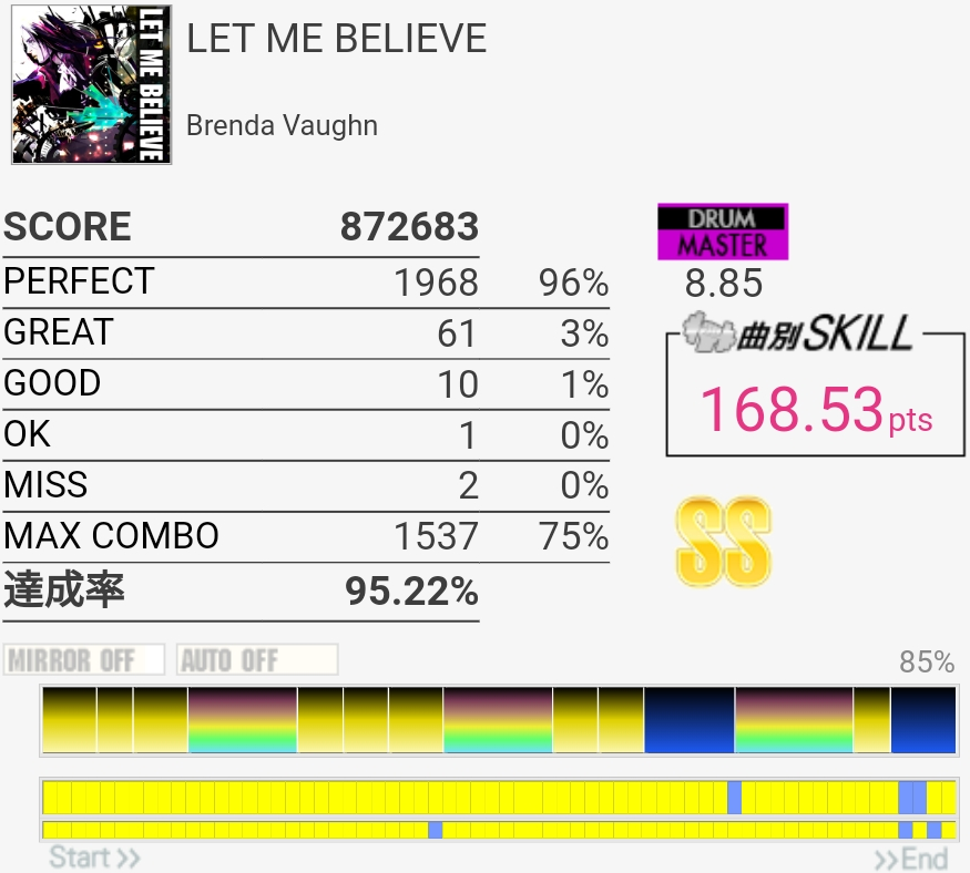 フルコン!!!!!最後のフレーズいつも切っちゃうんだけど気合入れたら繋がったわ。HHでズレまくったのが悲しい、けどSS乗ってるからいいや。この時点で8500まであと3くらいで、あと対象に入りそうな曲をひたすらやってたわけだけど……。