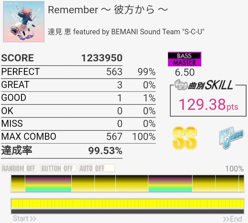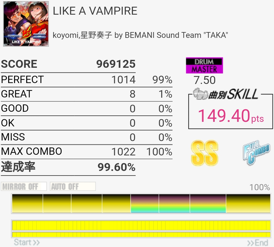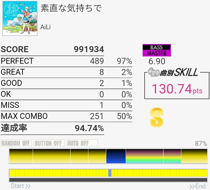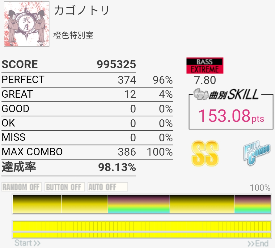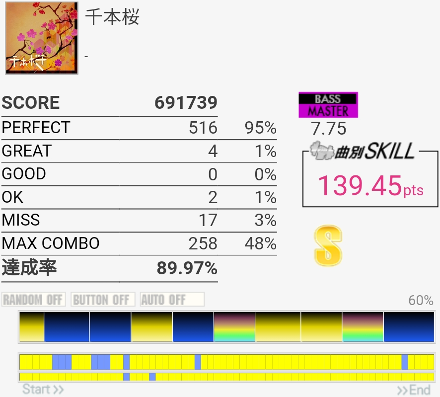 SS取得。最初ボーっとしてて見逃しちゃったけど以降は落ち着いて運指できた。複色も若干だけど見えるようになったのかな?