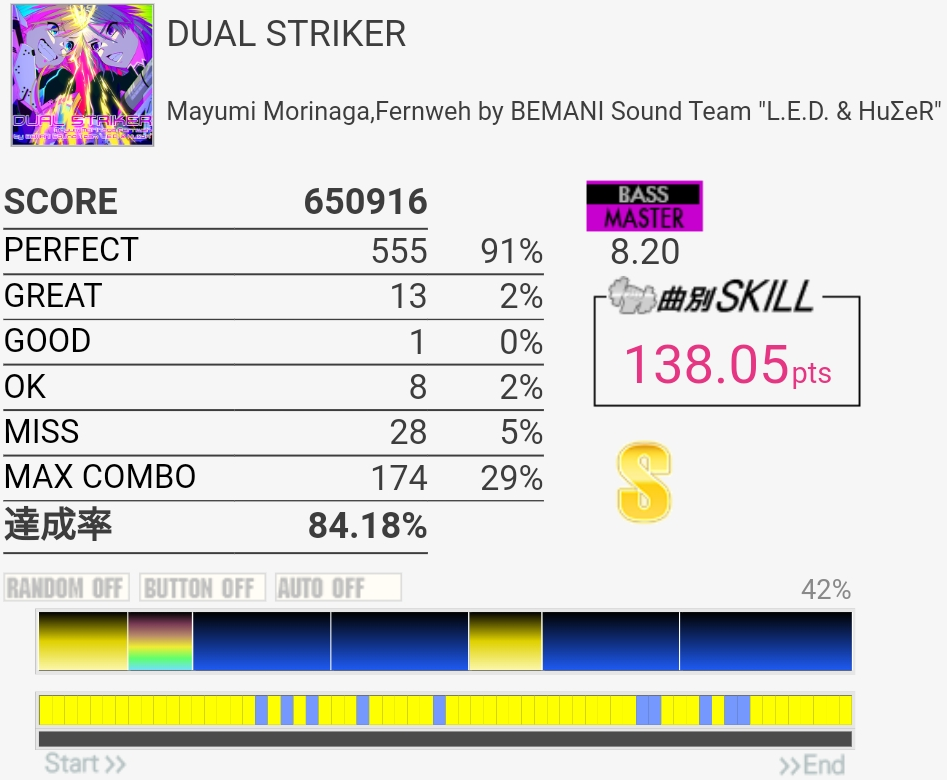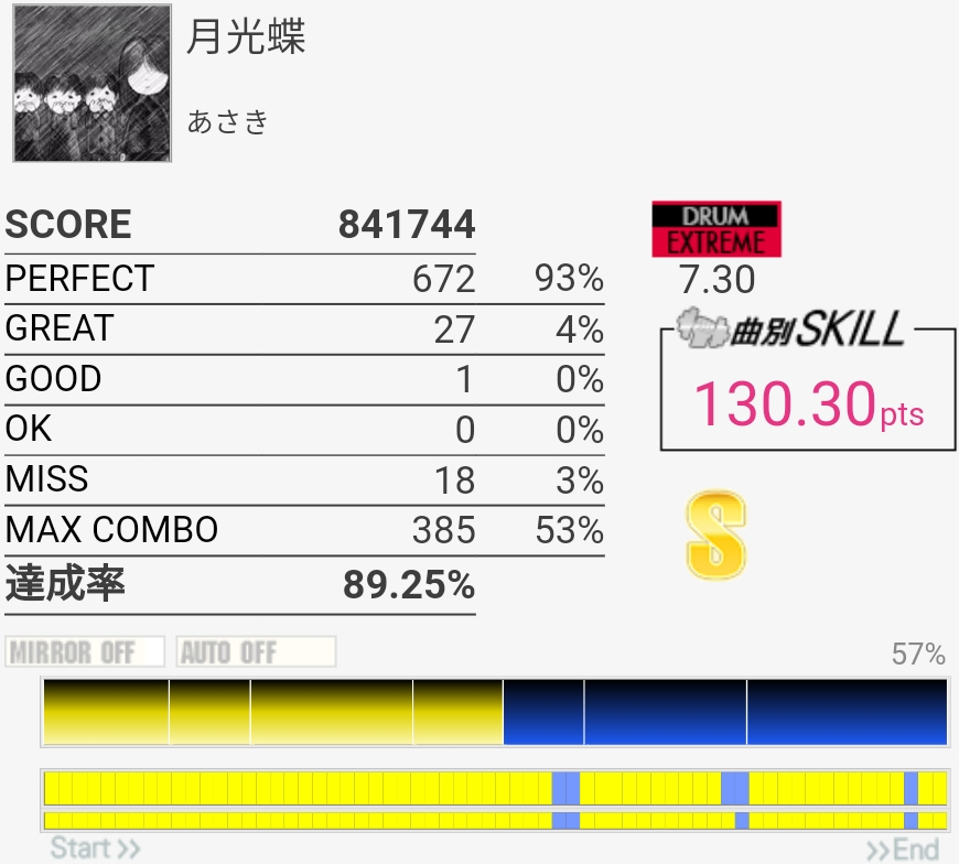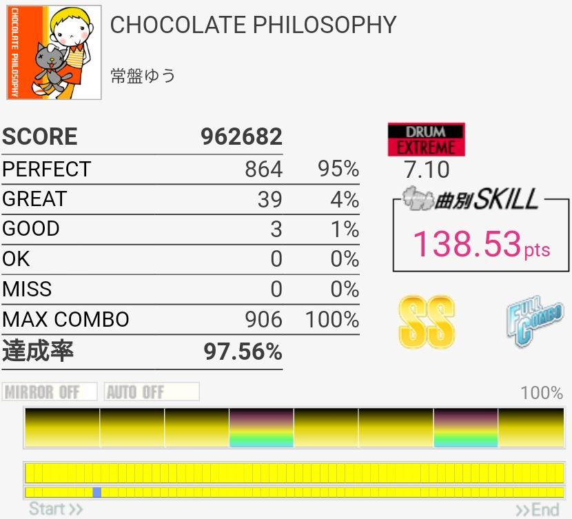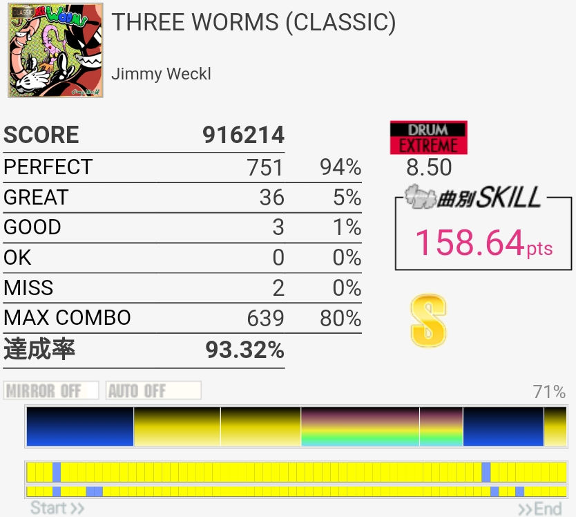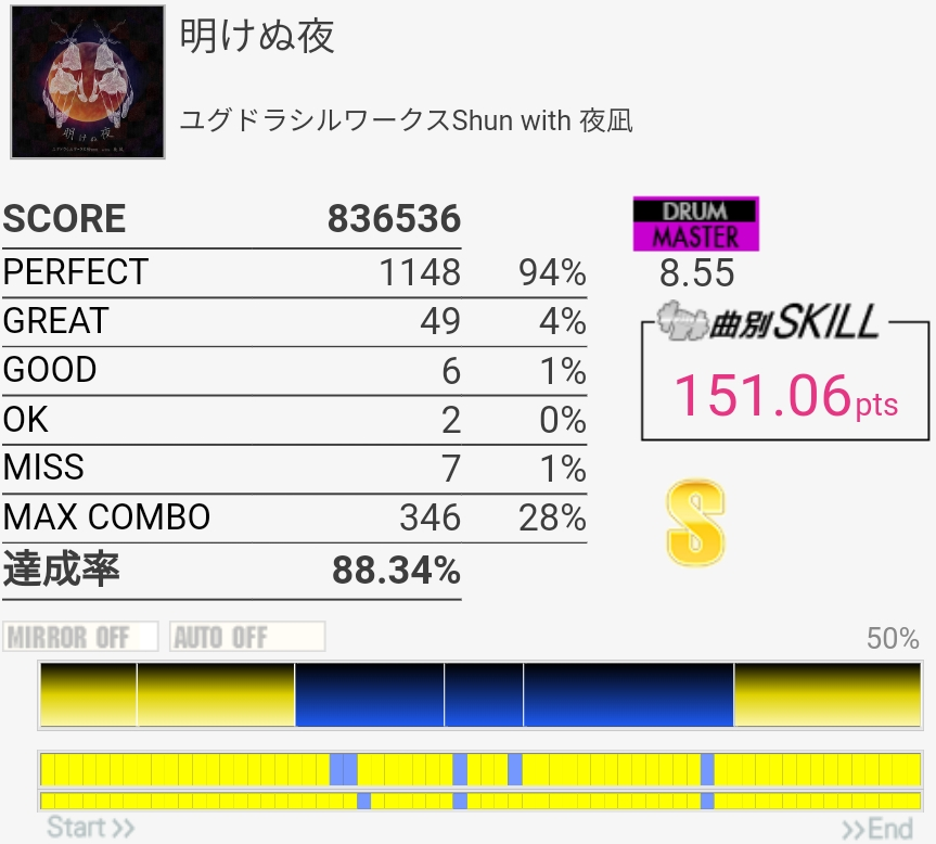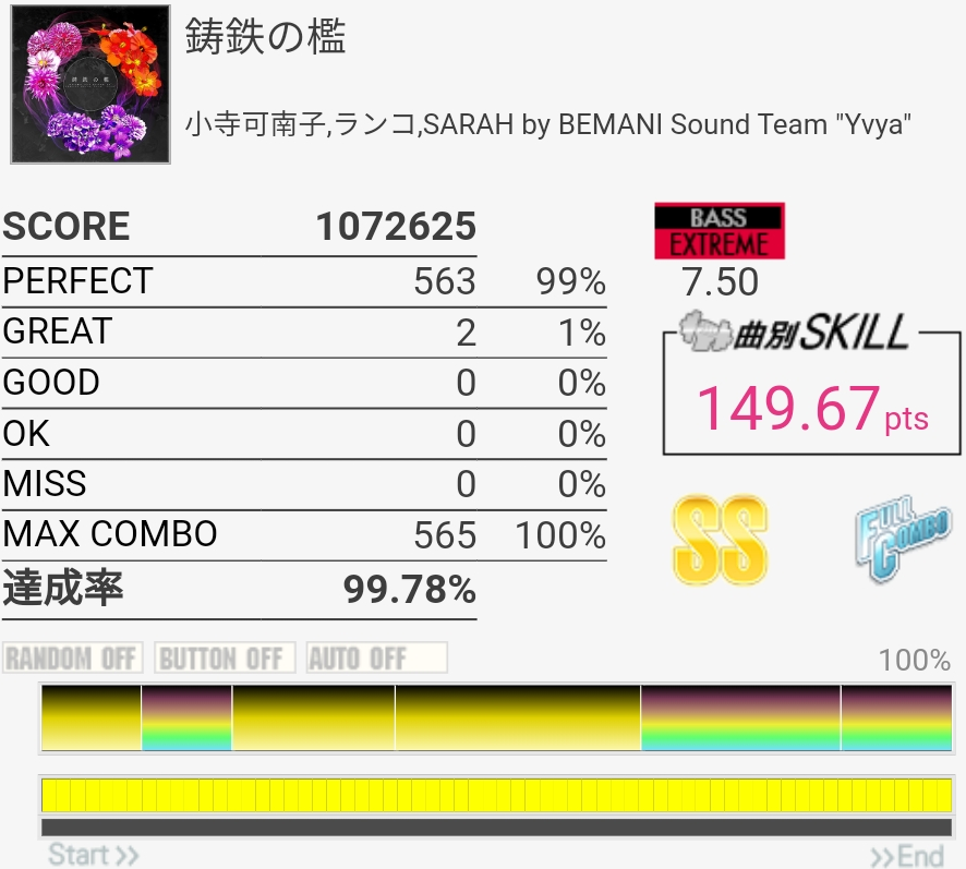 SS取得。最初ボーっとしてて見逃しちゃったけど以降は落ち着いて運指できた。複色も若干だけど見えるようになったのかな?