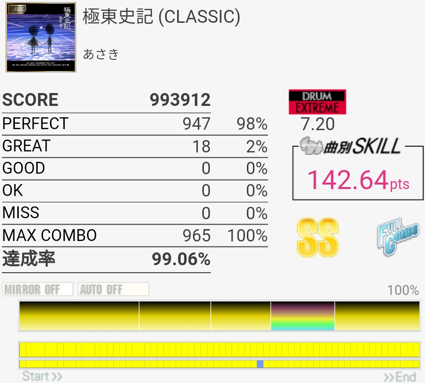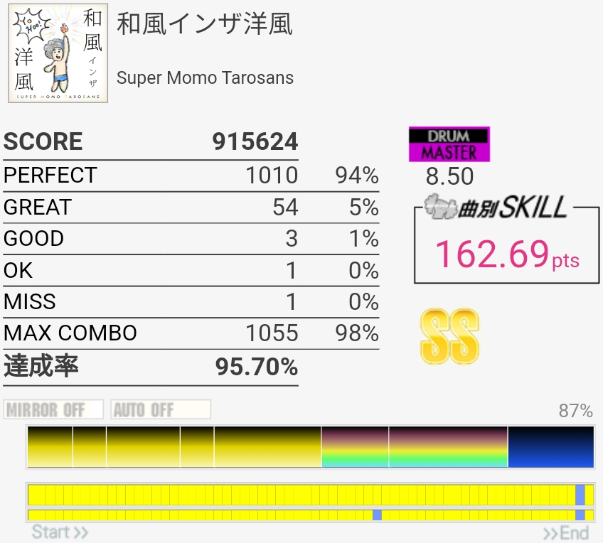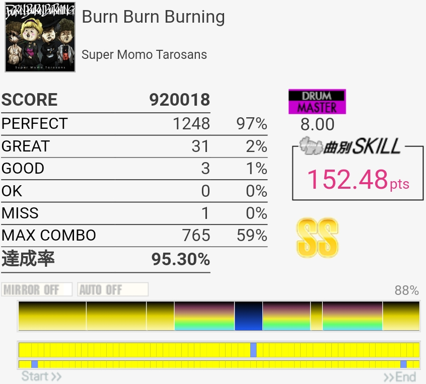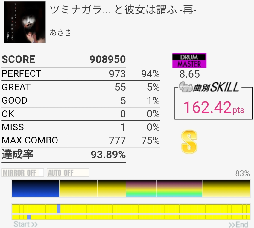 5フレーズ目繋がって180点取れるか!?と思ったら最後のフレーズでFT無反応した。LTも調子悪かったしなんなんだろうな。
