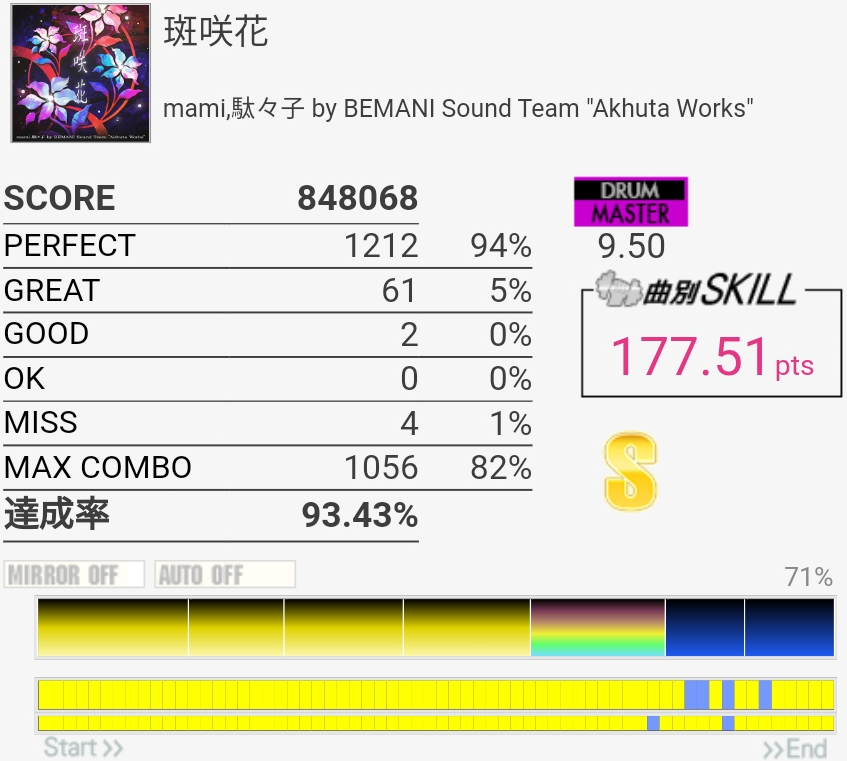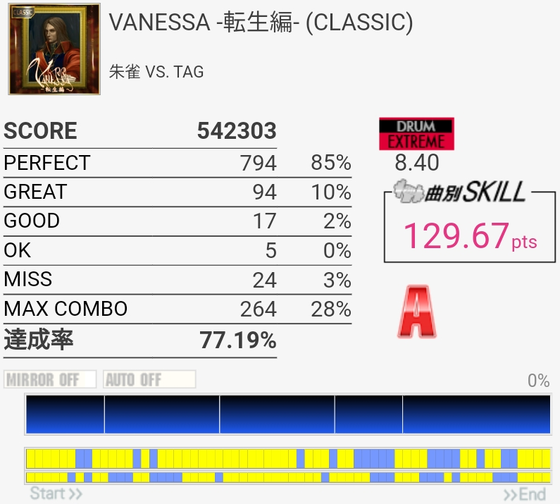 2回来る三連CYがキツい。それだけで自分にとっては9台前半になる。がんばったらなんか繋がったけど……それ以外も真ん中らへんと最後のよくわかんないタムが難しい。最後の連BP→偶数フィルからの奇数フィルはSN×3→HT×3を交互で取るとそのあともゴリ押しでなんとかなる、こともある。