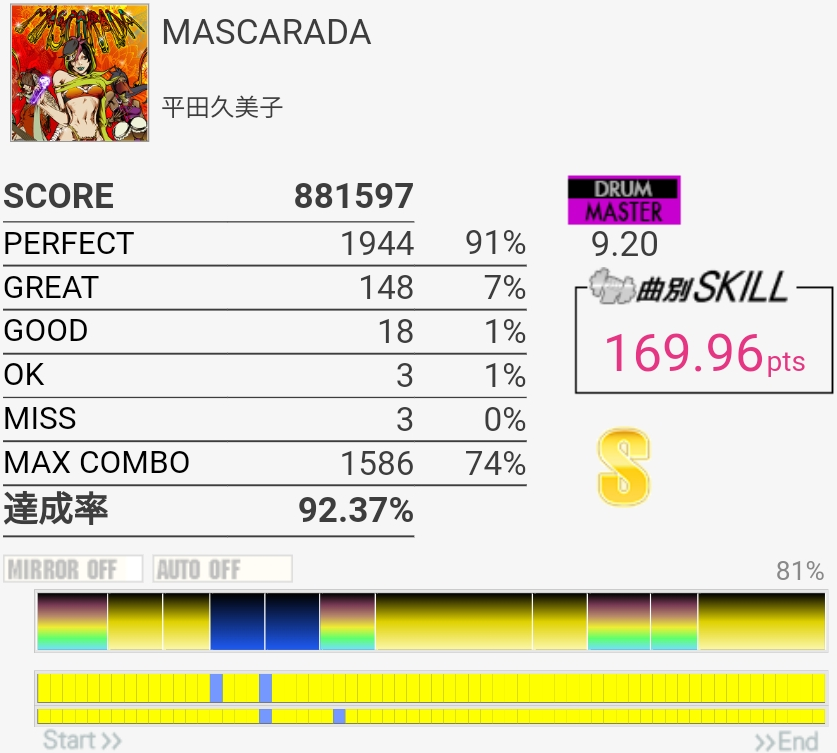 今日はなんか腕が重かった!あとスティック変えてから毎回右手薬指の付け根あたりに擦れて血豆みたいなのができてて、痛みで叩ききれないことが多い。スティックの持ち方が悪いんだろうけど……。