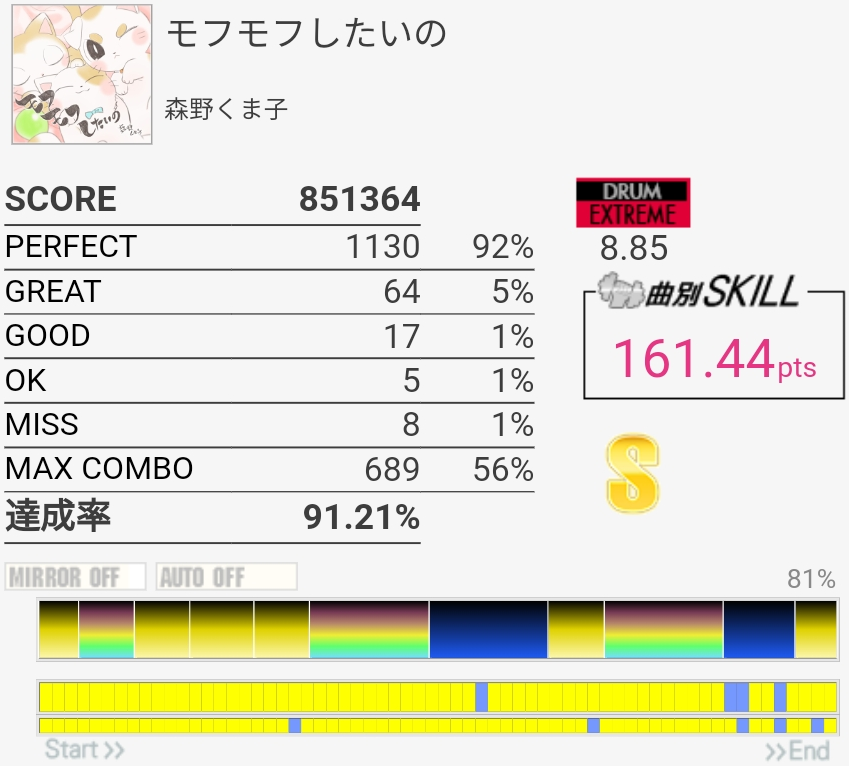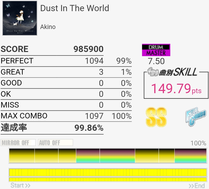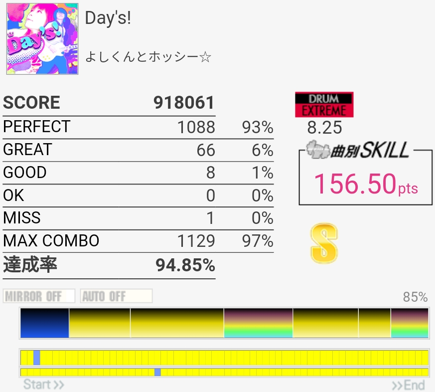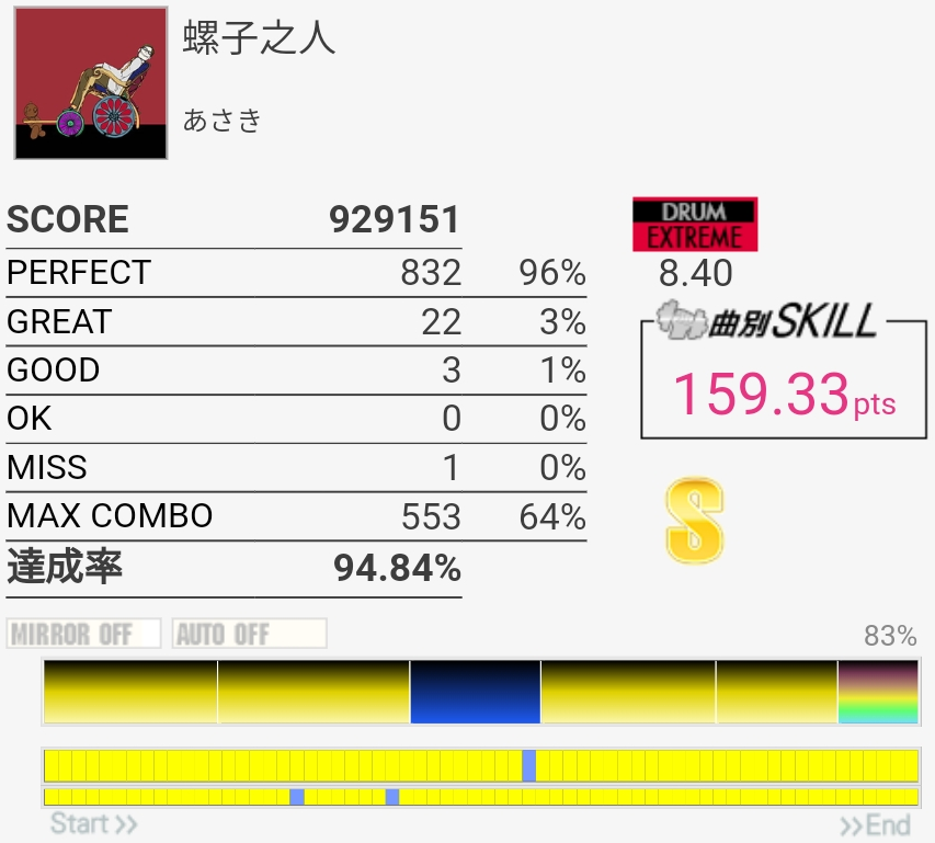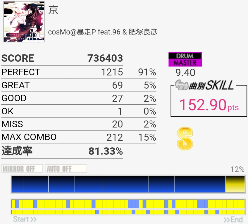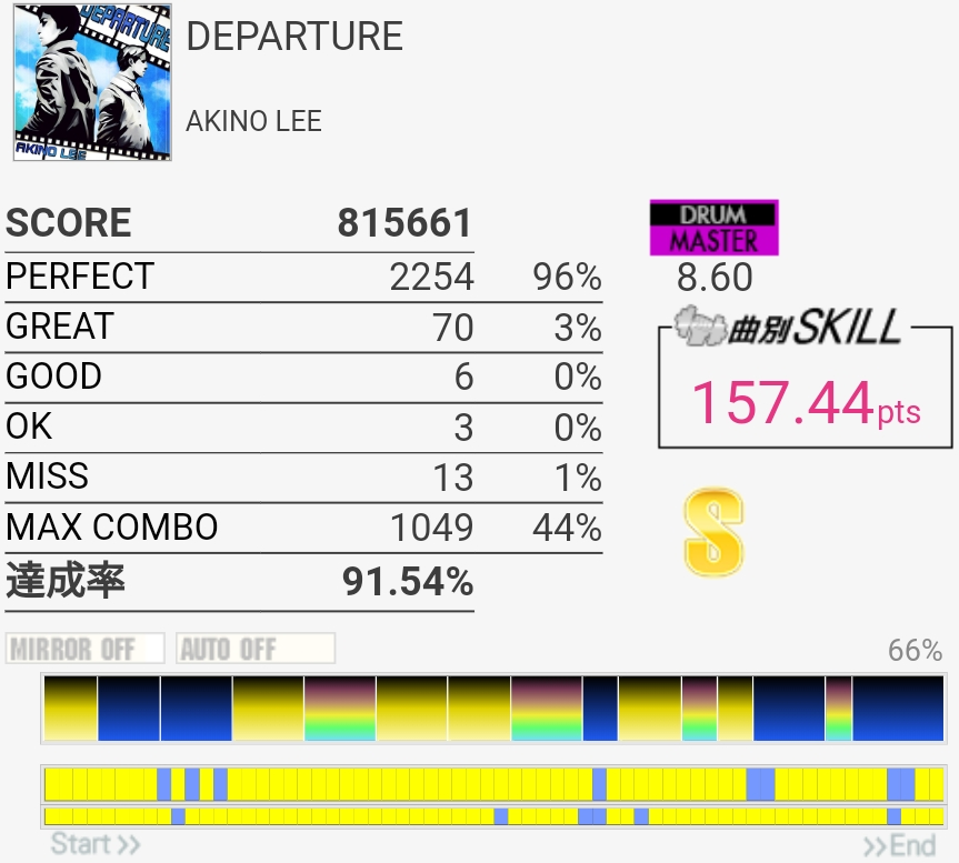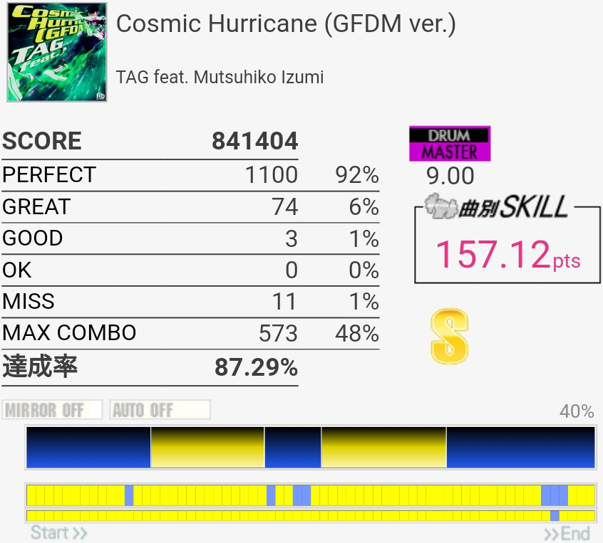 いままでで一番高いかな?サビのCYで3個くらい出たのが意味不明。なんかたまに叩いたタイミングから数フレーム反応が遅れるのがしばらく続く感じなんだよな。