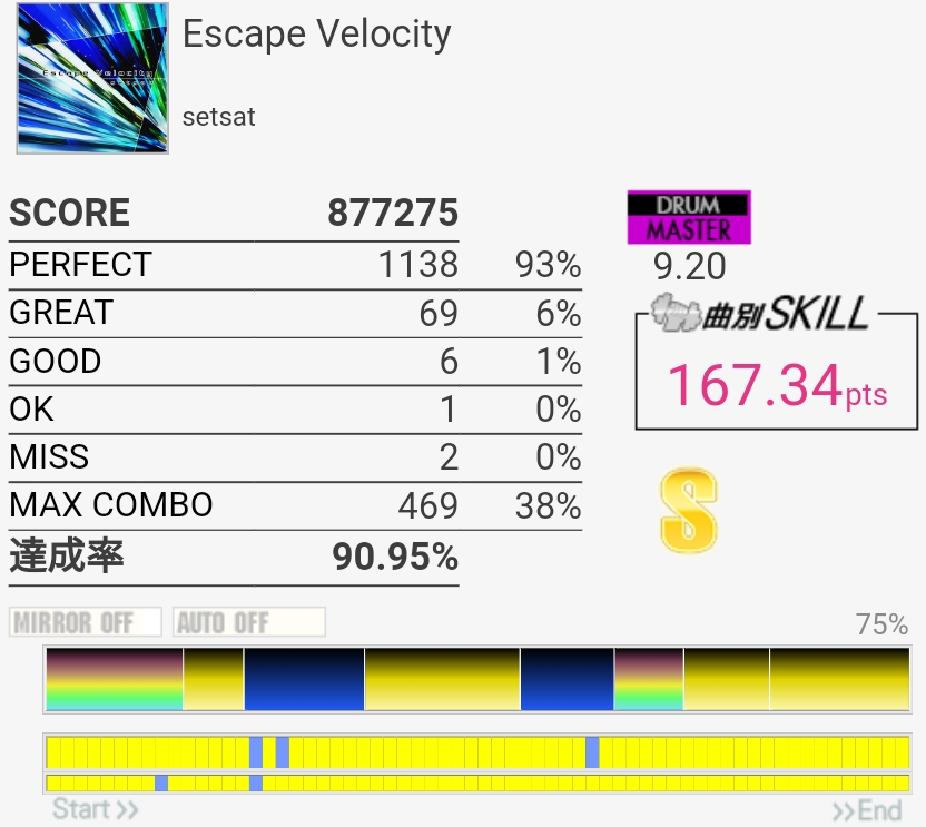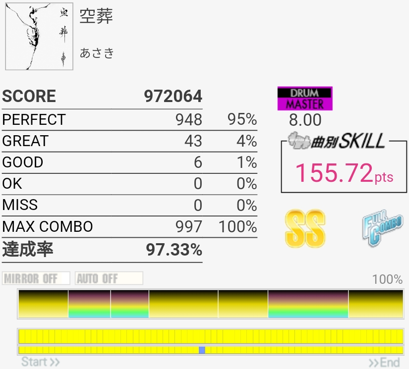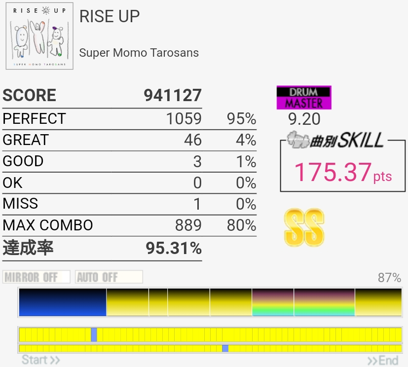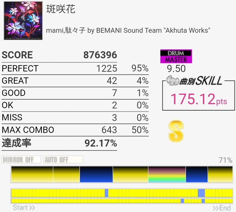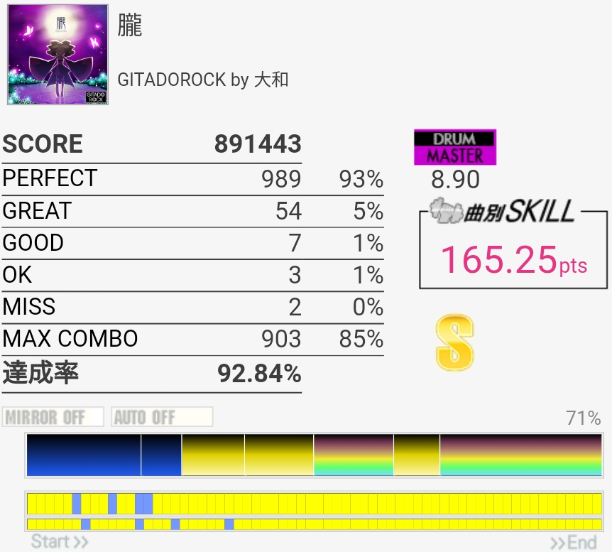 真ん中らへんのタム回しがダブル混ぜないと取れないやつなのでそこそこ難しい、けどBPMそんなに速くないのでなんとかなった。最後のSN連打なんか合わないんだけど16分じゃなかったり?