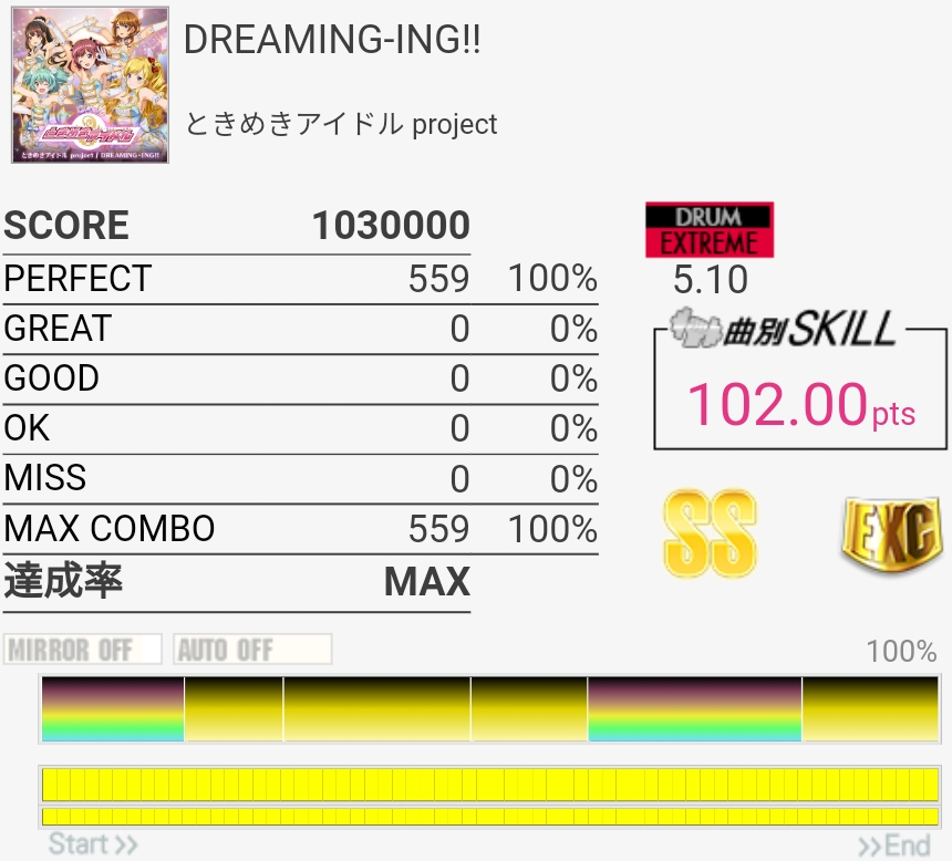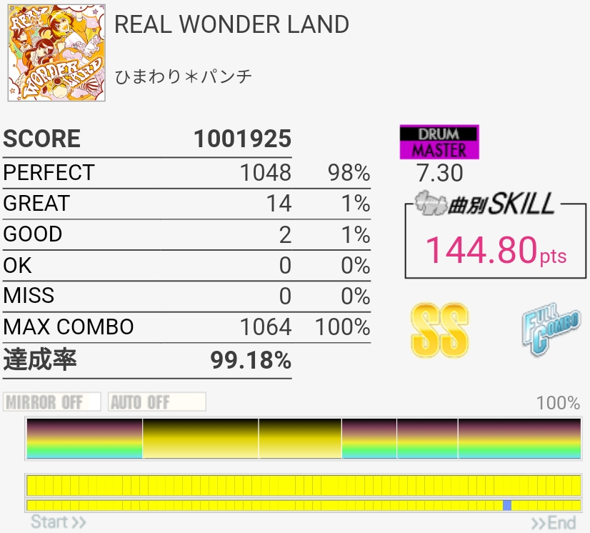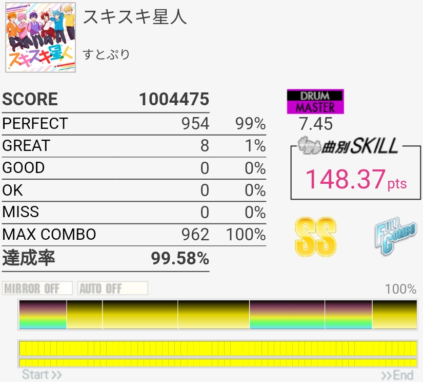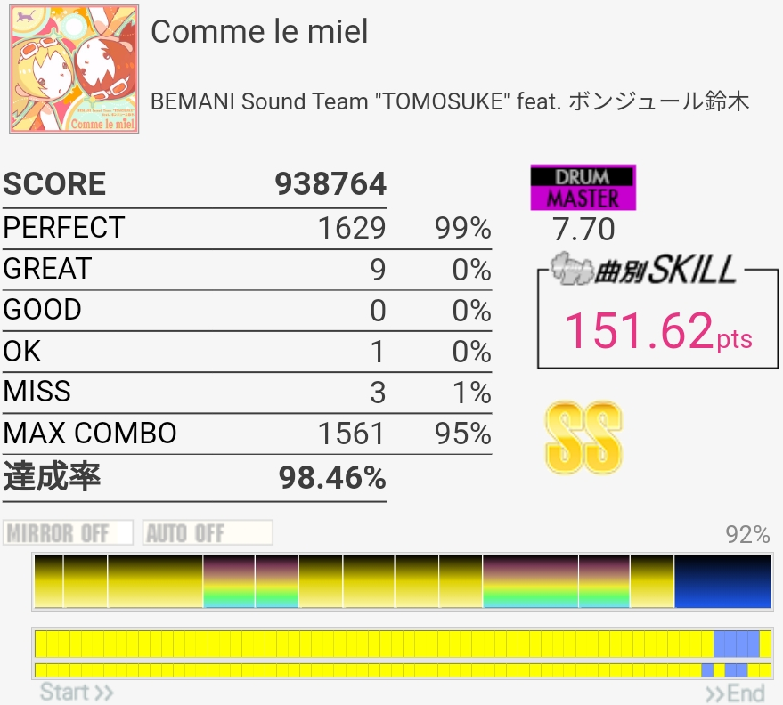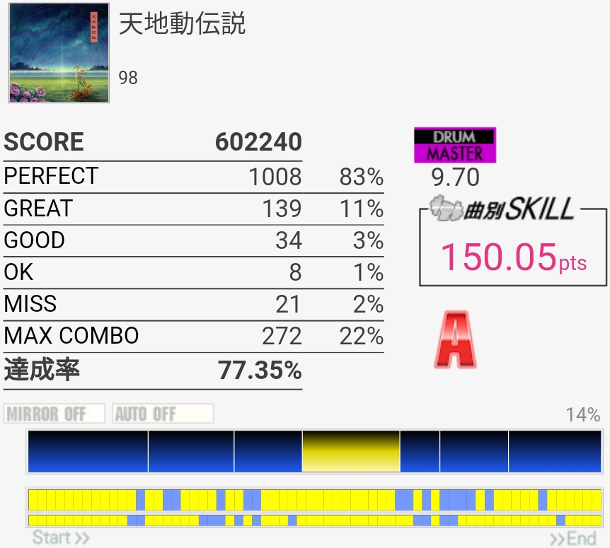 真ん中らへんのタム回しがダブル混ぜないと取れないやつなのでそこそこ難しい、けどBPMそんなに速くないのでなんとかなった。最後のSN連打なんか合わないんだけど16分じゃなかったり?