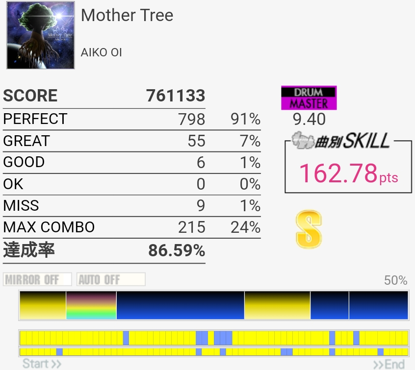 この人の高難易度譜面って交互で叩ける部分多いけど振り回されるし速いからそんな良心的とも言えないんだよな。全体的に窮屈、というのは9台後半狙って作ったらしいからそうなるか。あと変拍子にする必要ある?って思っちゃったので個人的にできるようになりたいとは思わない曲。もっとうまくなったら違うのかな~。
