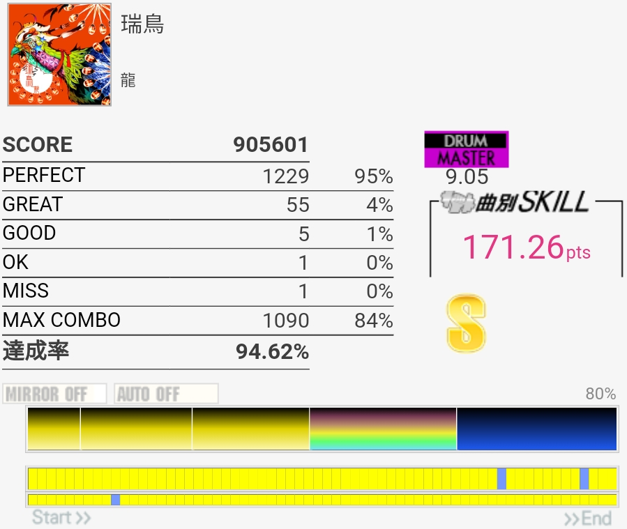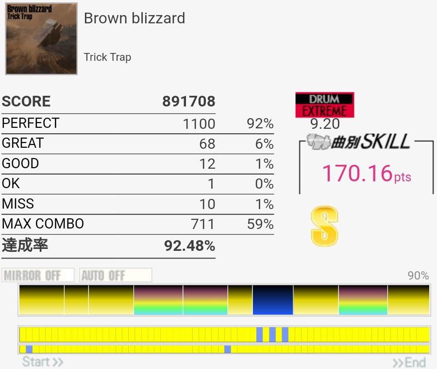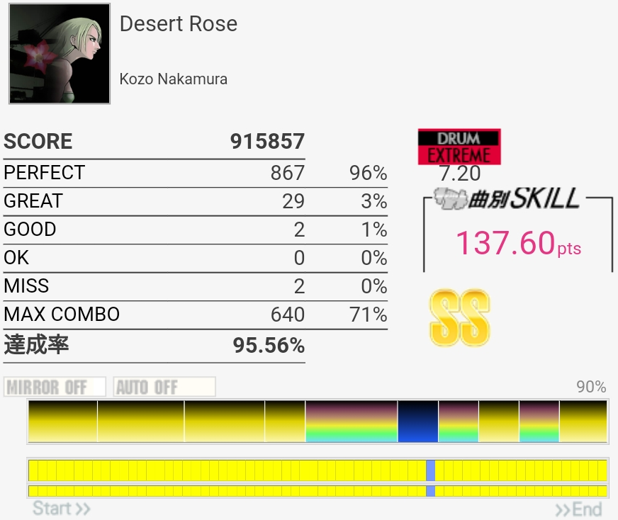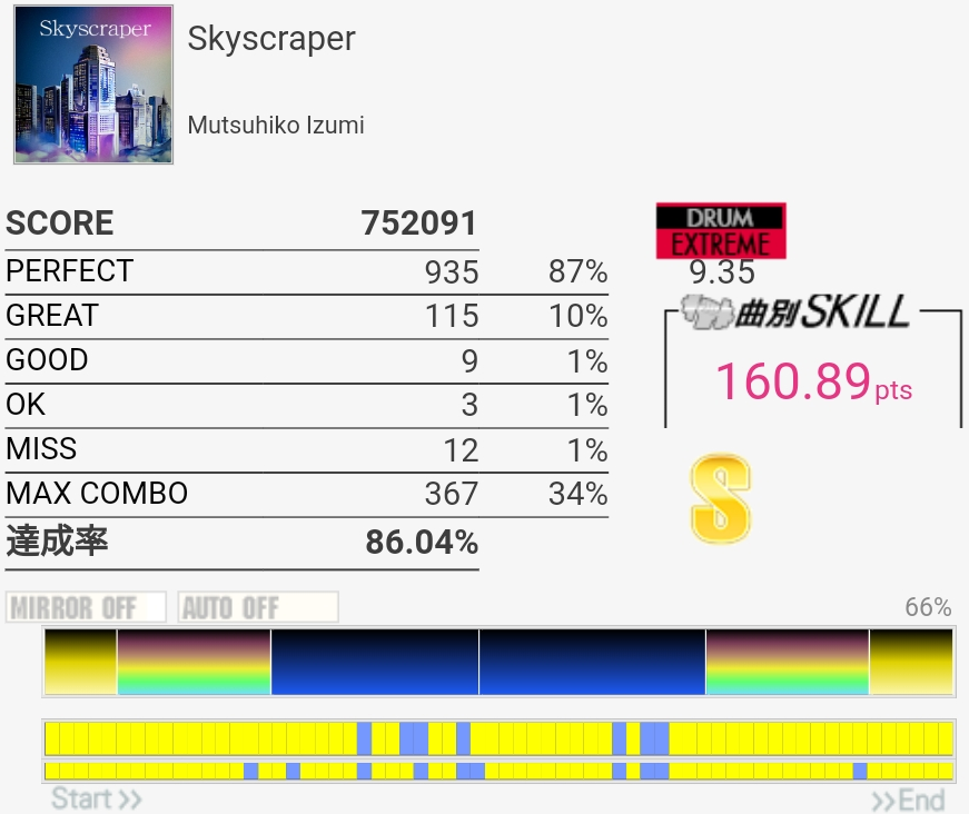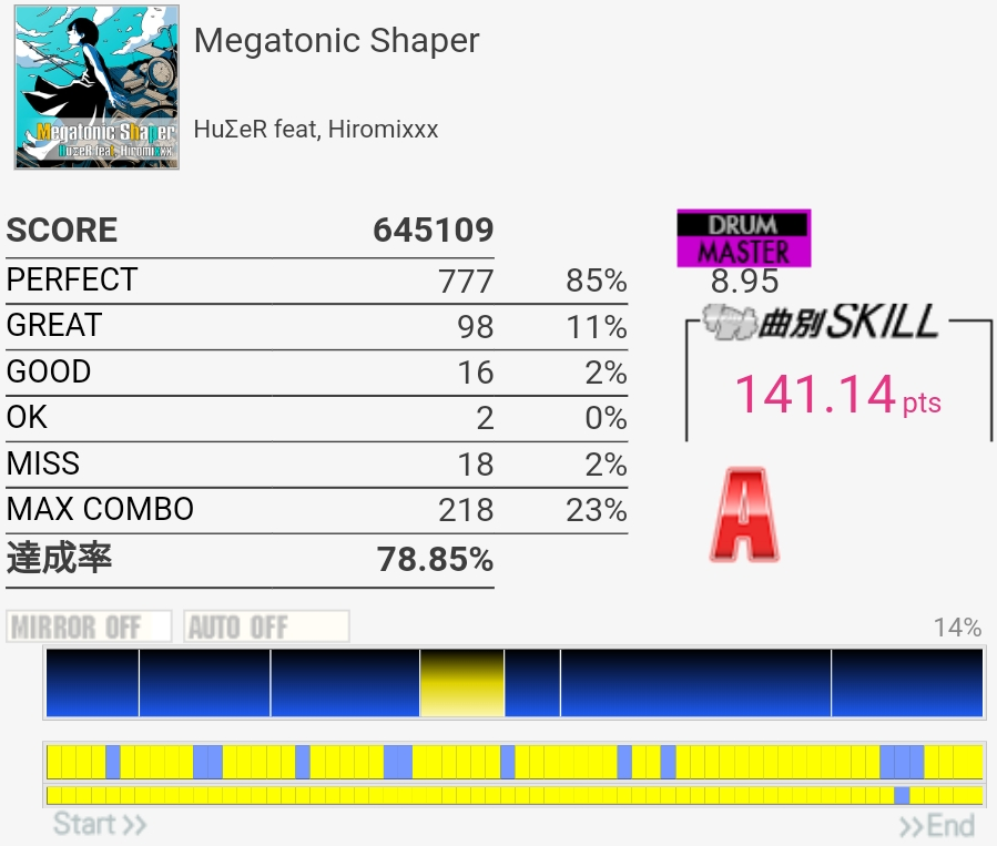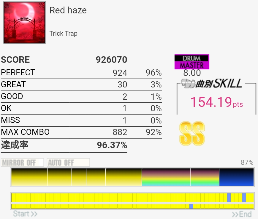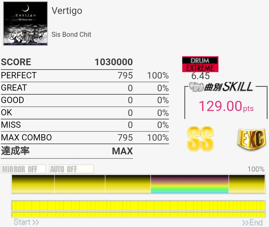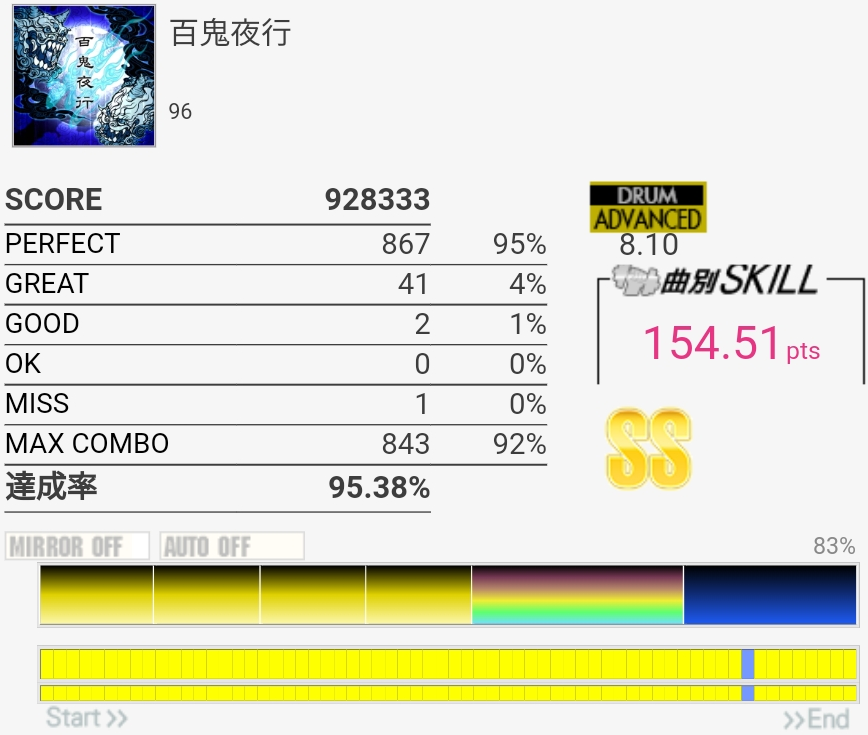 SS取得。三連符叩けなくてもSS乗るんだな!タムも何気に切りやすいけど速めを意識してまあ繋がりはした。