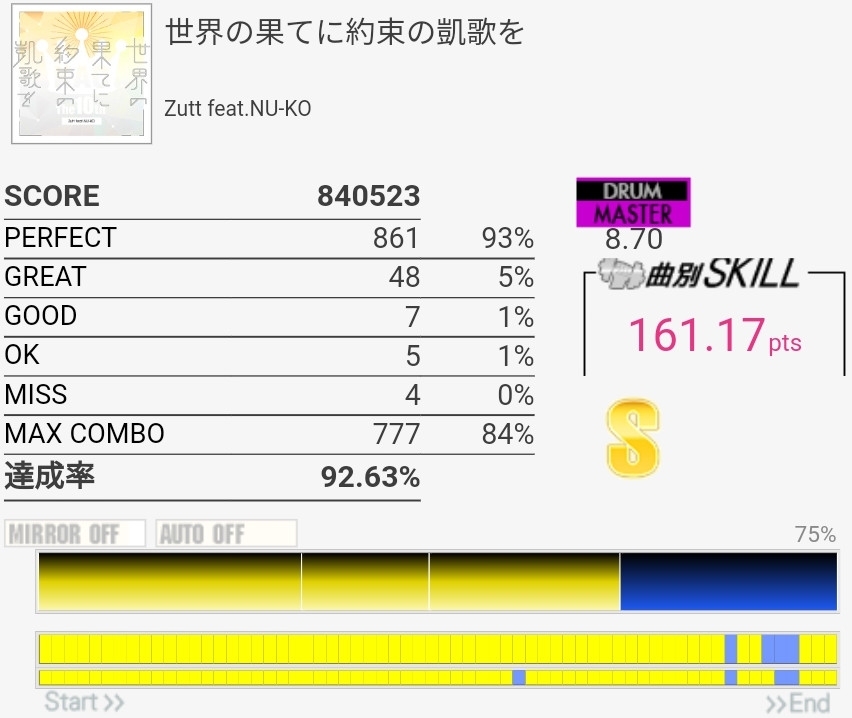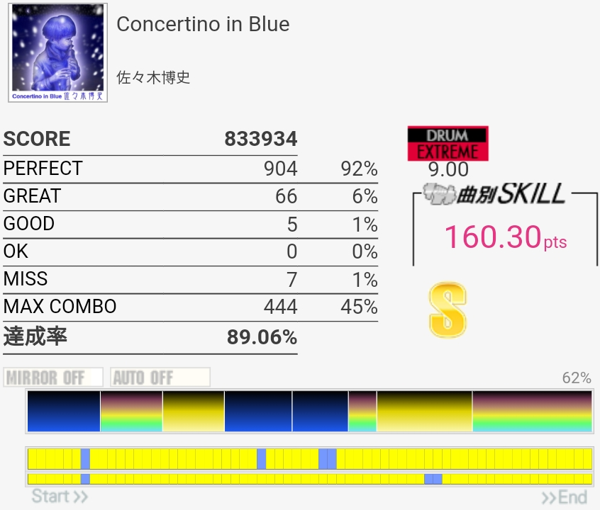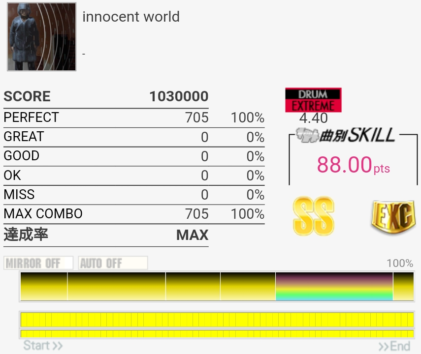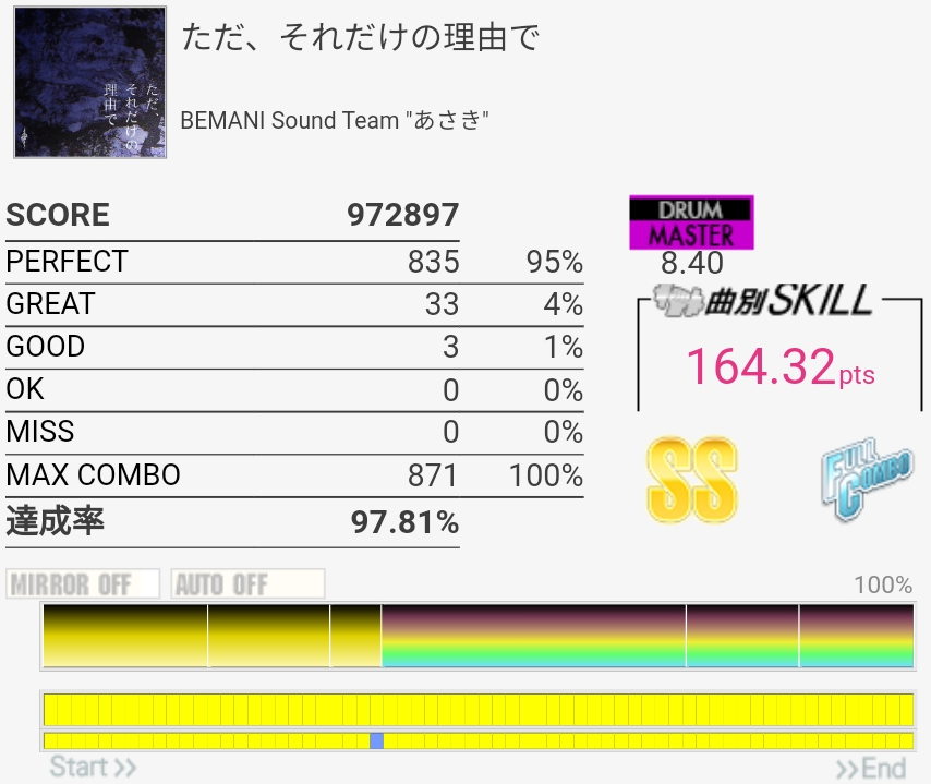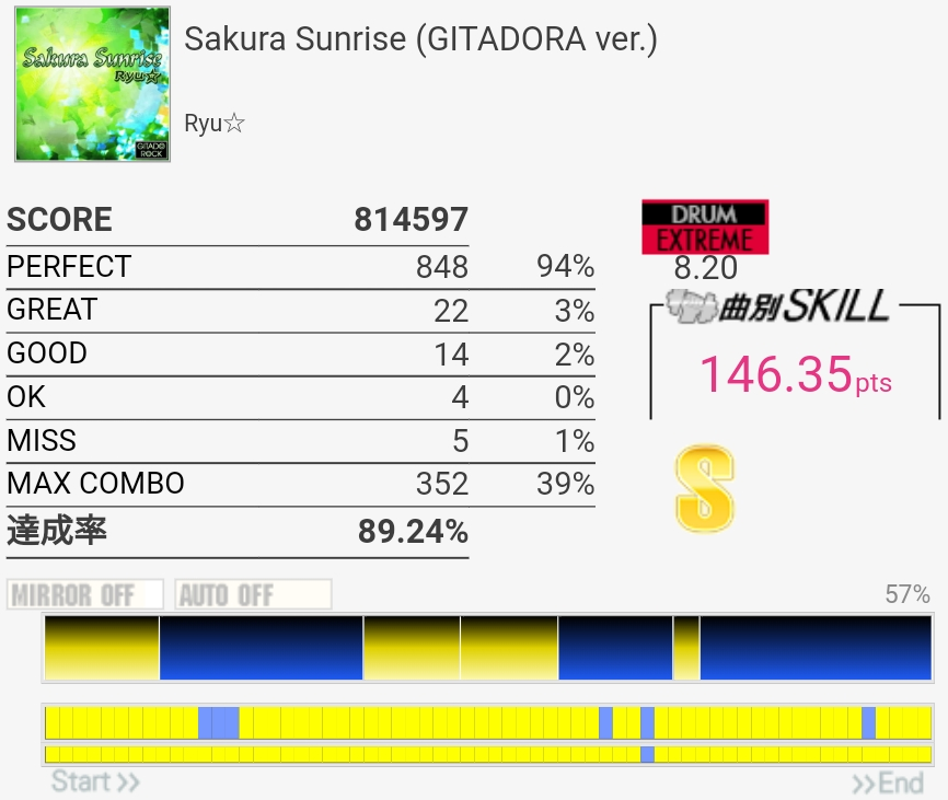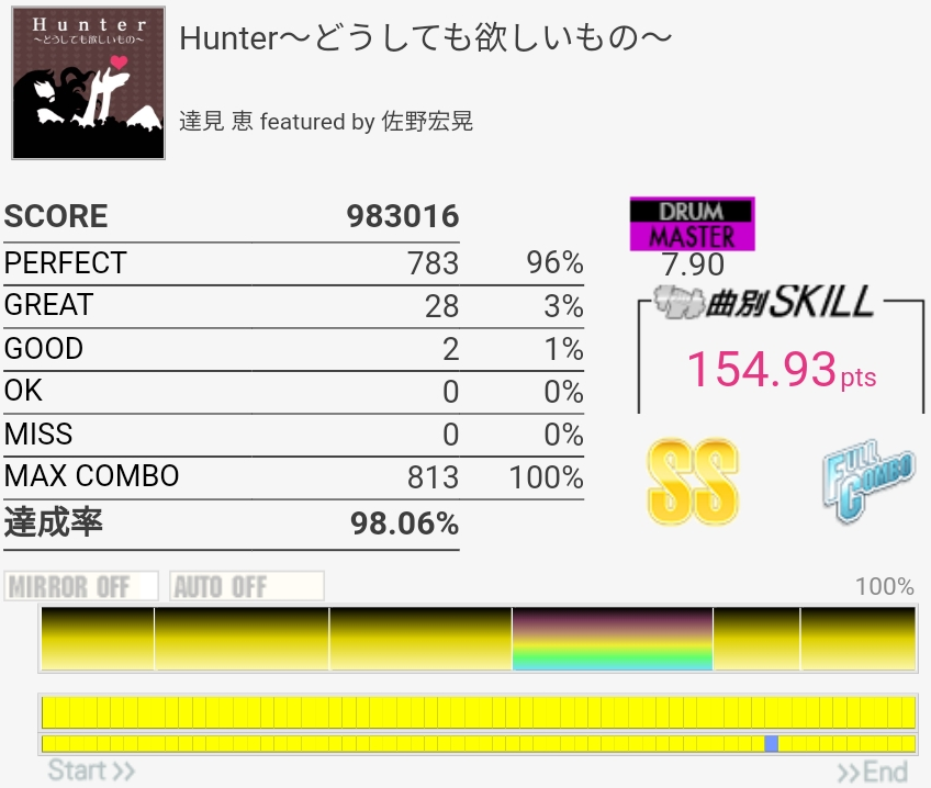 フルコン。3フレーズ目の難所がなんか繋がったので後半ずっと緊張してた。ツーバスから裏拍BPに変わるところを忘れてて崩れたけどギリギリGOOD判定になってくれたので危なかった。なんで繋がったのかわからん。