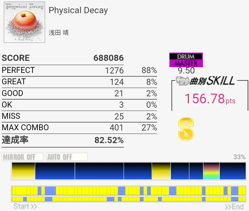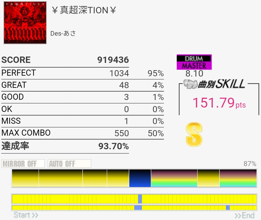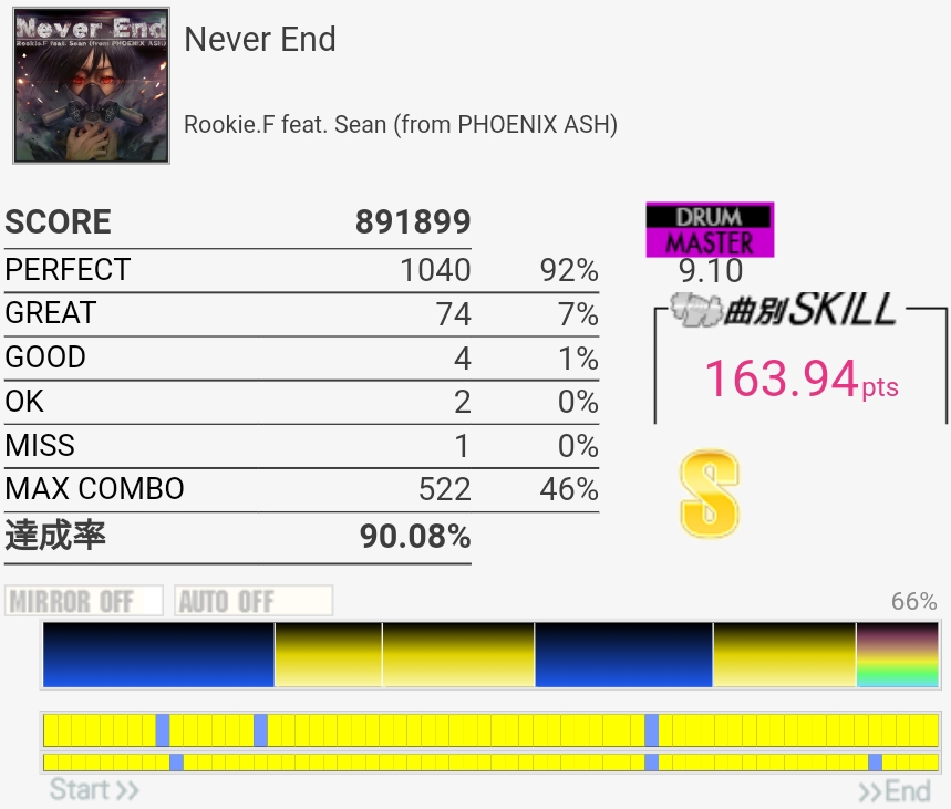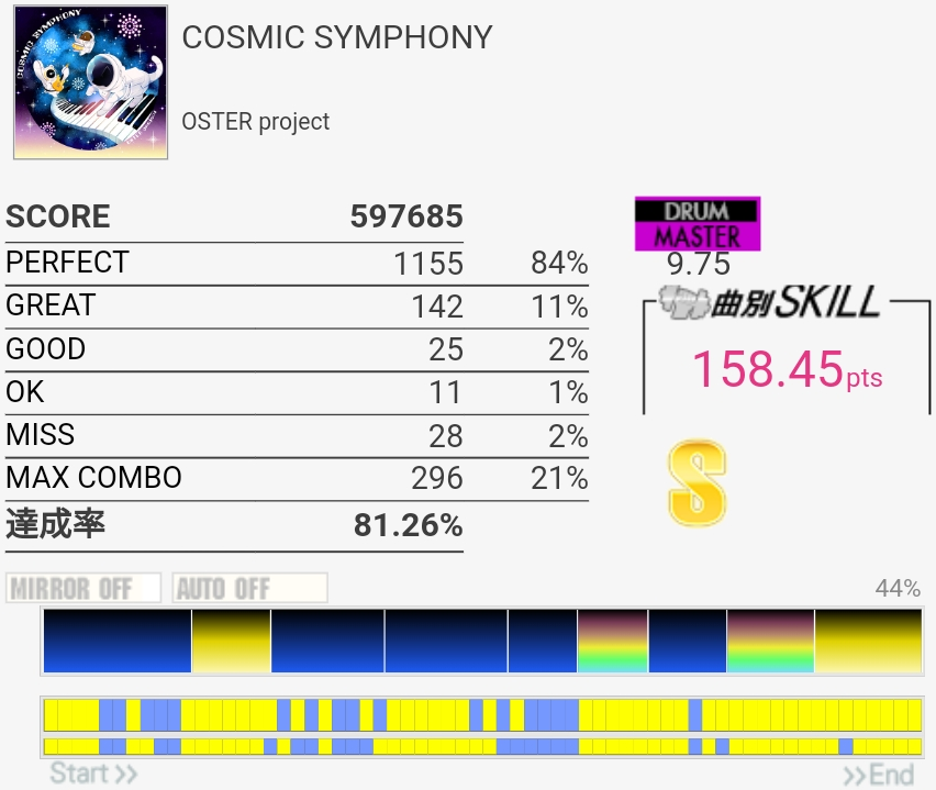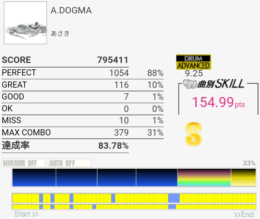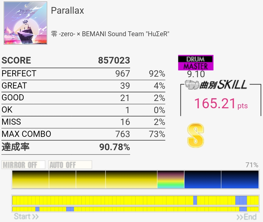 相変わらずSNが反応しなかったりBPが遅れて反応したりしたけど、なんというか日曜日の筐体に比べて叩きやすさというか……筐体に慣れてる分しっくりくる感はやっぱりあった。それって癖ついてるってことじゃないんですかね。
