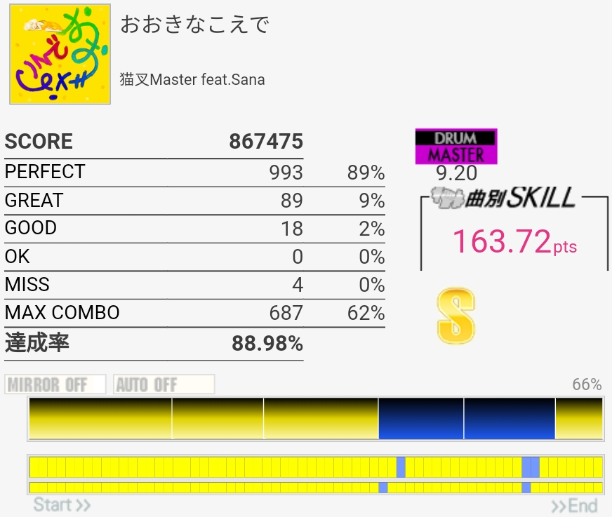 ちょい伸び。どっちも凡ミスというか先の譜面を見すぎちゃって手が固まった感じ。