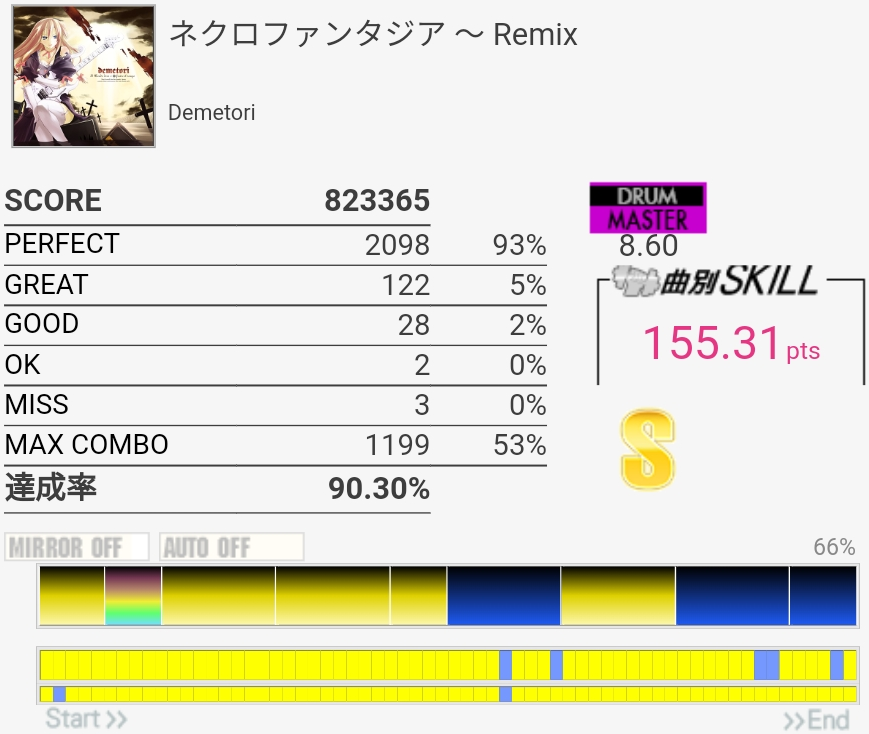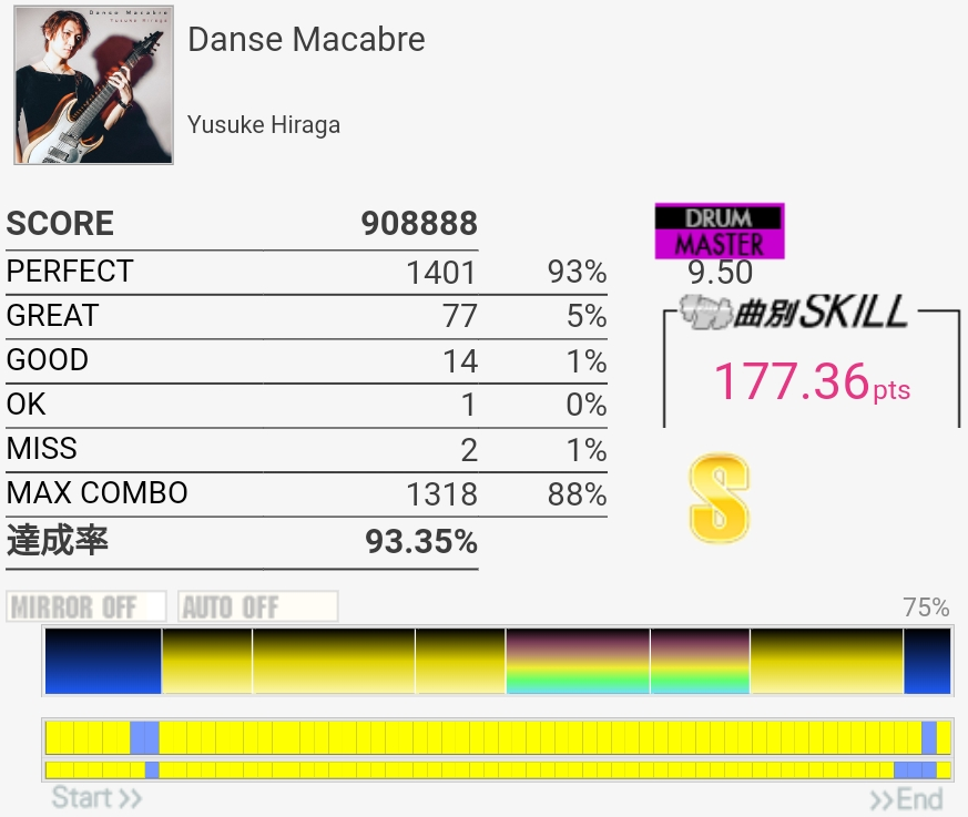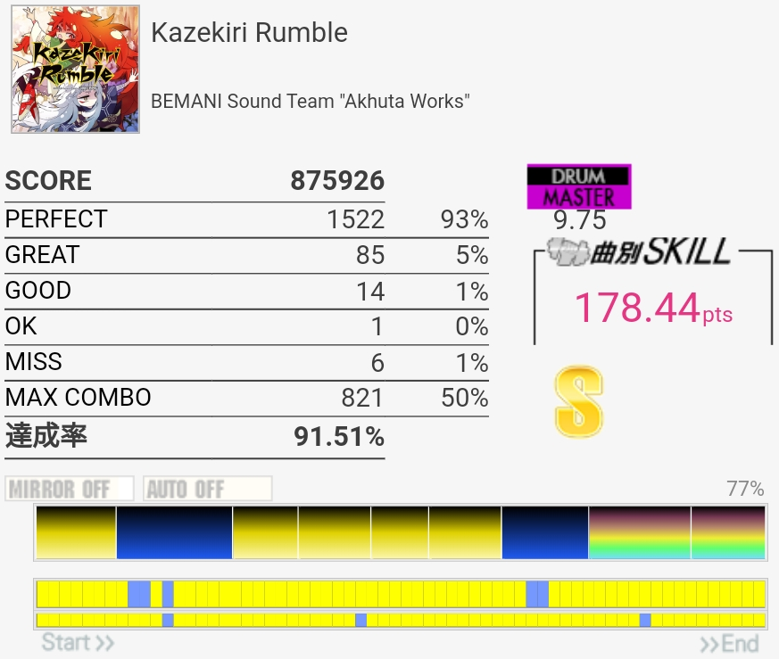 イントロだけで9.30くらいあるんだけど。MEDUSAは後半簡単だったしゴリ押しも比較的しやすかったけど、こっちはいちいち叩きづらいのが来るからやだな。TheaterR名義の曲はめっちゃ好きなんだけど。