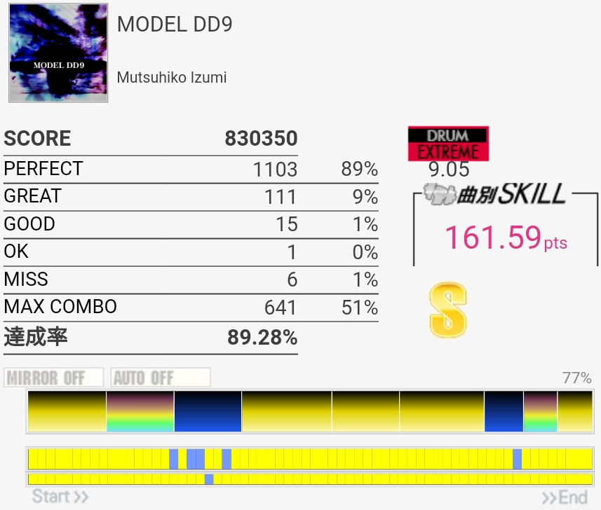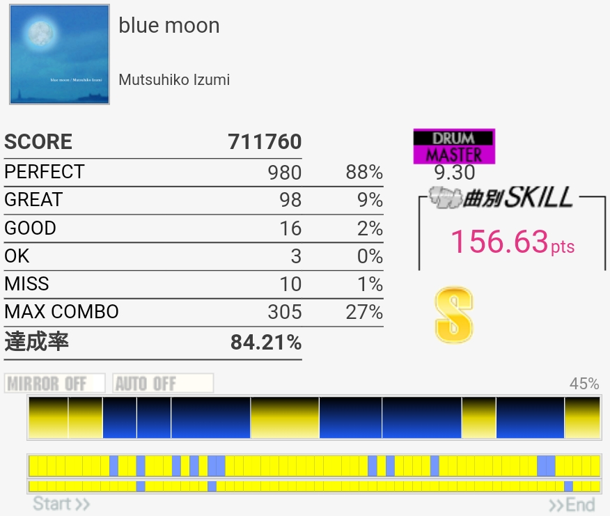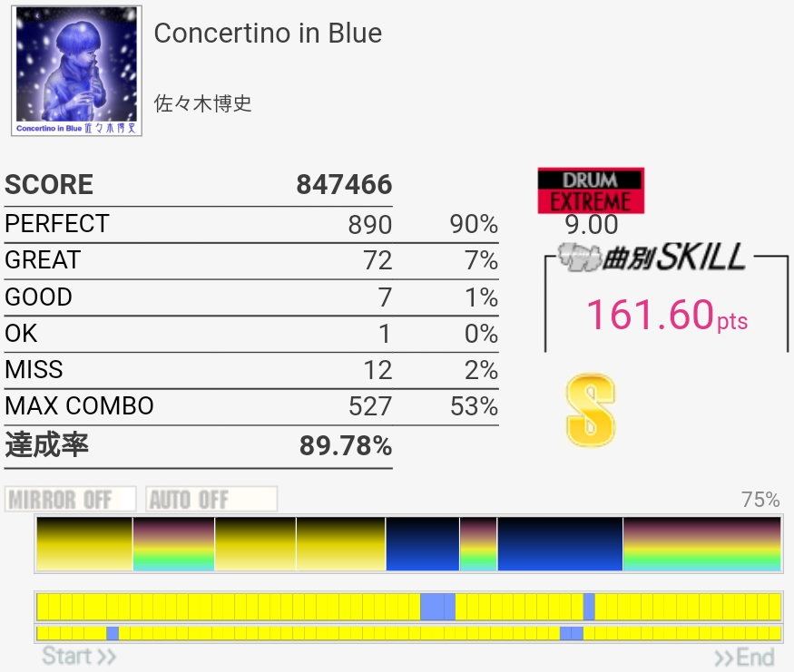 5フレーズ目手前のFT×3ドンドンドン→HT始動連打のところがよくわかってなかったけど確認したので今回は叩けた。あと序盤の一か所だけCY→FT→LT→FTになってるところ。他の部分が全然だったけど……。この曲、確認したときにかなり変拍子なことに気づいた。全然意識してなかったわ。