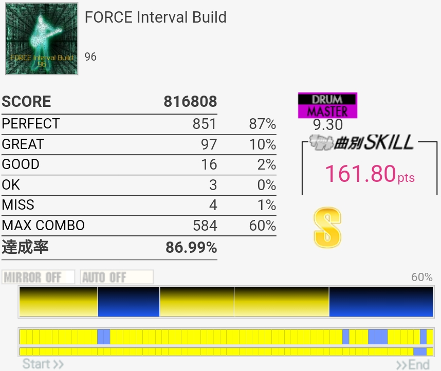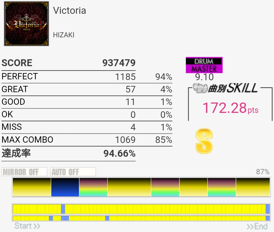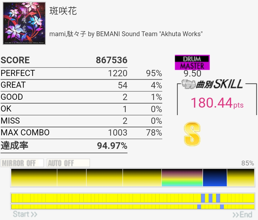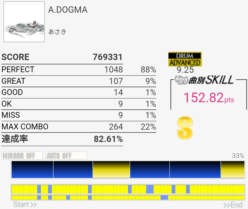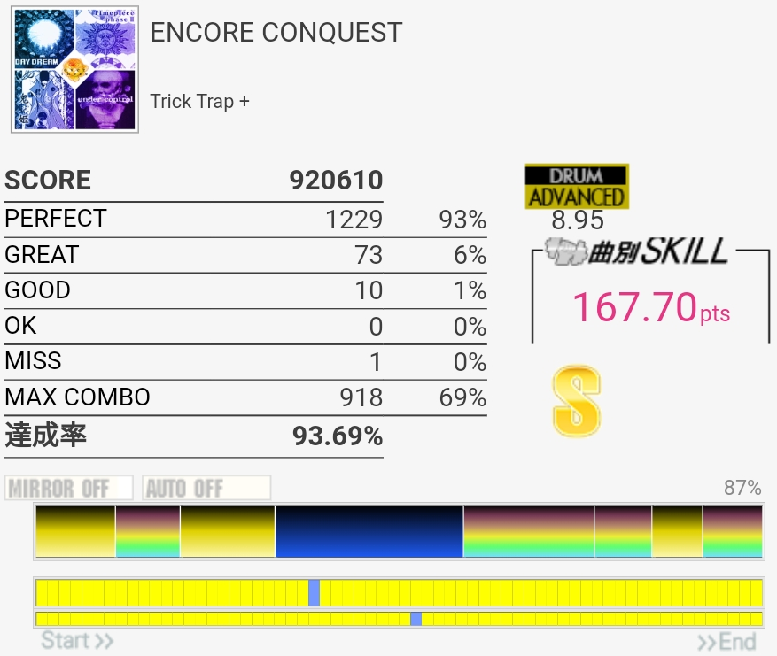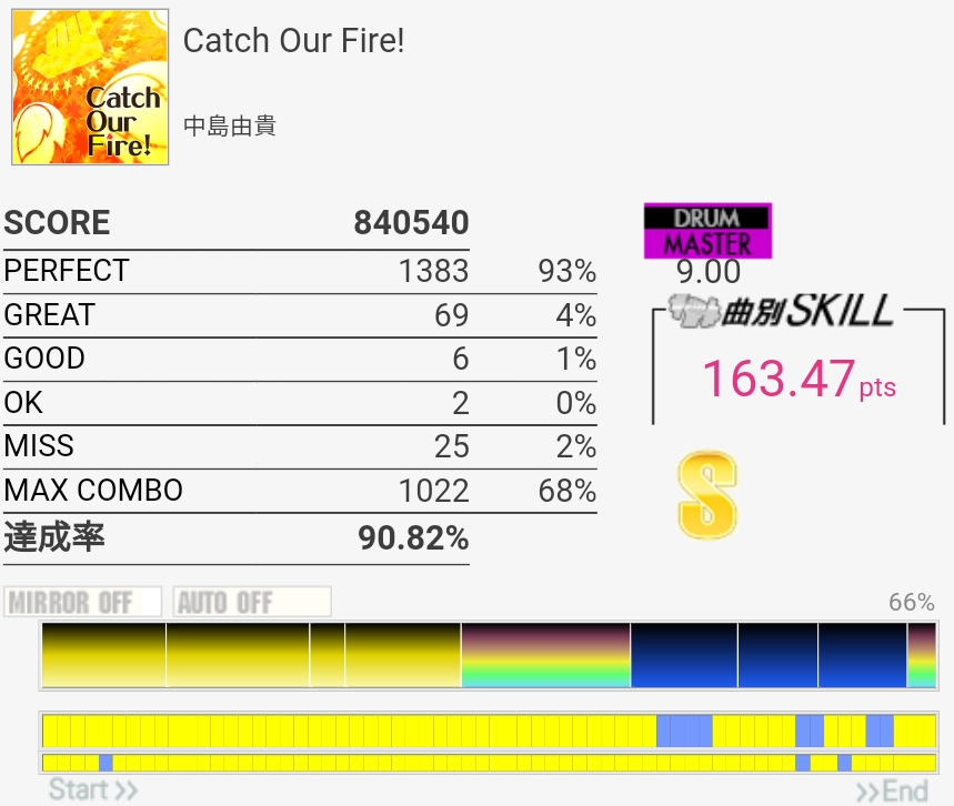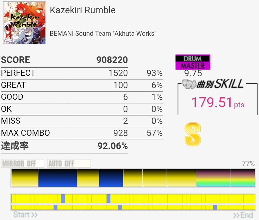 これはギリギリ180点届かなかったやつ。二連CYミスったのともう一個は……FTがなんか反応しなかったんだっけか。たぶんパッドの奥の方を叩いてた。