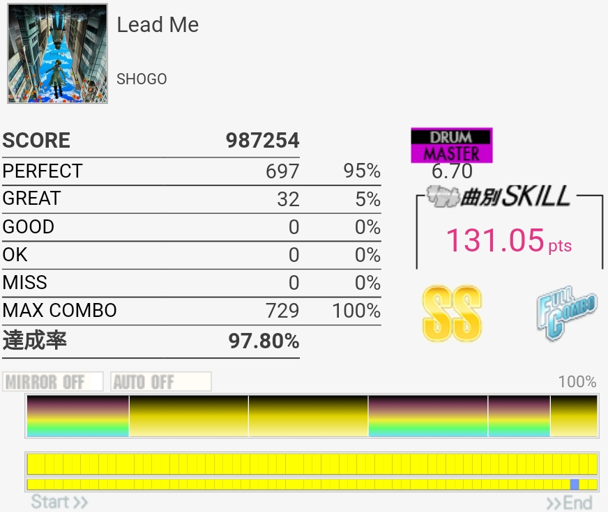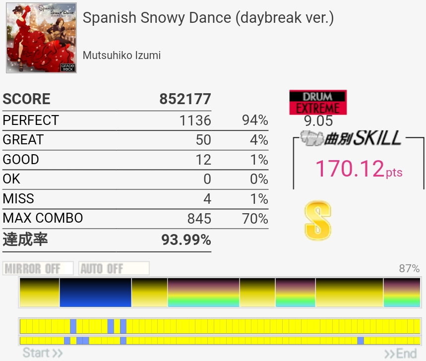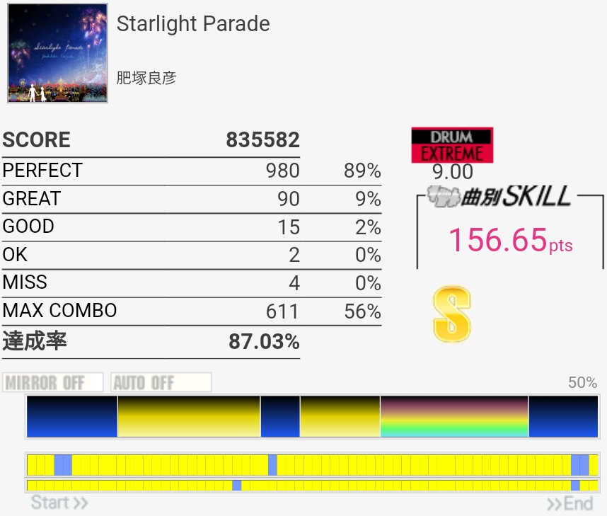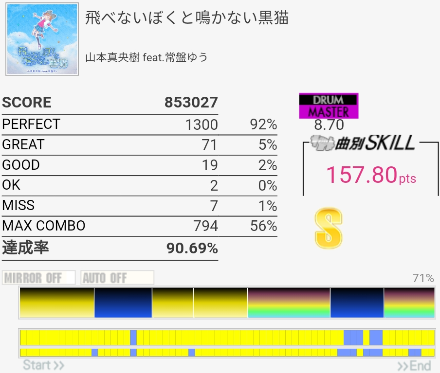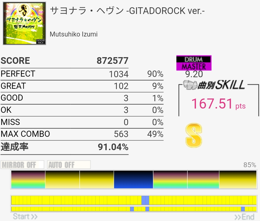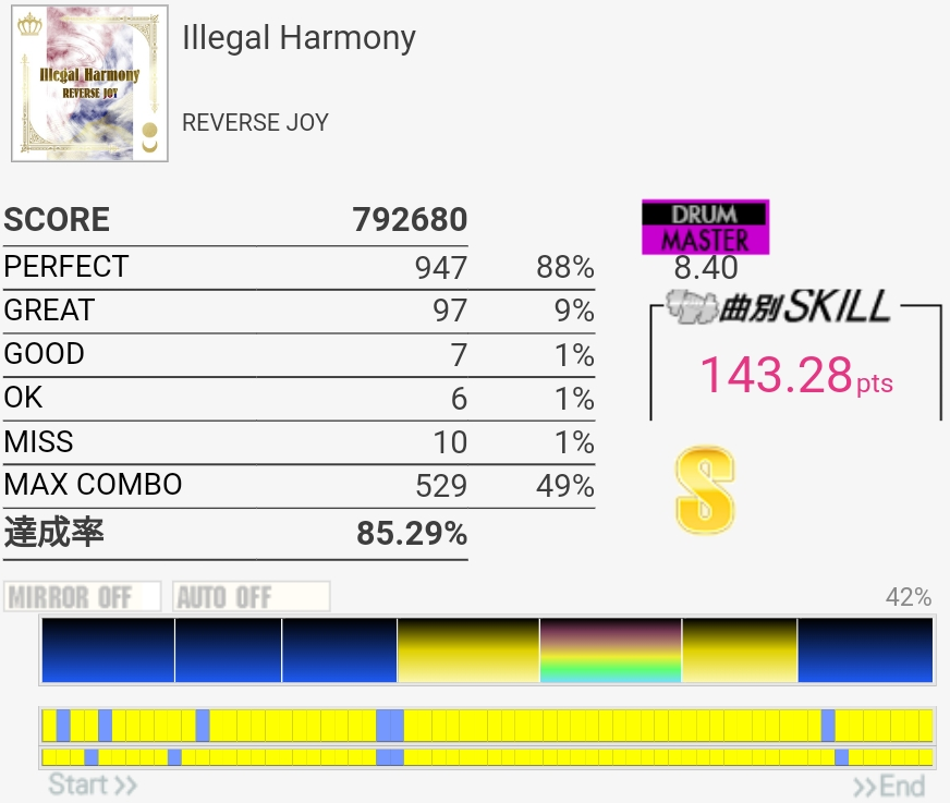 撮り忘れてたけど自己ベは87.79%。肥塚さんっぽいリズムで譜面は嫌な振り回しと入りづらい連打があってすごい苦手。真ん中らへんで難度値下がってるけどもっと高くていいと思うな。