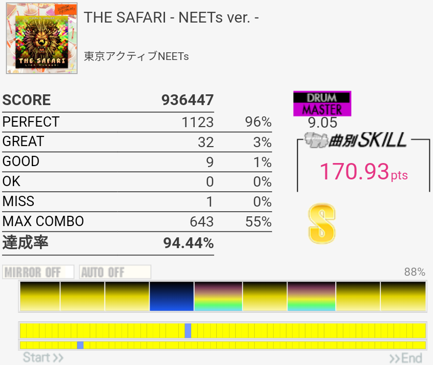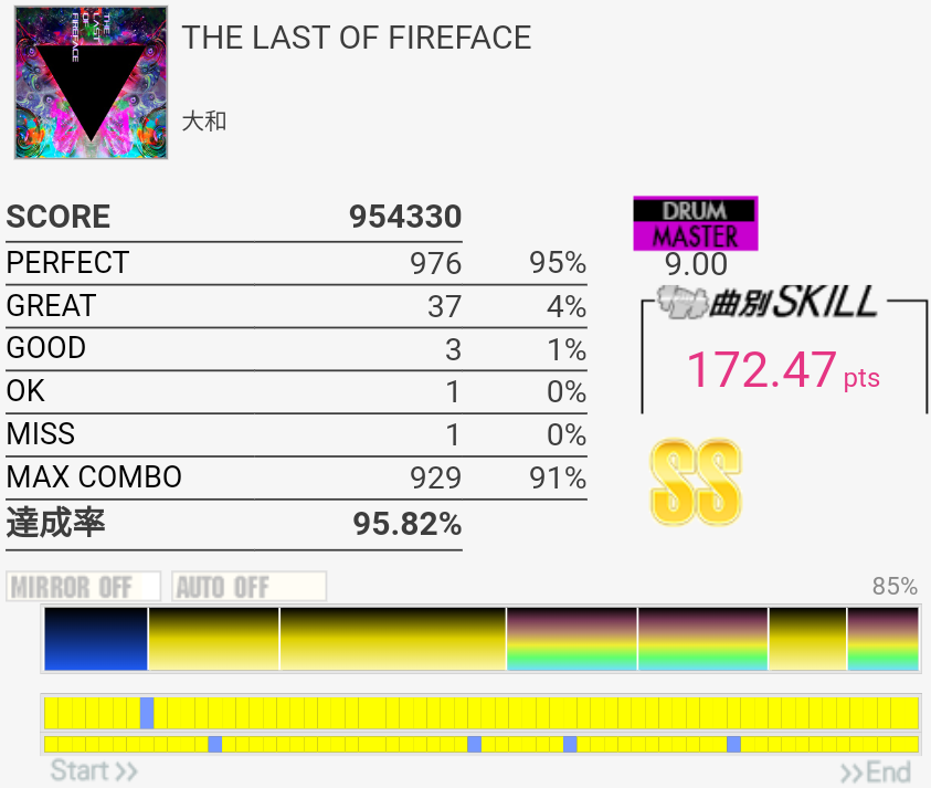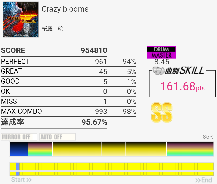 SS取得。最初のタム回し何回やっても叩けん。感覚おかしくなっててめっちゃGREATとGOOD出た……。