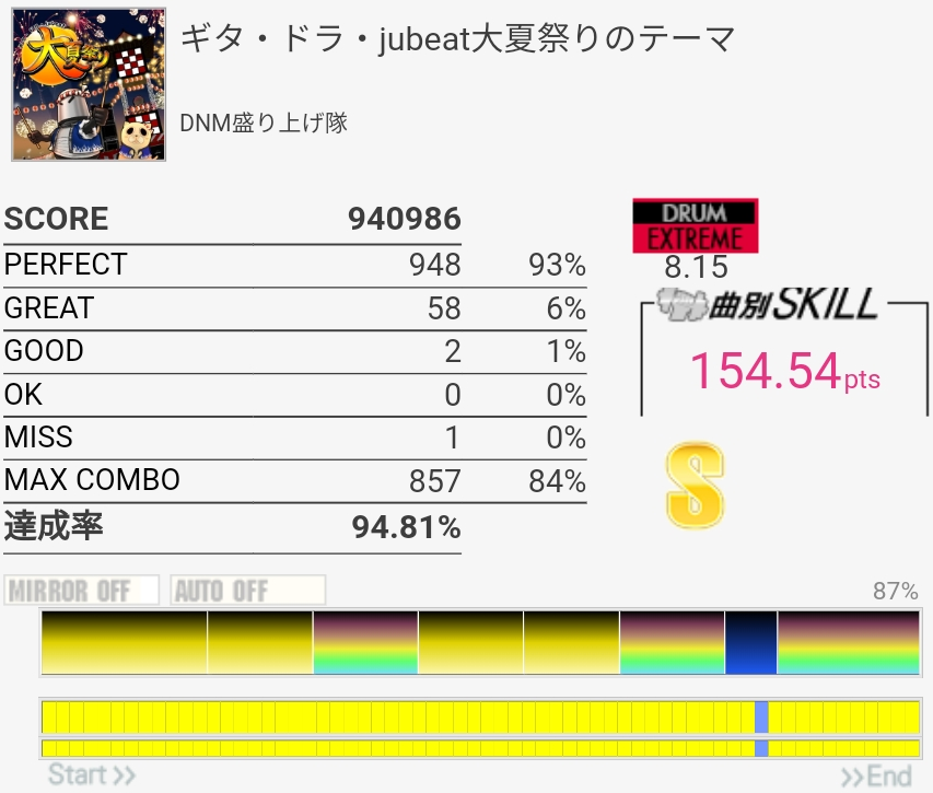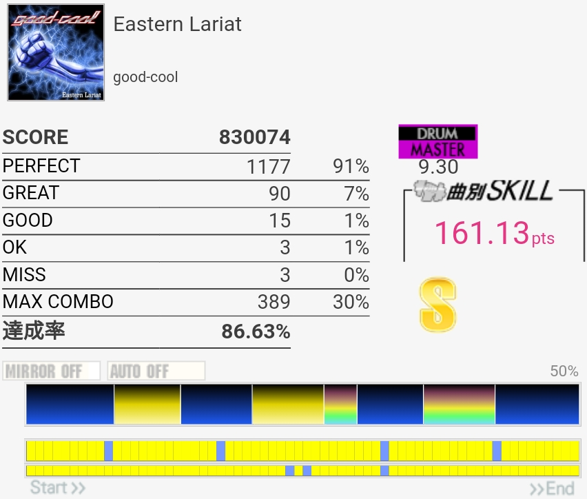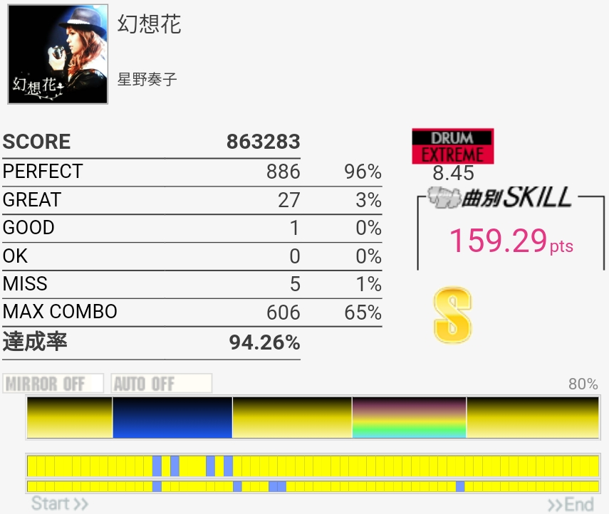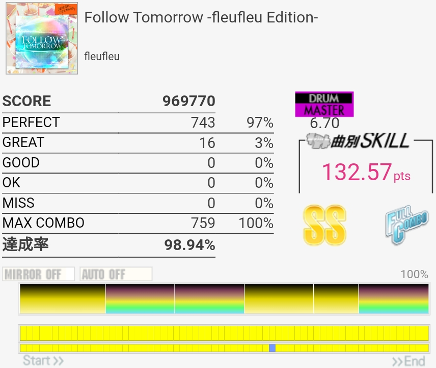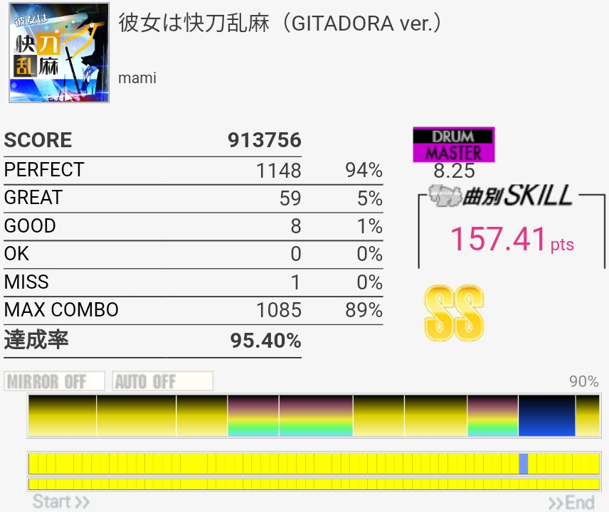 最初めっちゃ気を抜いててタム叩けなかったけどなんかSS乗った。イントロの詰まったHHは一生叩けないと思う……これ6.90とかだったんだよね。