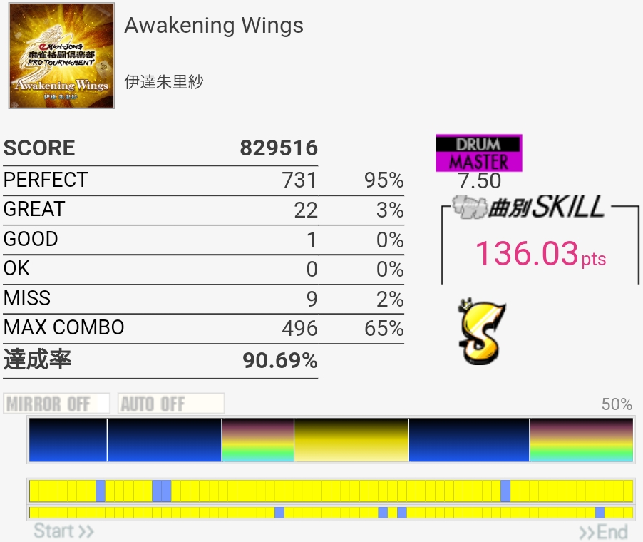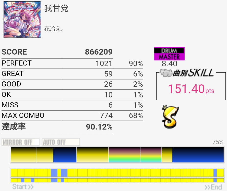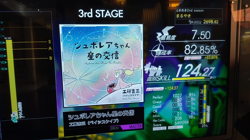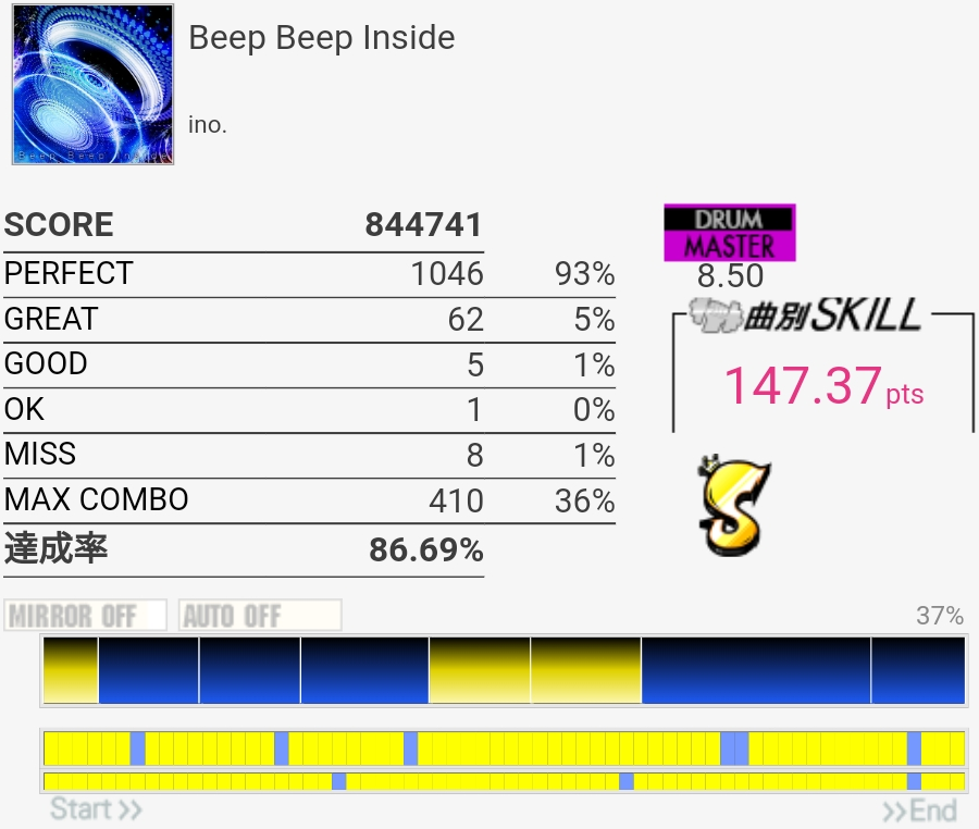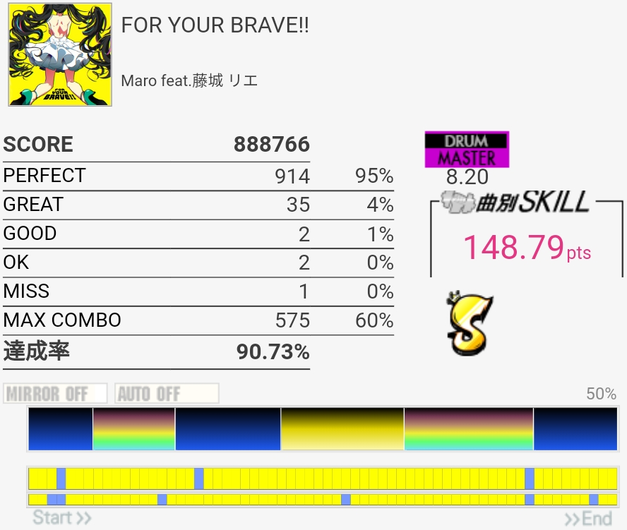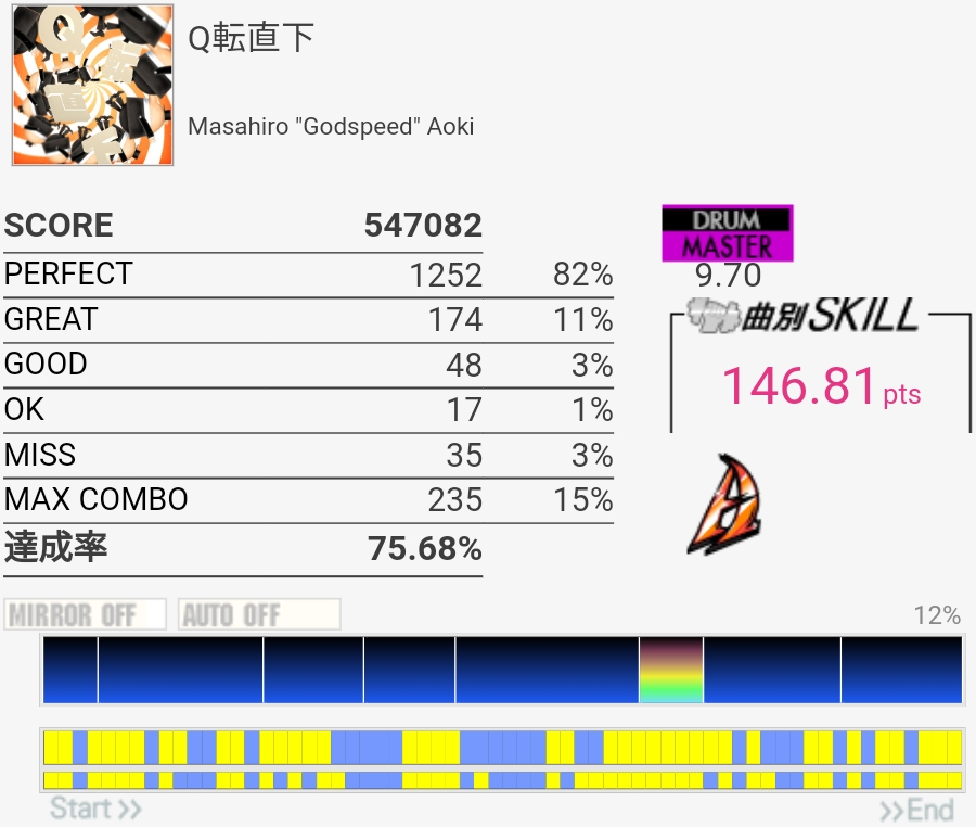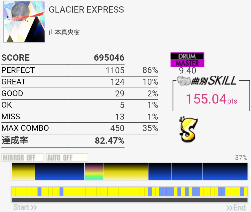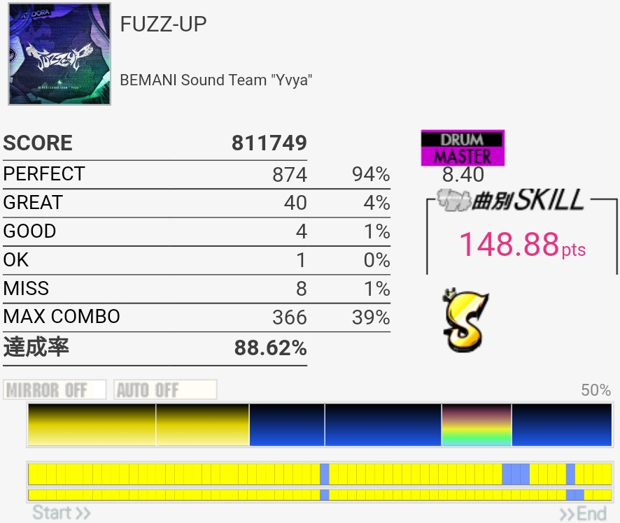 三連譜ツーバスやら後半のプログレ地帯が全然わかってないけど遅いからなんとかなってるみたいだ。コンボカッターになってる部分の形を全然覚えてない……。