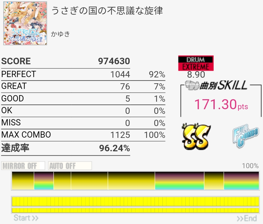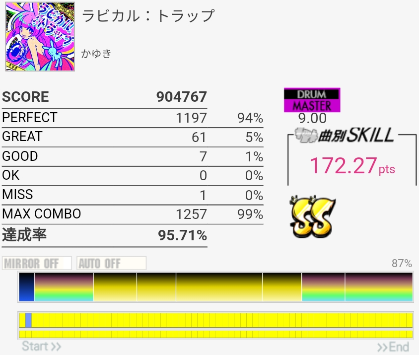 なんでこれこんな上がってんの???前のレベルで妥当かちょっと逆詐称だと思うけど……これも譜面忘れててパフェ率終わってるけど171点取れてればいいか。