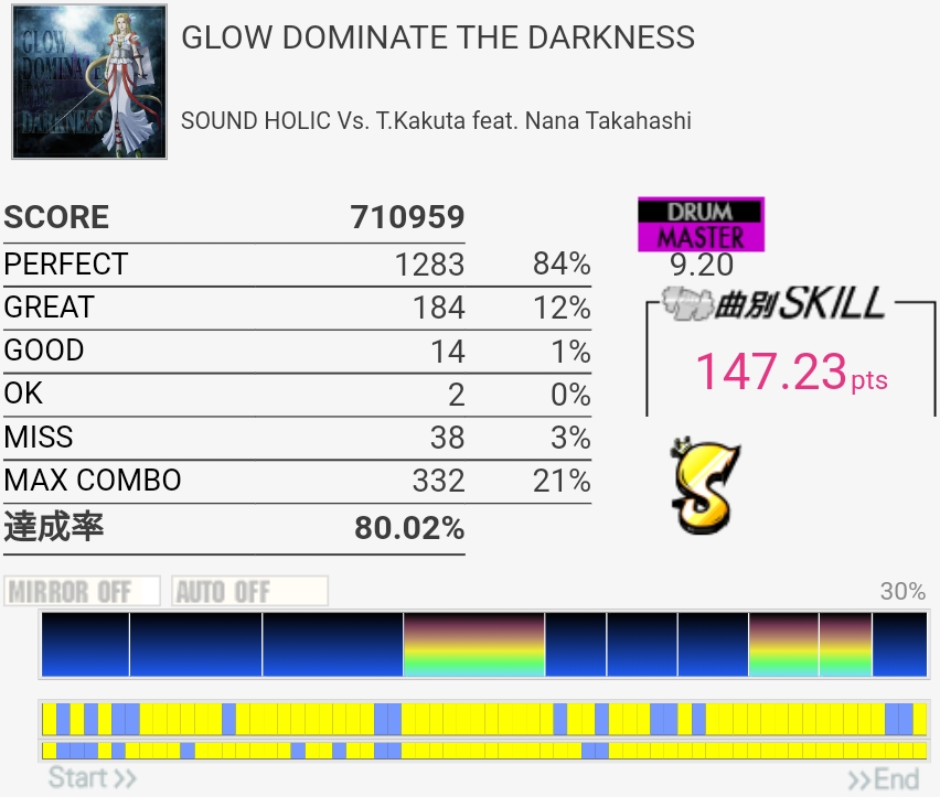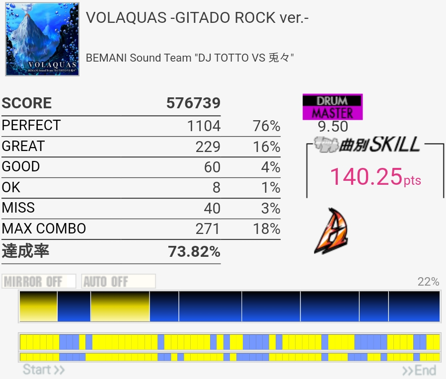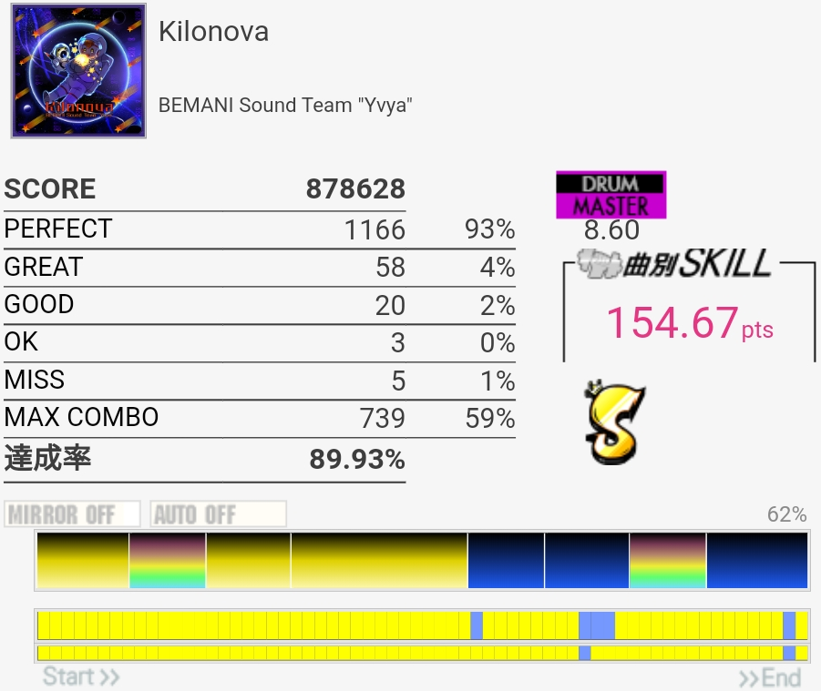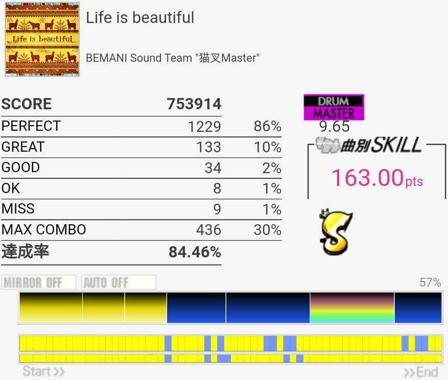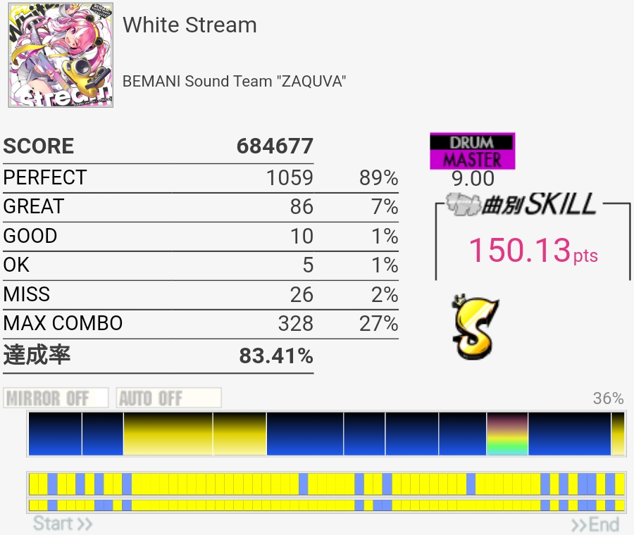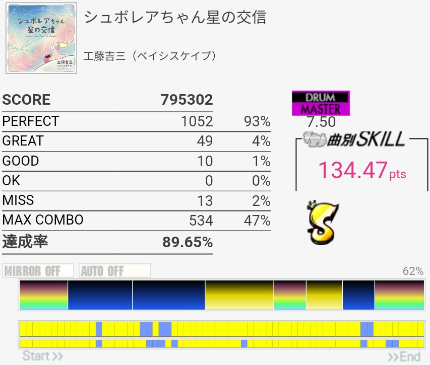 繋がりはすると思う。前半は裏SN左手で取るのがちょっとキツいしLT×2がなんか反応しづらい……ちゃんと叩けてないのだとは思う。たぶん一番気をつけなきゃいけないのは三連譜CY×4かな……。