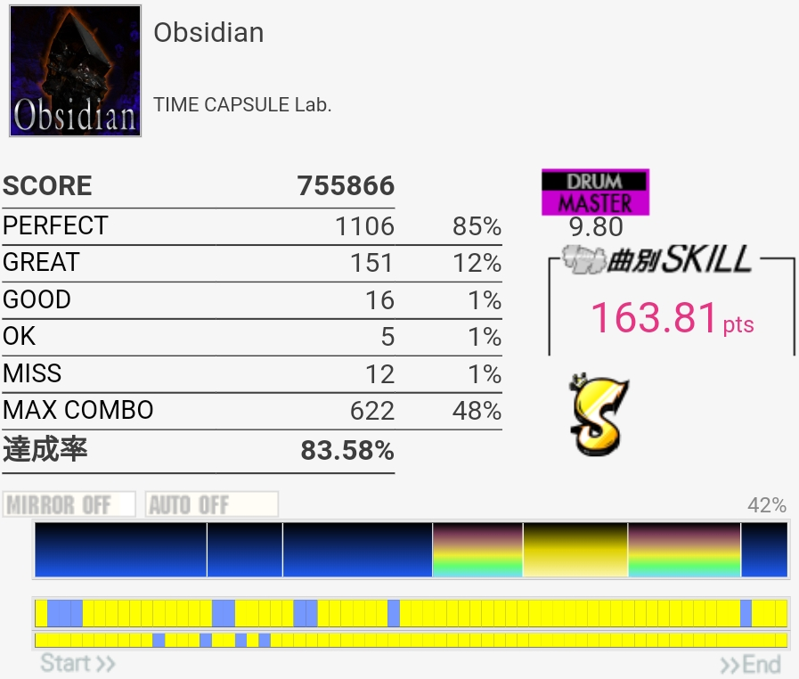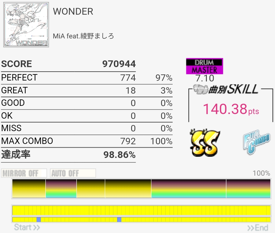 SS取得。5フレーズ目終わりのFT×2からの裏バス?で毎回BP早く踏んじゃう。曲もジャケットも好きなのに譜面が難しいのがつらい。