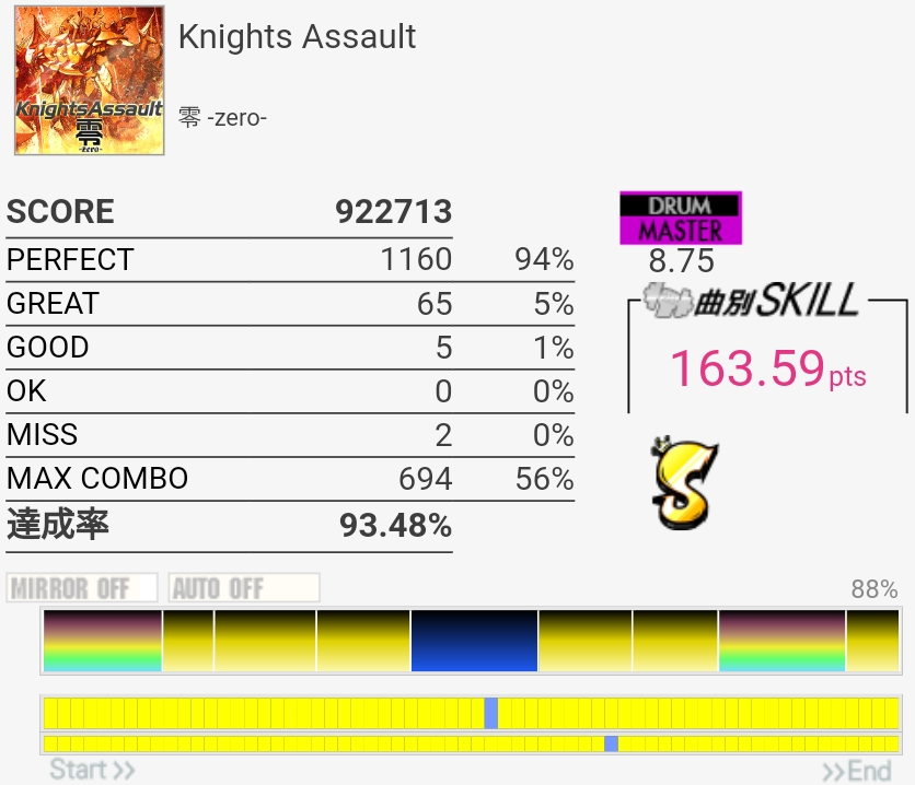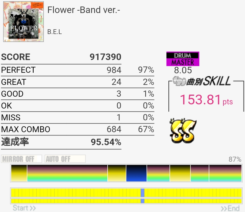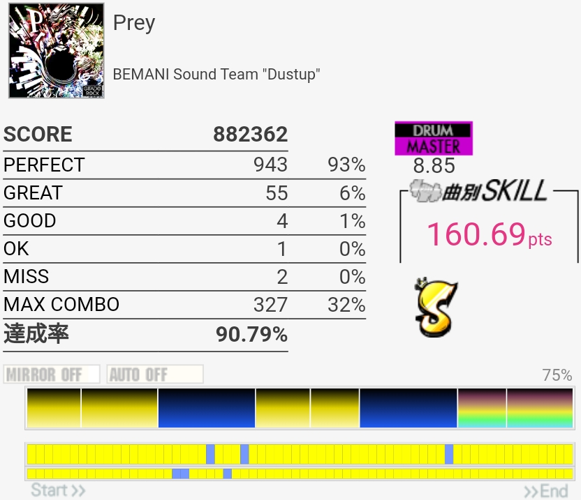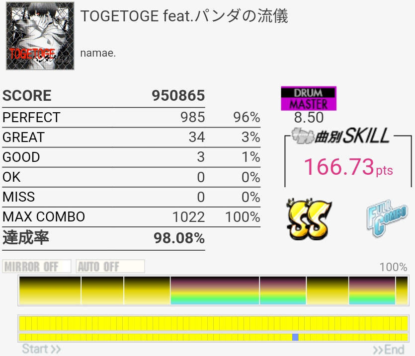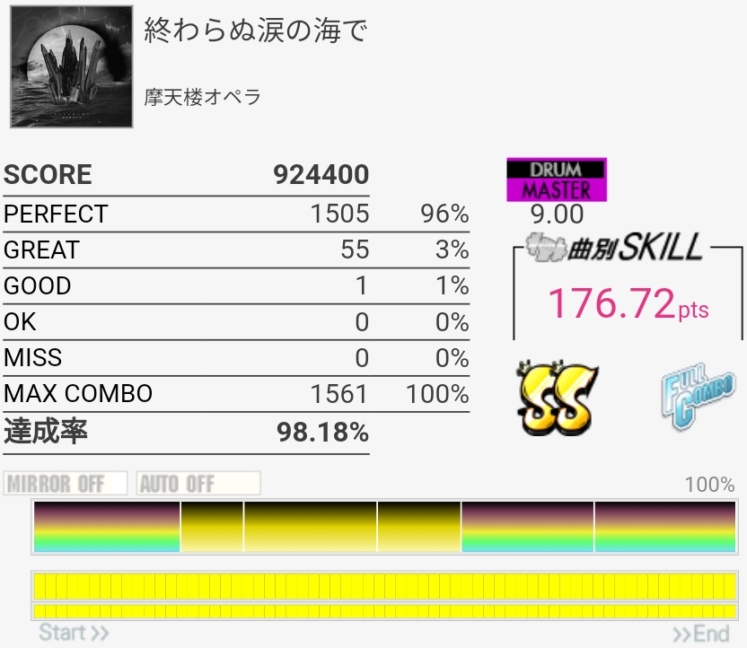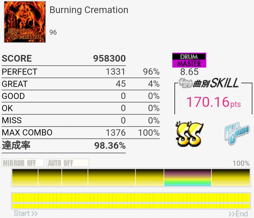 SS取得。Bメロ入るところの3個フィルを覚えてなくて叩けなかった。でもサビ前のフラム混じりSNと振り回しをちゃんと叩けたからオッケー。初めてかも。