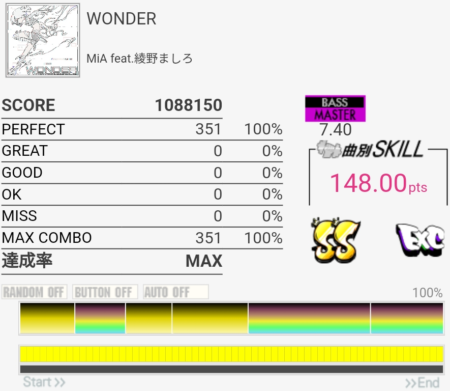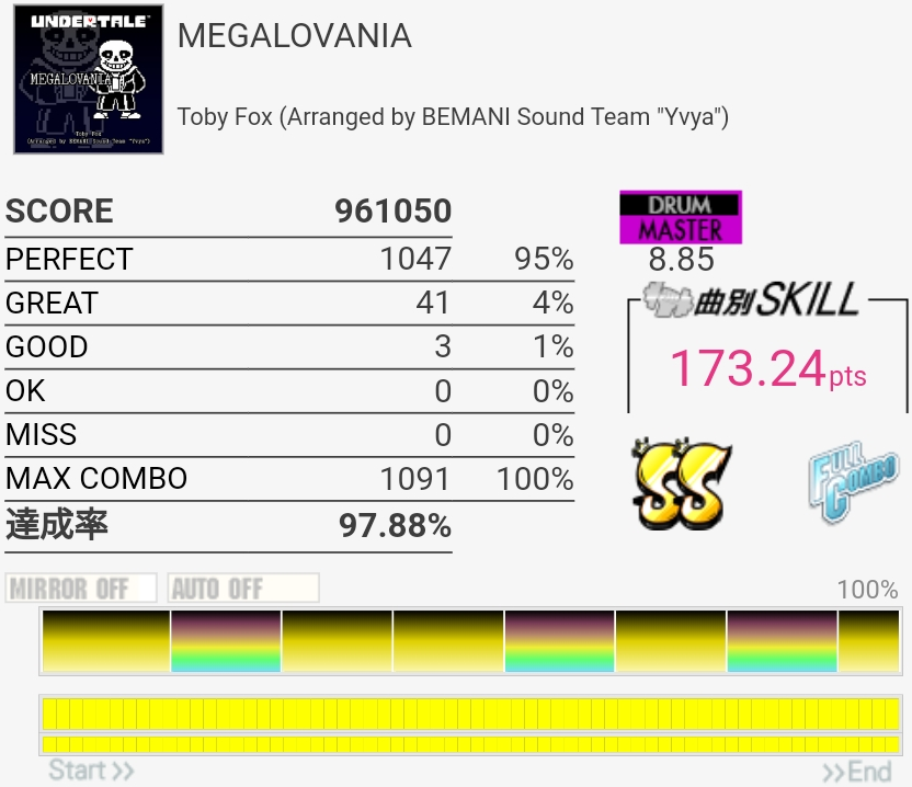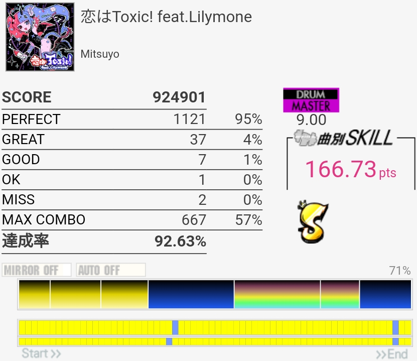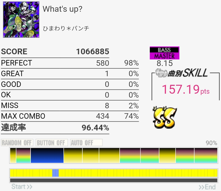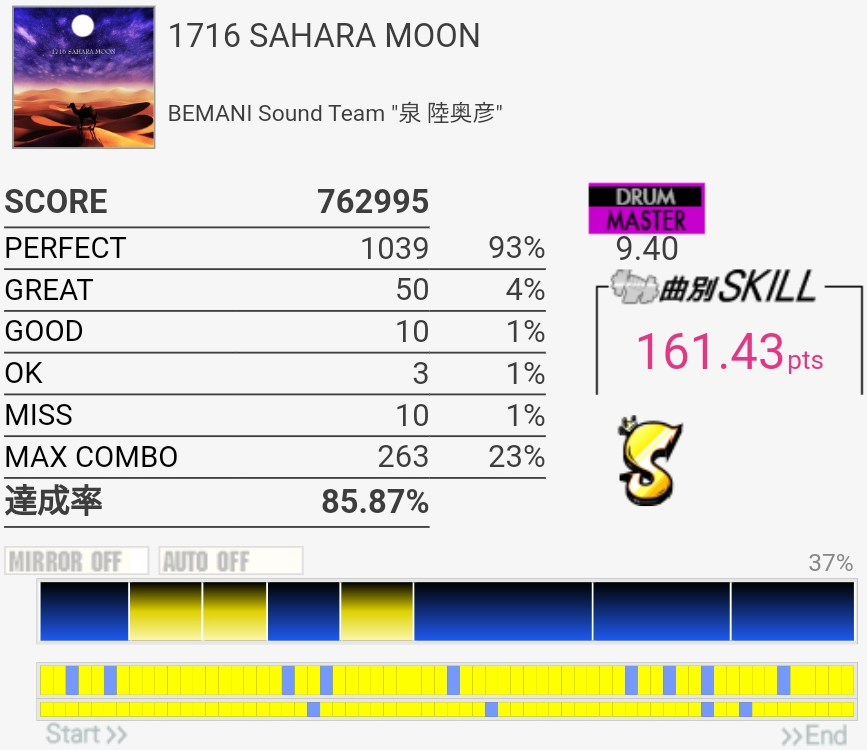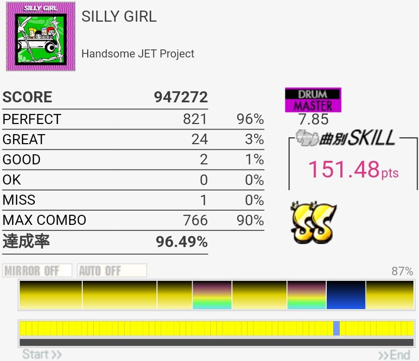SS取得。Bメロ入るところの3個フィルを覚えてなくて叩けなかった。でもサビ前のフラム混じりSNと振り回しをちゃんと叩けたからオッケー。初めてかも。