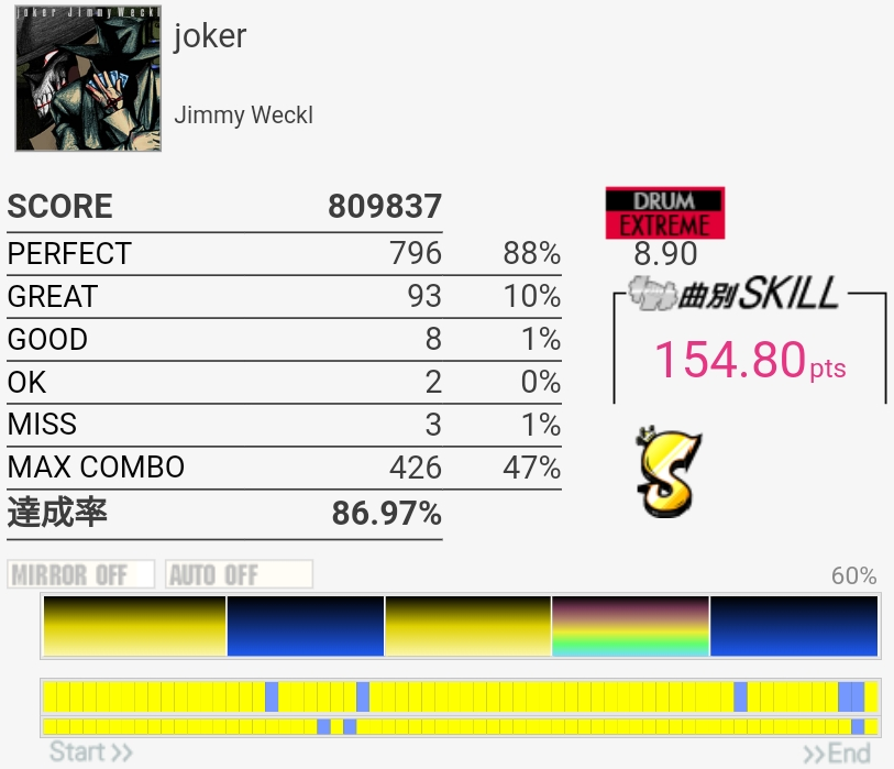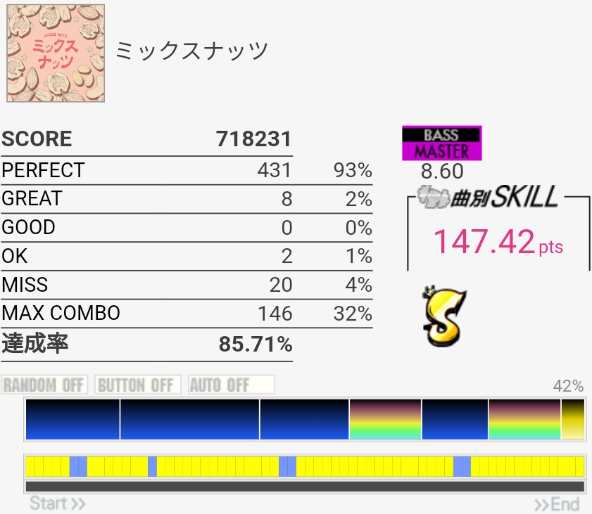 前半は感覚が全然合わなくてパフェ率終わってた……でもだいたい叩けてるんだよな。CY連打の調子は良かったと思う。