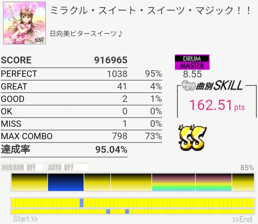 男性ボーカル曲もカッコよくていいっすね。譜面的には8.50の密度じゃないというかせいぜい7.70くらいでは?裏バス部分次第だけど。1切りの時はパフェ率98%でGOODなしだったんだけどこの現象何なんでしょうね。