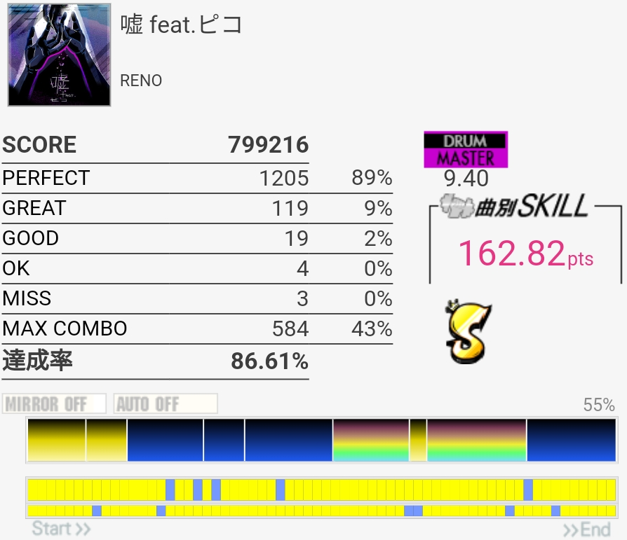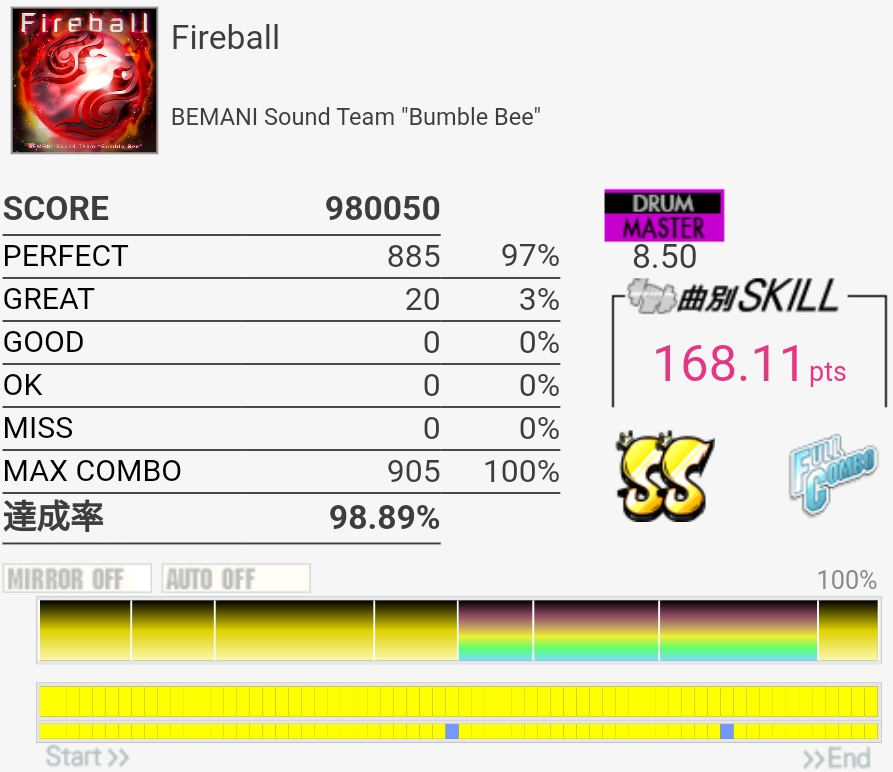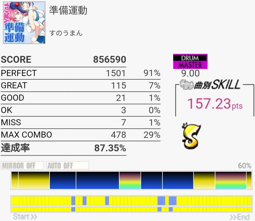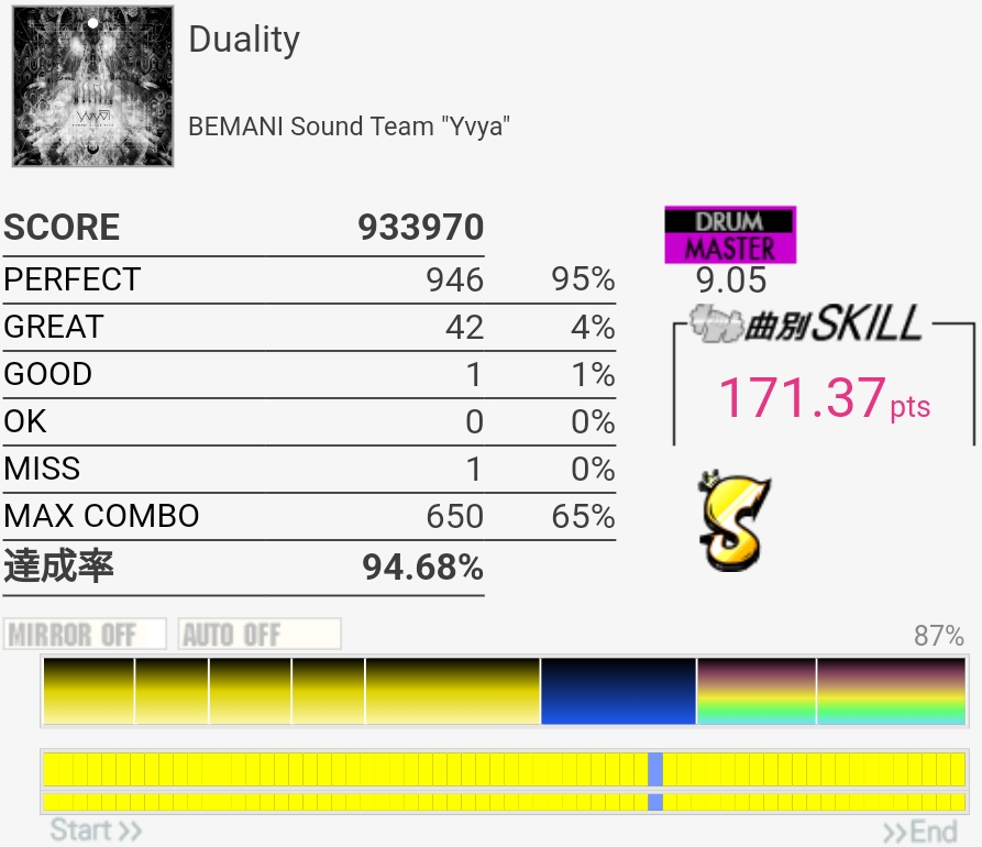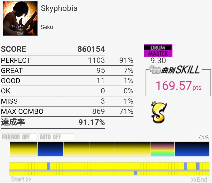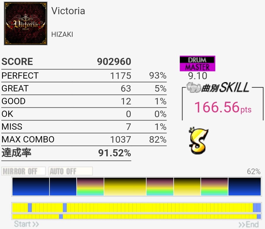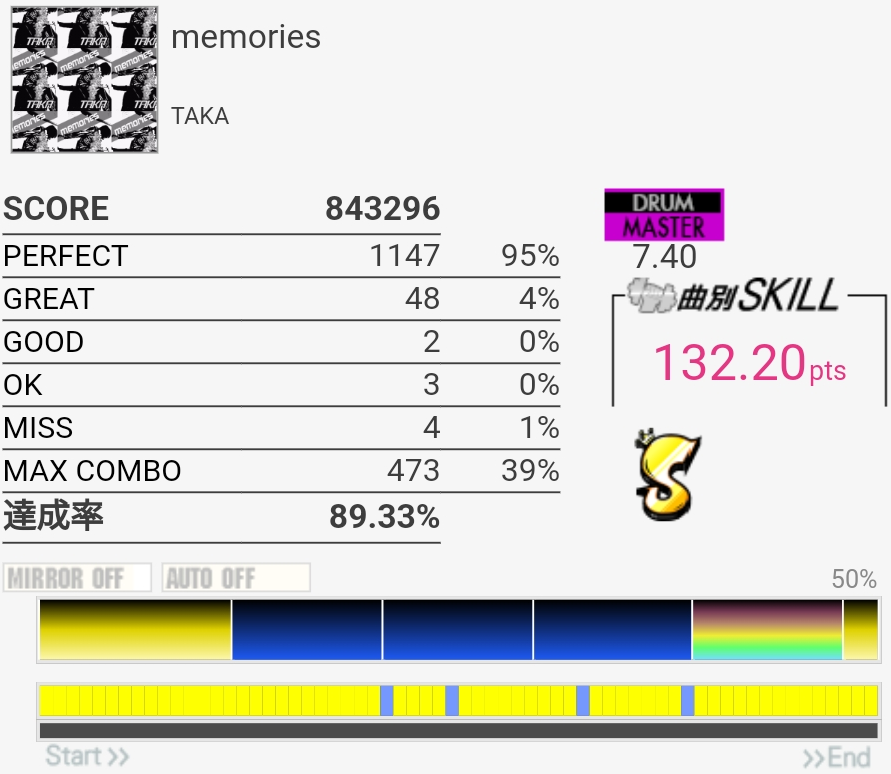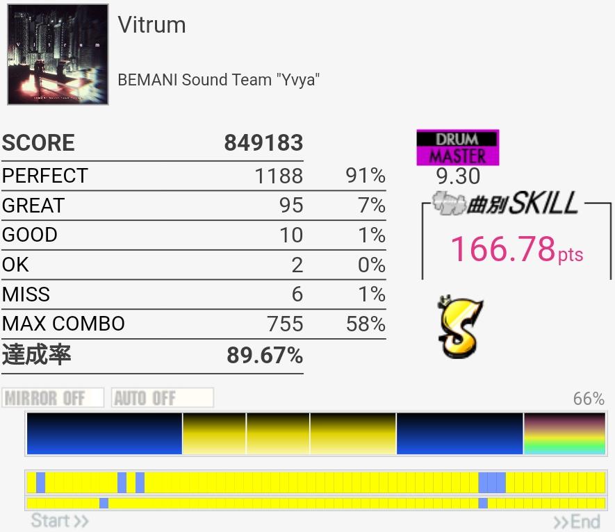 やってるときは必死だけど意外とミスしてなかった。真ん中の三連符LT×2→FT×2が絶対入らないから辛すぎる。後半がんばって足を動かしてたら左足の「押し方」をちょっと思い出せた気がするな。腰をやってから絶対踏み方が変になってるから少しずつ直したいし、ツーバス曲から逃げてはいけない。