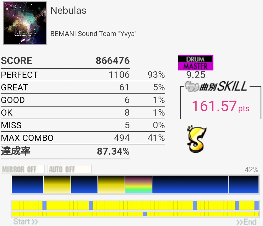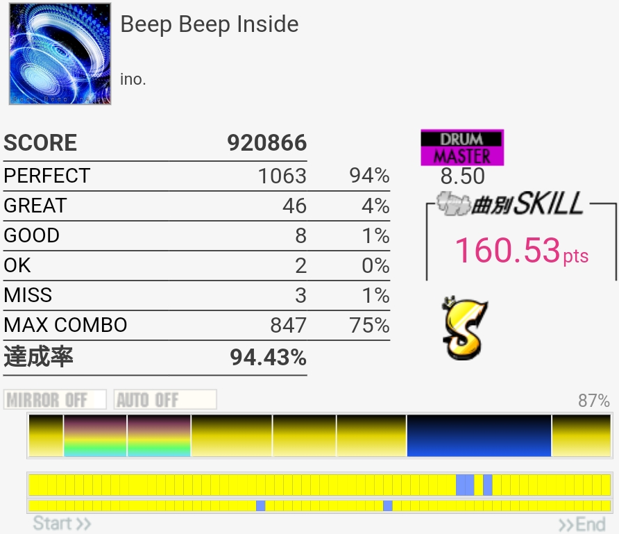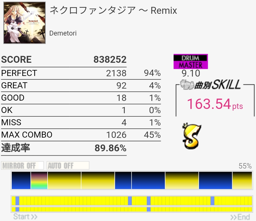 いやこれ8.90だよ。あんまり叩かせる気が感じられない配置……パフェ幅広いのとBPMそんなに速くないとはいえ。ちゃんと確認したら普通に回せる配置なのだろうか。