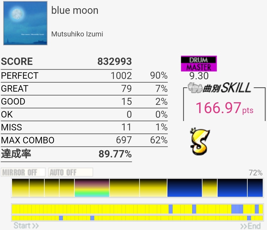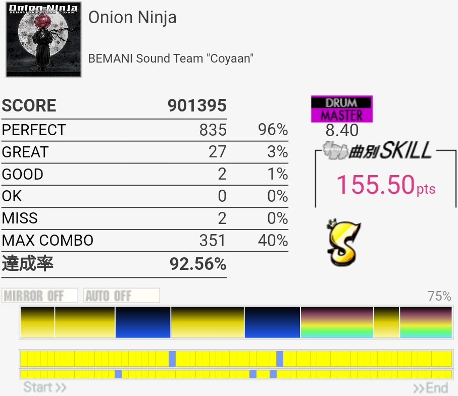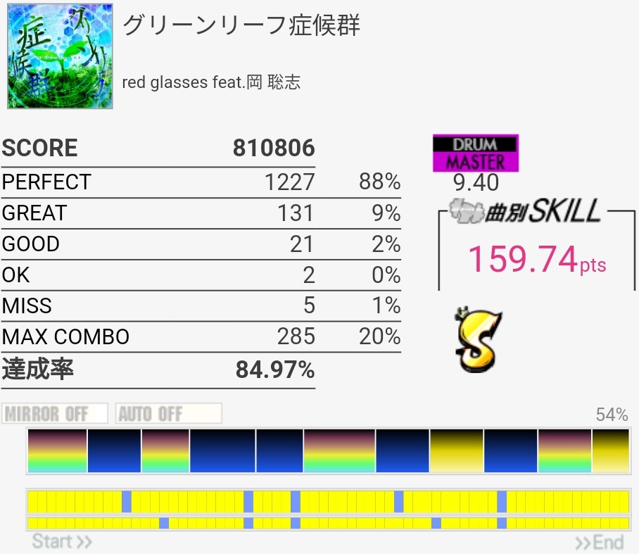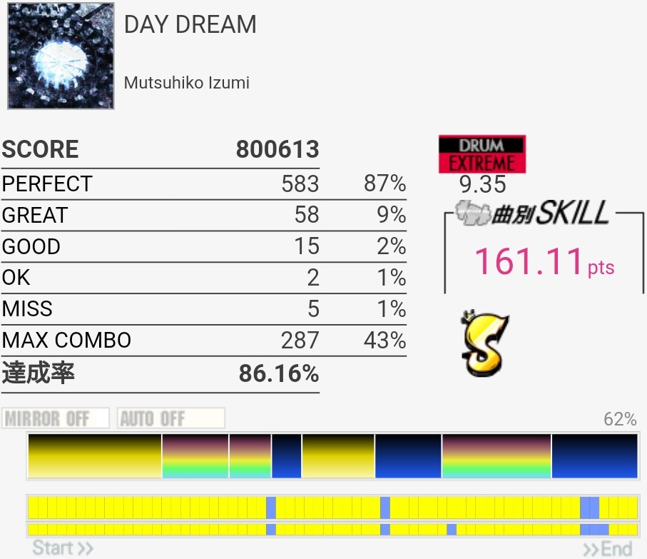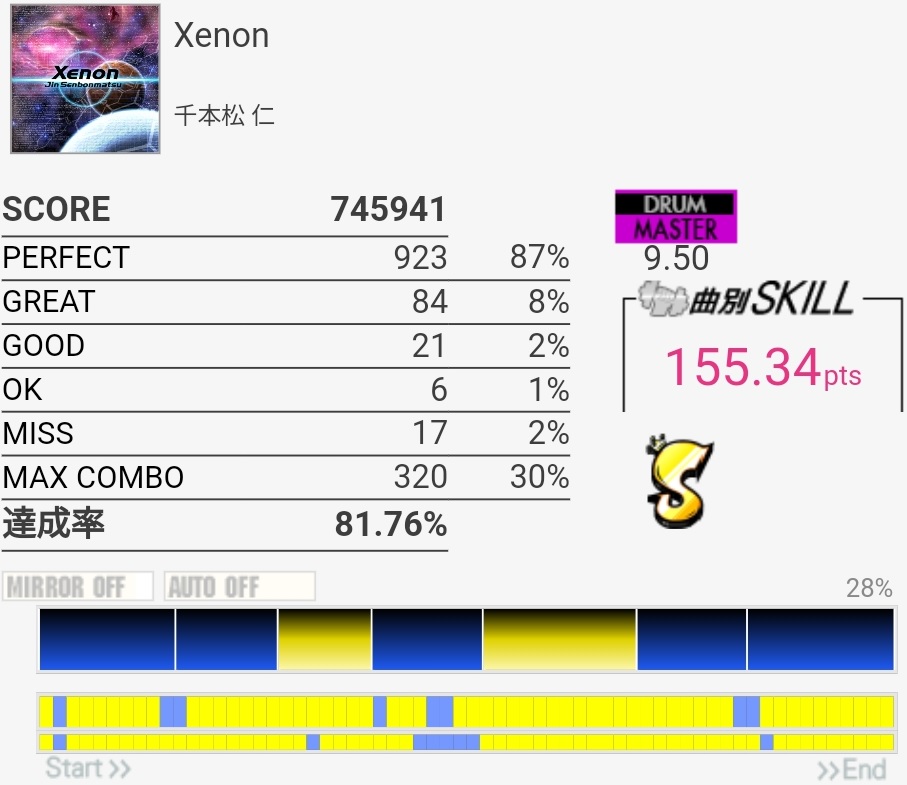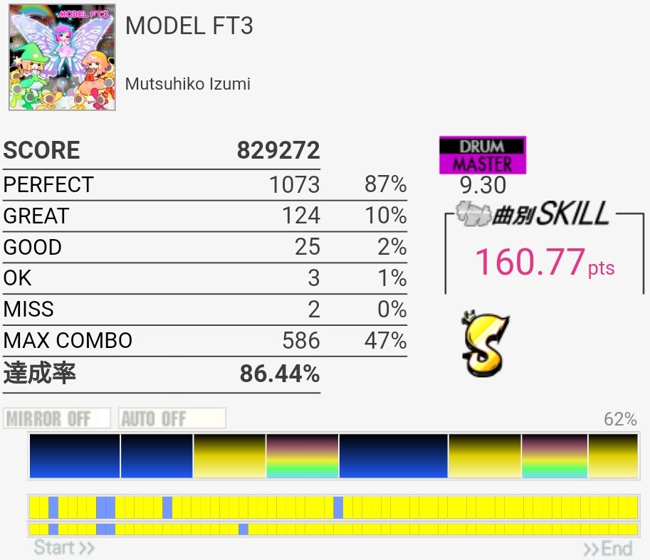 特に書くことなし……調子は悪くないはずなんだけど急に譜面が認識できなくなることがあって、集中力がないのか画面反射のせいなのかとにかく凡ミスが多い。