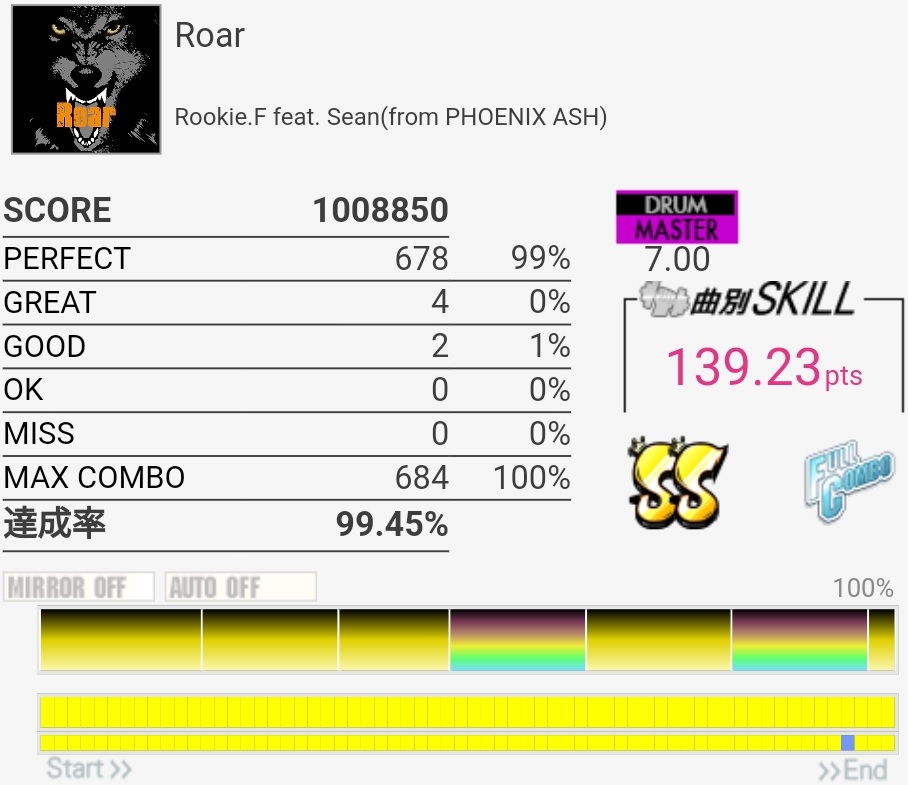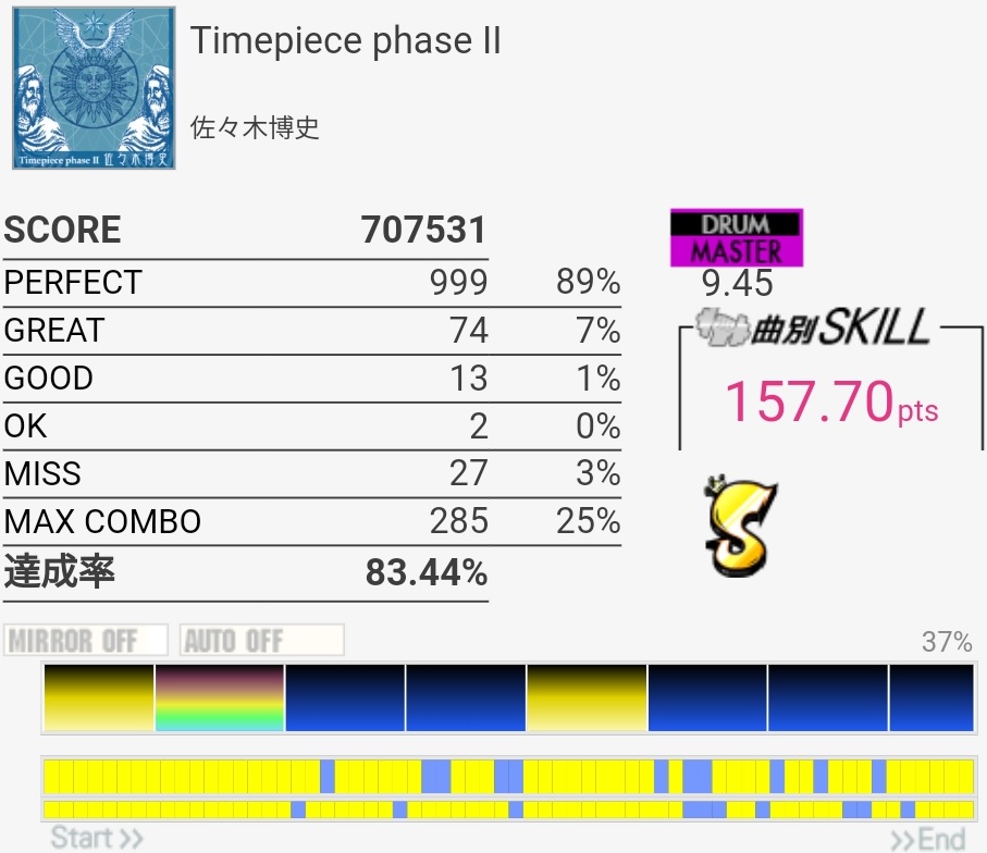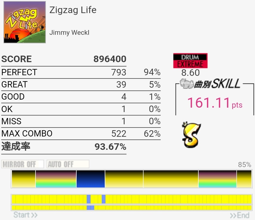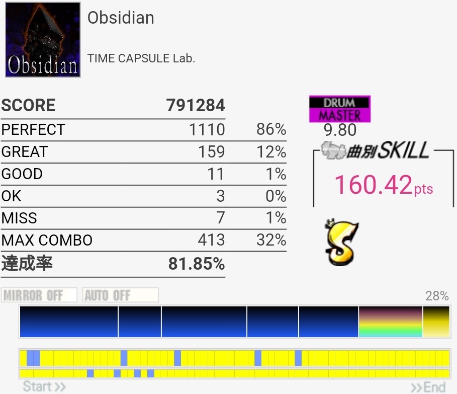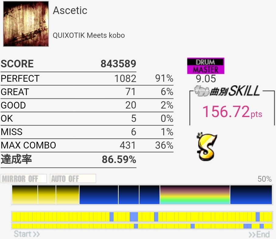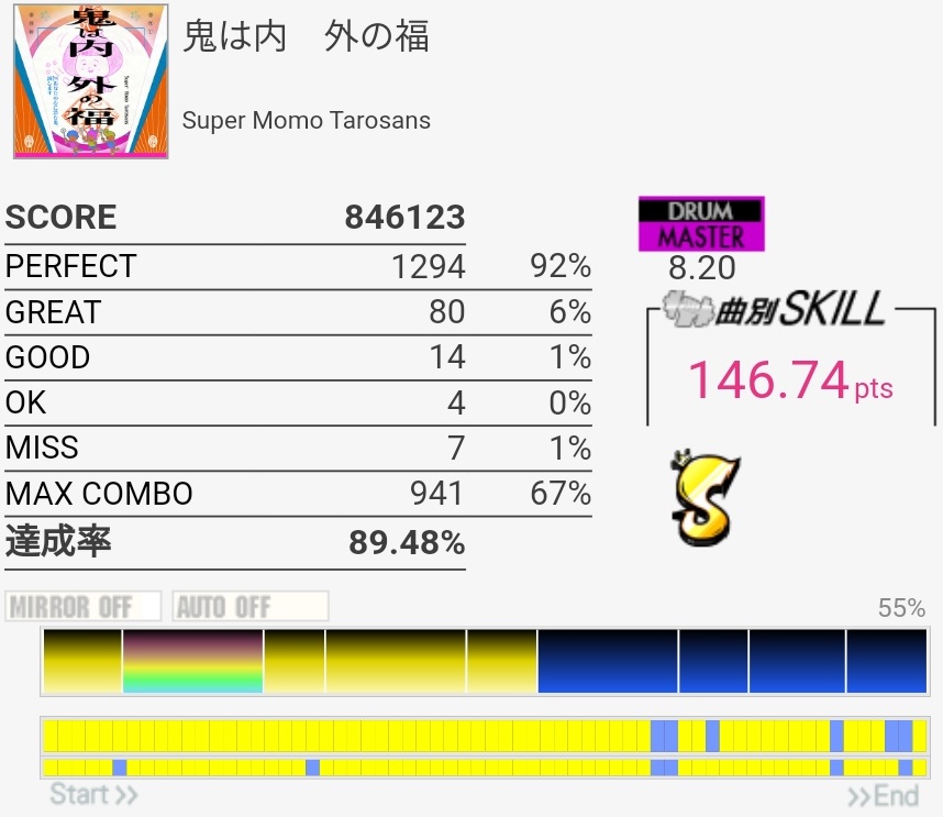 特に書くことなし……調子は悪くないはずなんだけど急に譜面が認識できなくなることがあって、集中力がないのか画面反射のせいなのかとにかく凡ミスが多い。