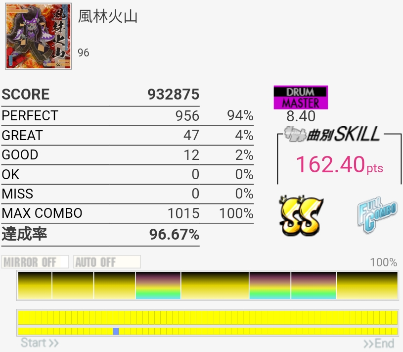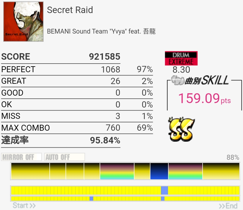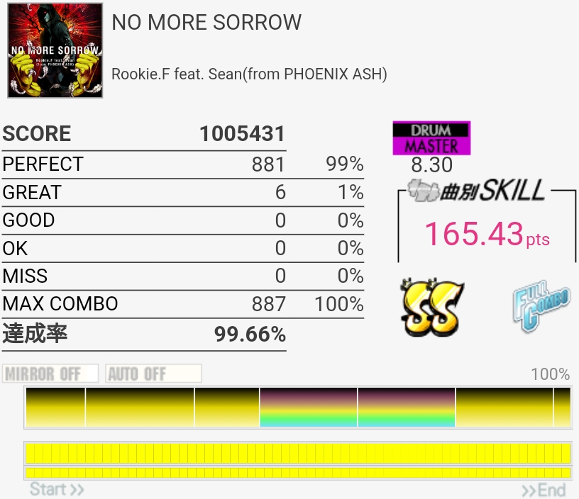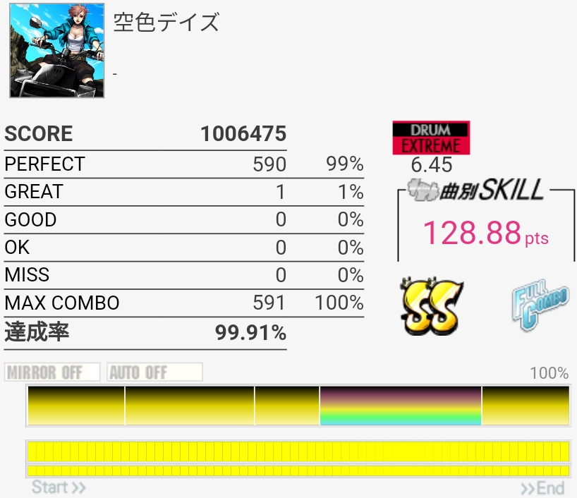 タムがなんか反応しなかったんだったかな?ちゃんと叩けてないのかはわからん。前半の足がいまいち速さ合わなくてGREAT量産しちゃう。たこ焼きとかもそう。