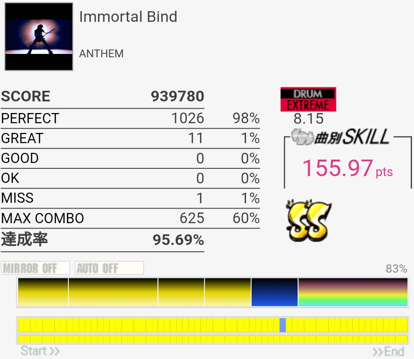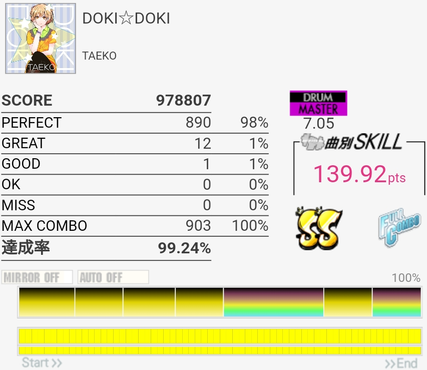 やっぱ8台後半の新曲が来るとスキル上げやすいね。あと10曲くらい来てくれ。