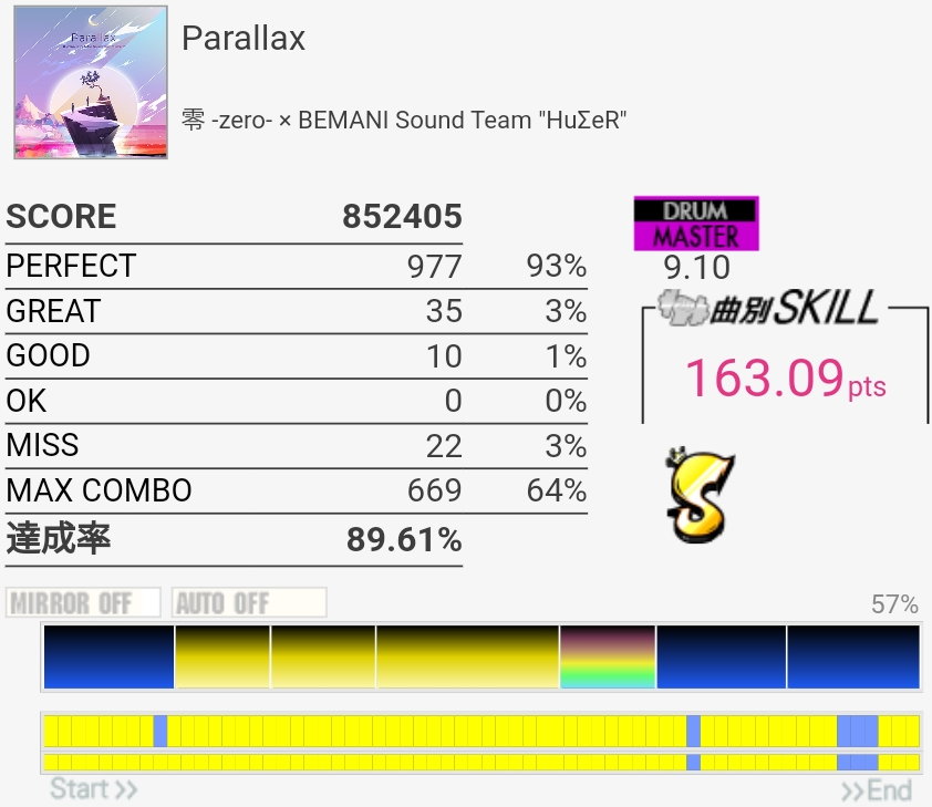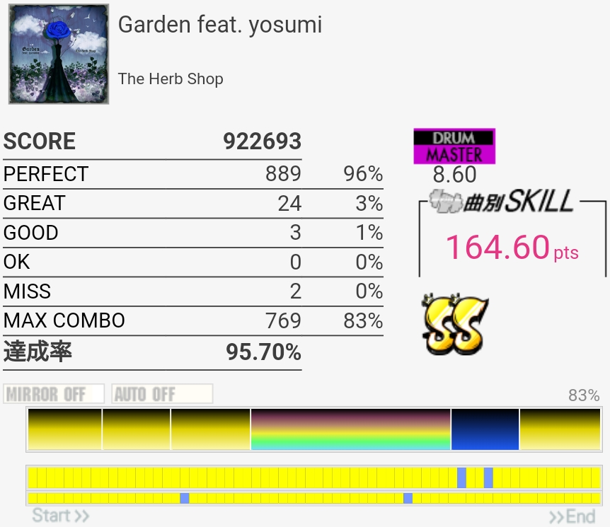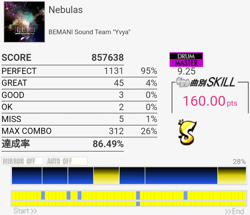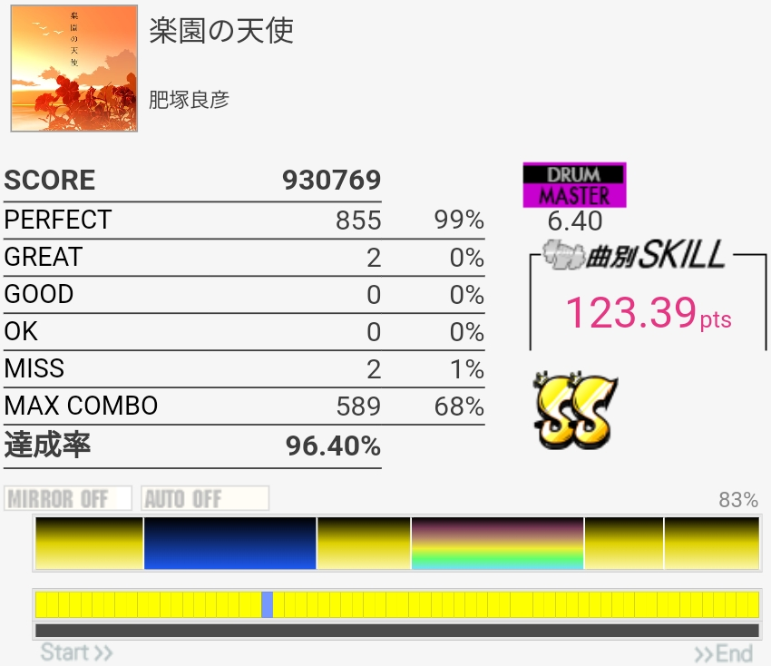 3個タムが全然入らなかったけど比較的パフェ率よかった。これでもうちょいフレーズ取れてればなあ。
