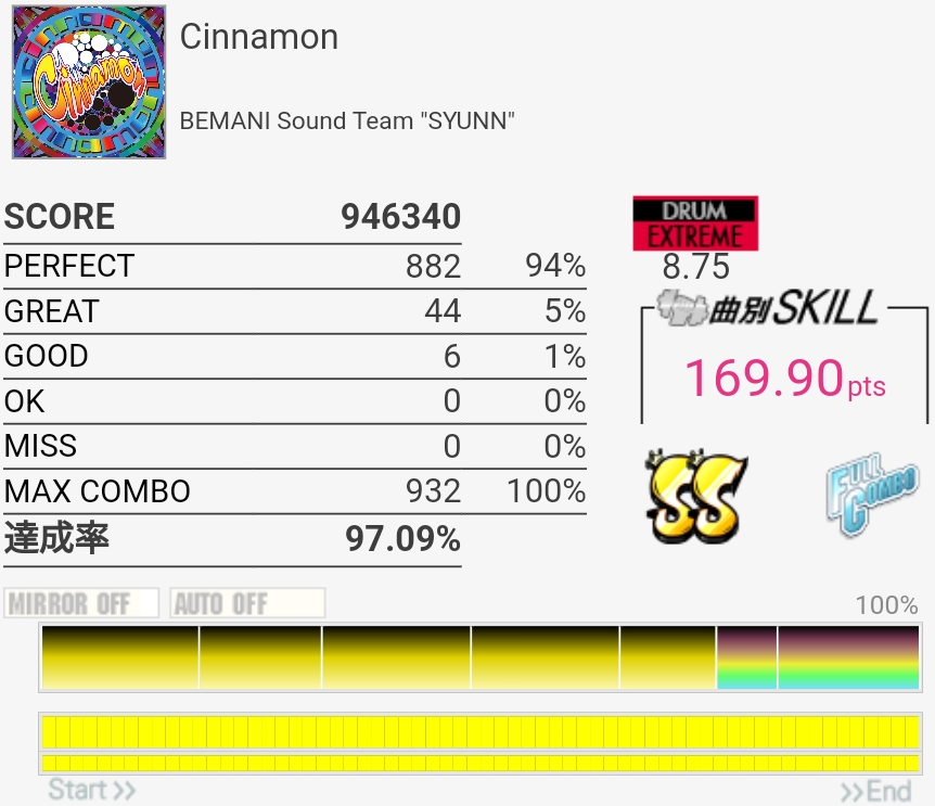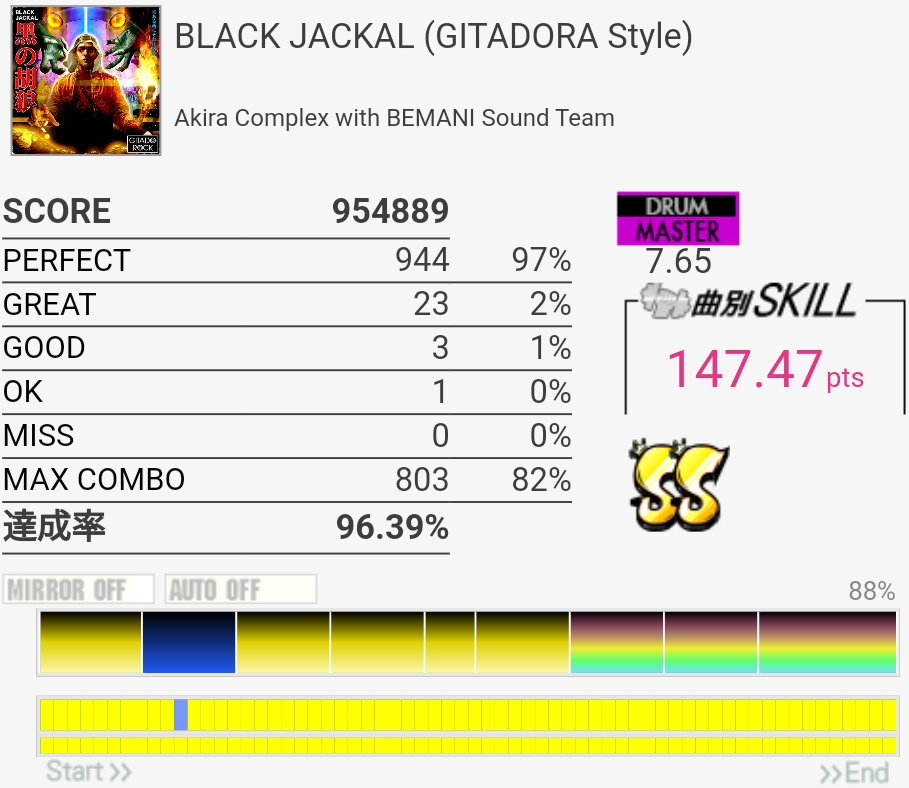 フルコンしたけど精度が……最初と最後の足がよくわかってなくてGOODまでズレるんだよね。中盤もちょっと崩れかかったからもったいないね。