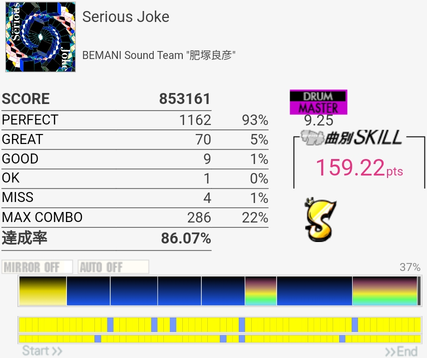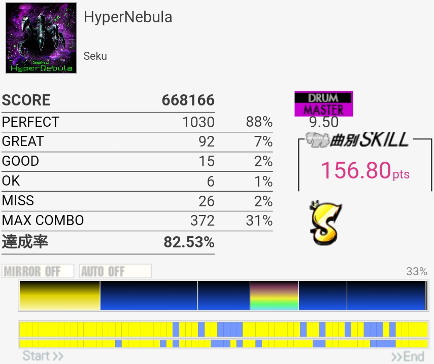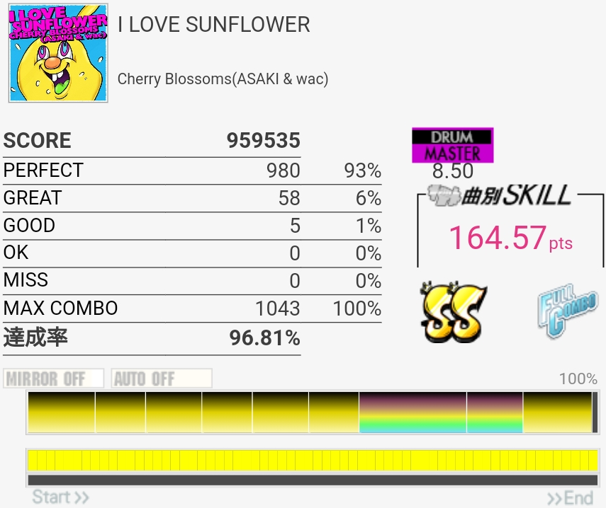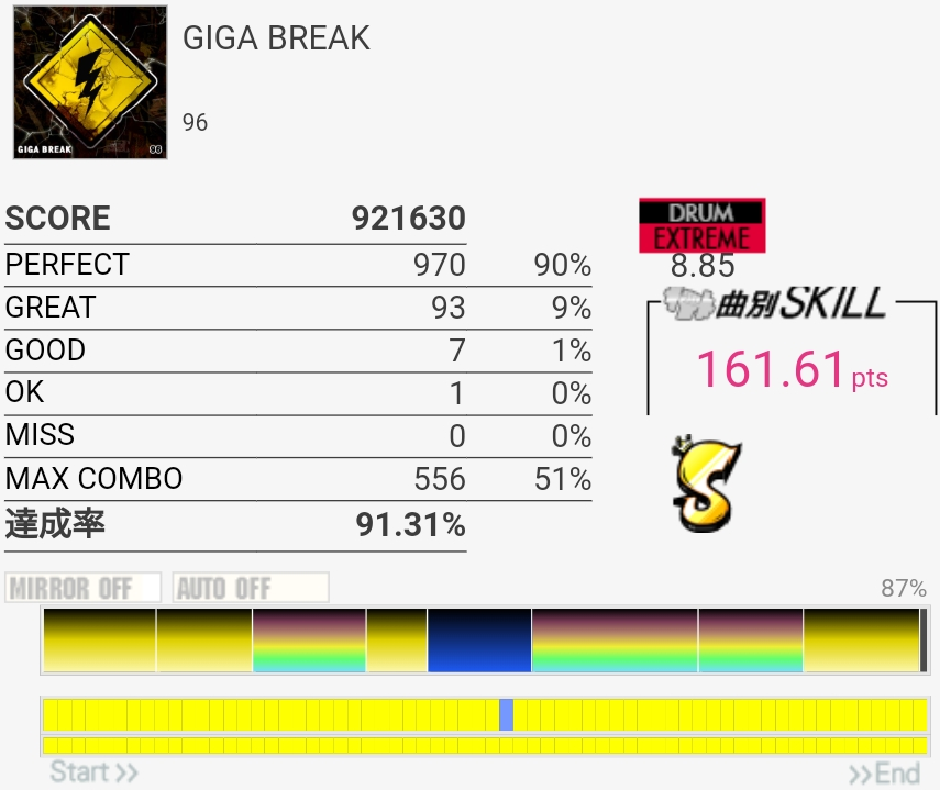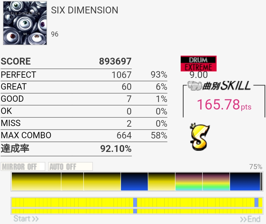 フルコン。普段よりGREAT出すぎ!終盤のツーバスは左足全部GREATだった気がする。椅子が後ろに傾いてるせいでめっちゃ腰に来る……。
