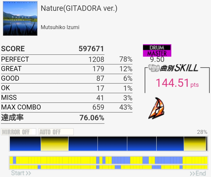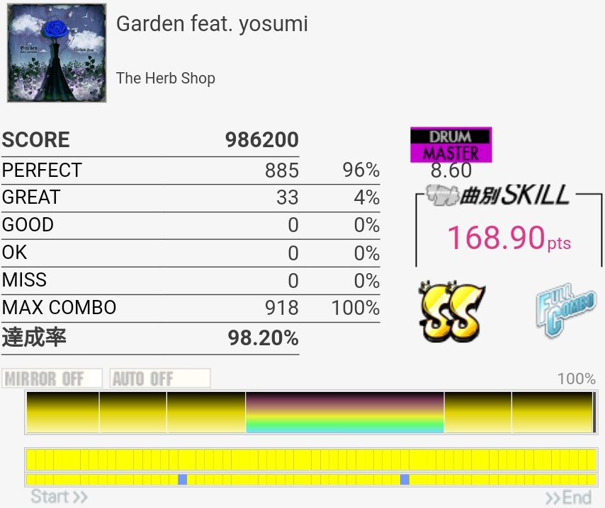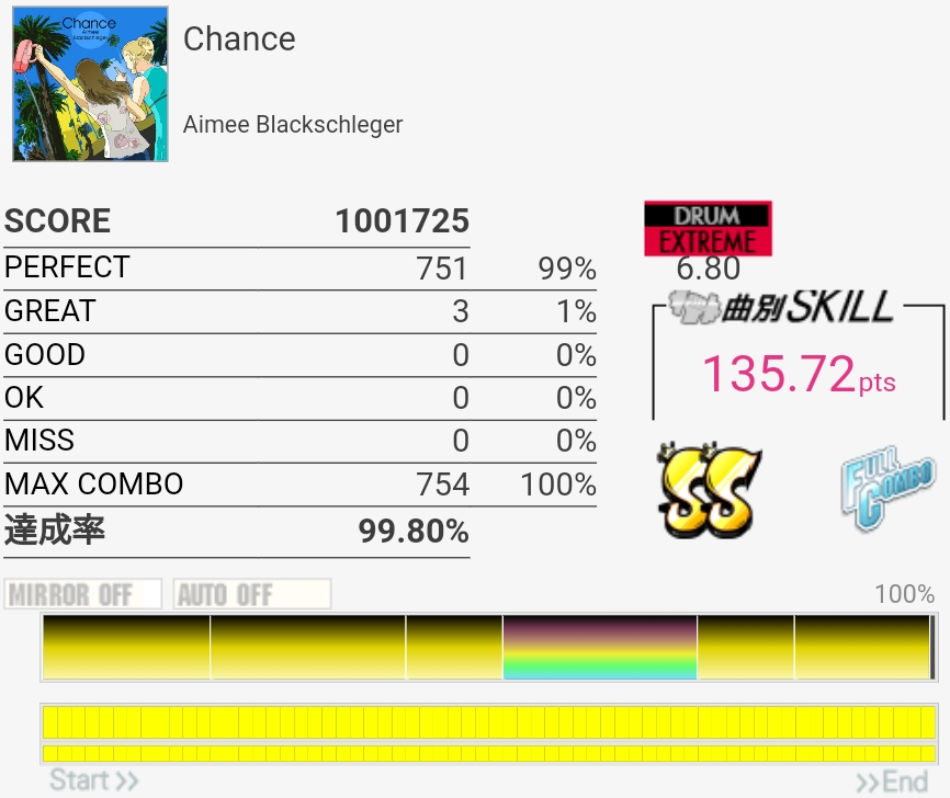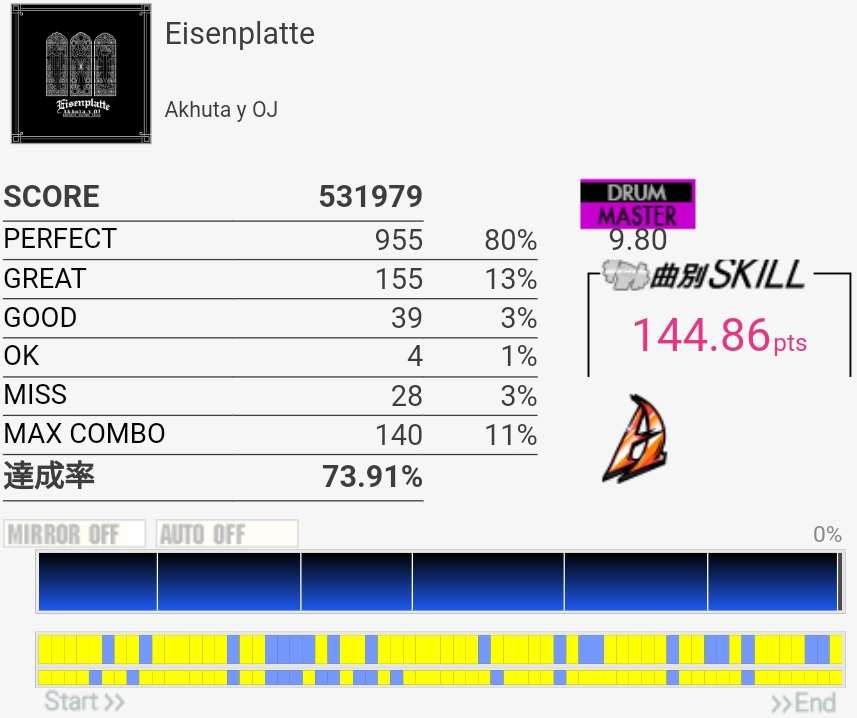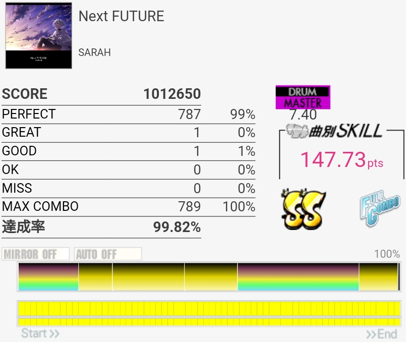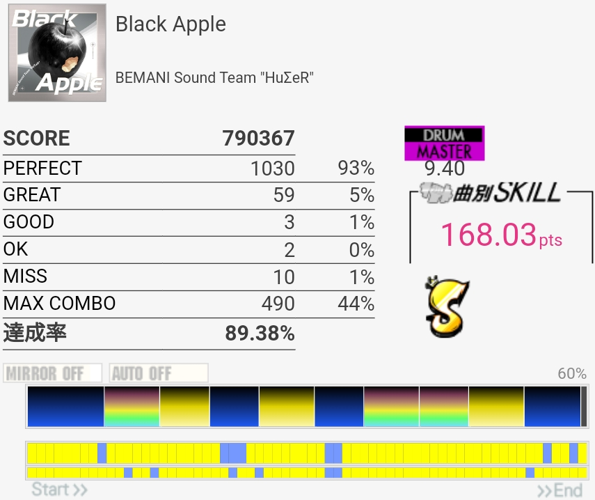 フルコン。普段よりGREAT出すぎ!終盤のツーバスは左足全部GREATだった気がする。椅子が後ろに傾いてるせいでめっちゃ腰に来る……。