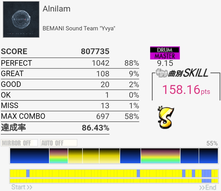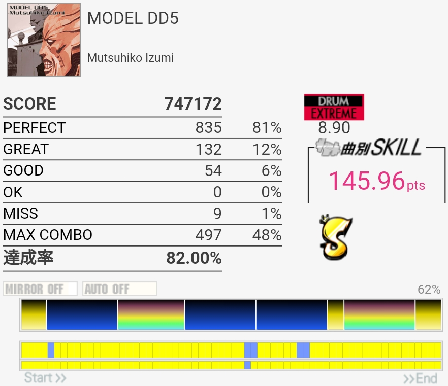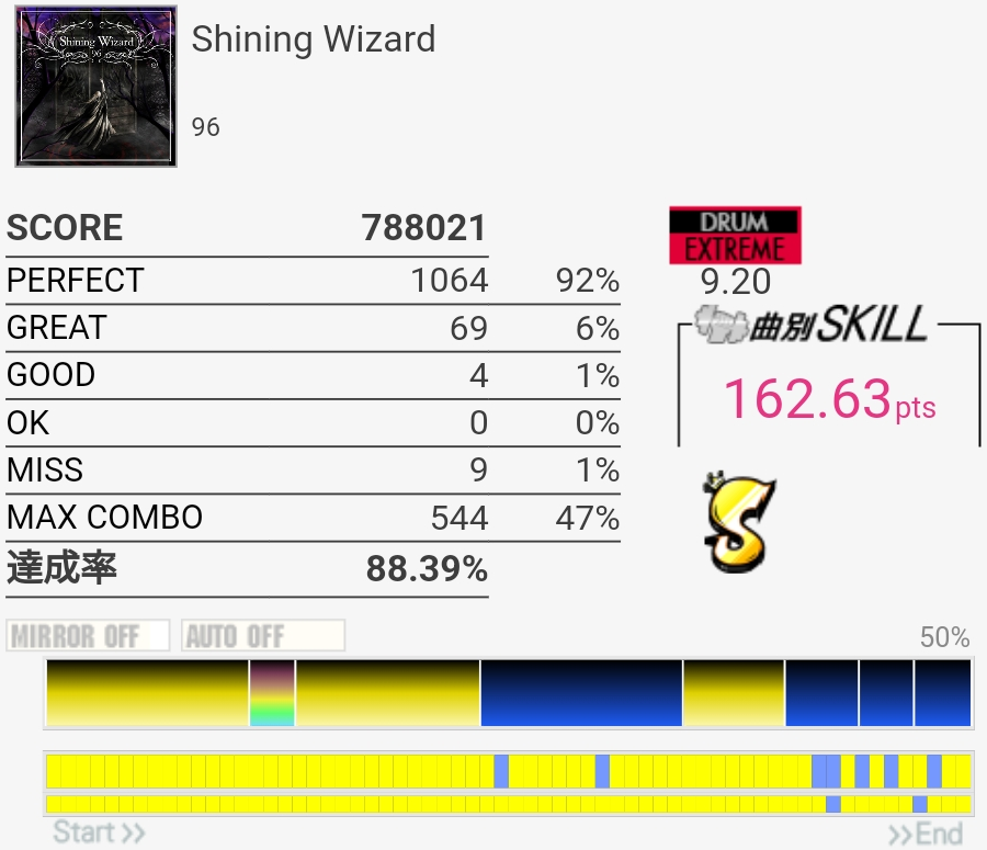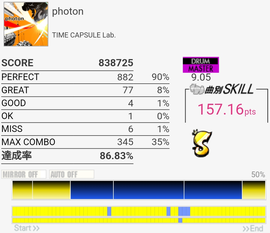 後半だんだん叩ける率が上がってるんだけどその分前半がダメになってる。3フレーズ目終わりのSNがまったく繋がらん……。
