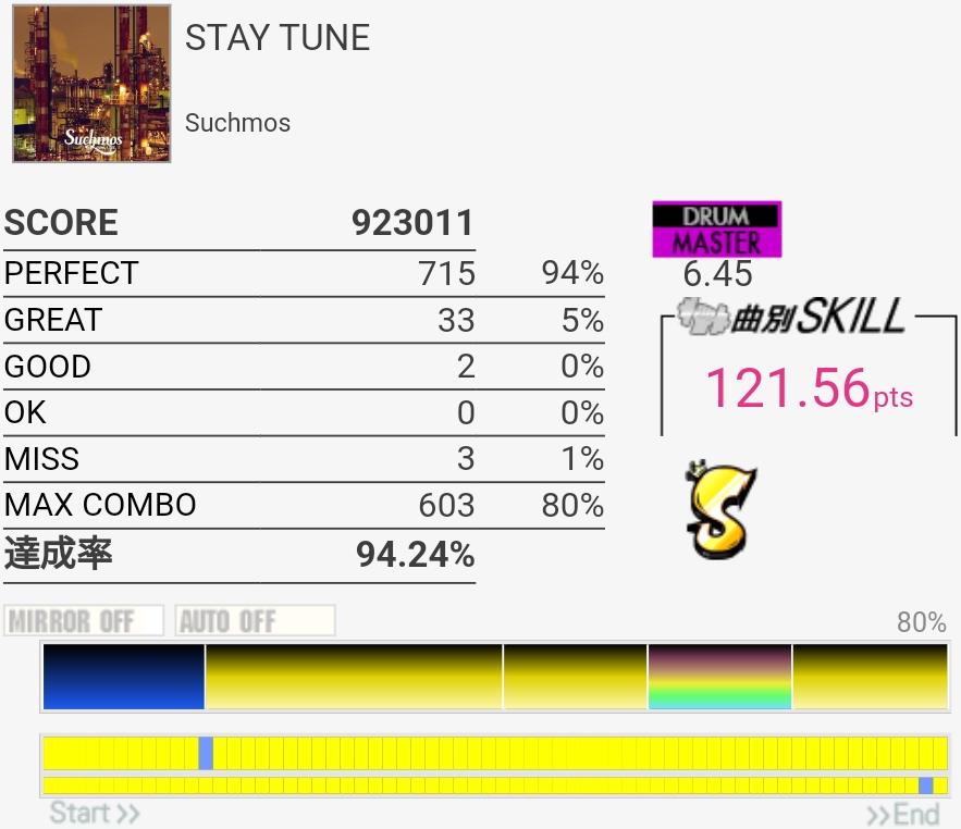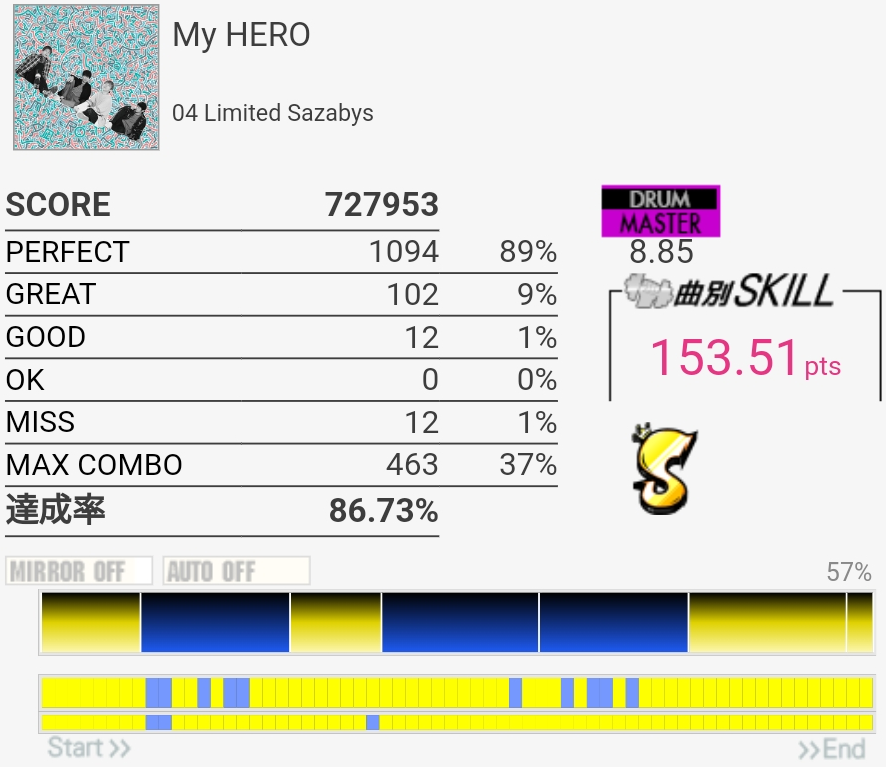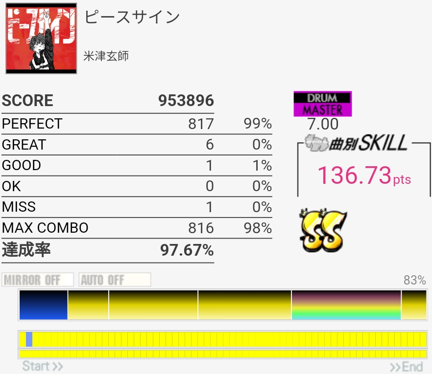 8分LPのところでめっちゃズレた。それにしても全体的にパフェ率が低くて、HHとSNとタムで判定がズレてる感じ……16ビートだとオープンの感覚になるから苦手なのかな。