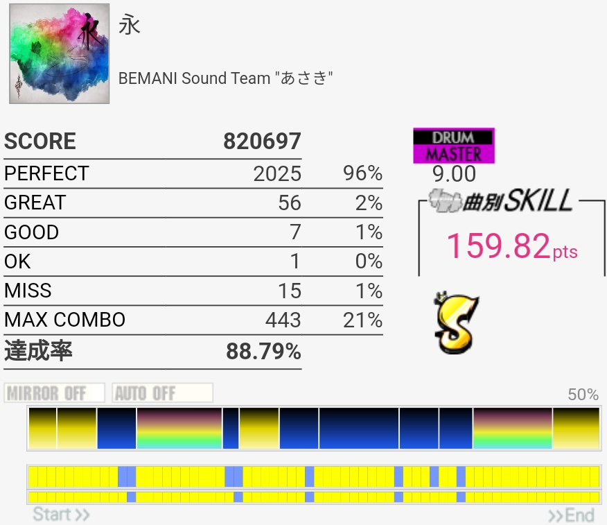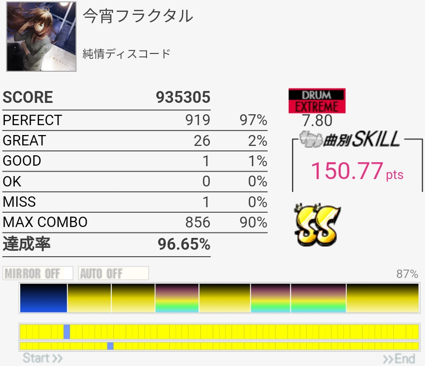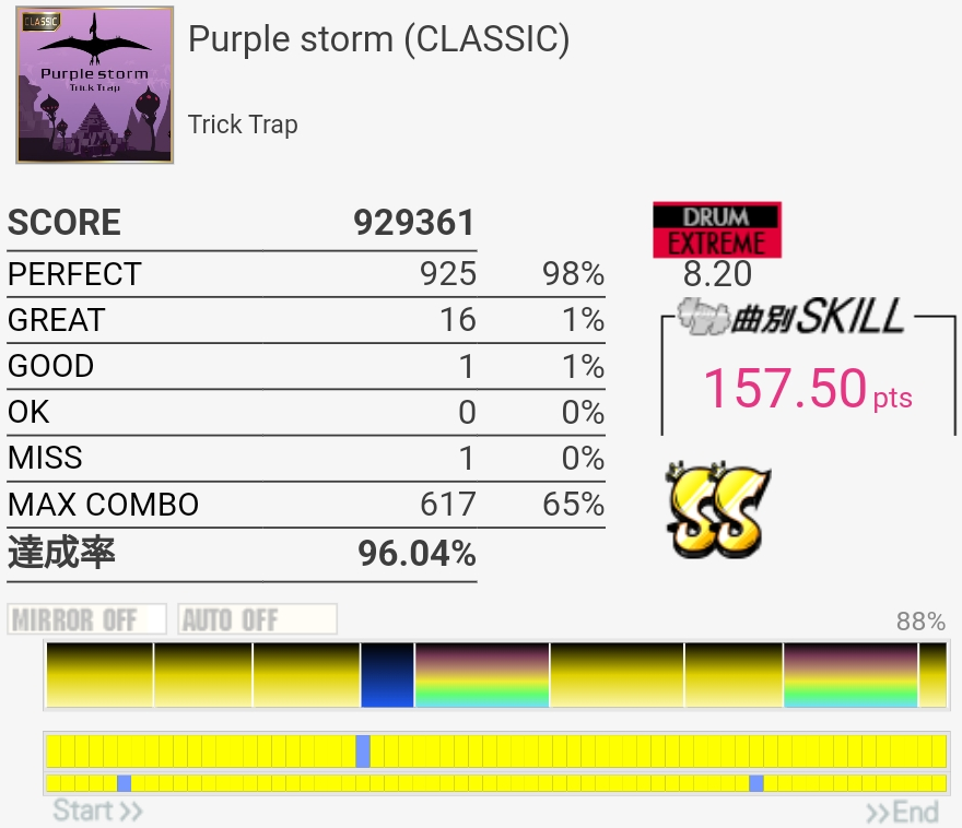 SS取得。あさき曲にもたまにある表拍BP+裏拍タムがすごい苦手……この譜面はLTだからギリギリ叩けるけどXG譜面でFTになるとダメ。