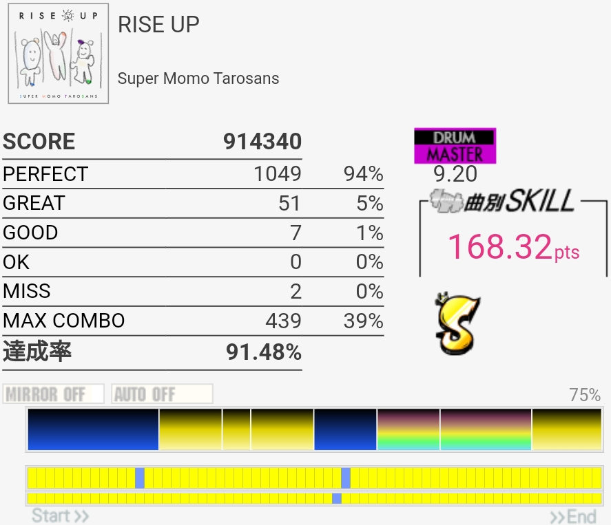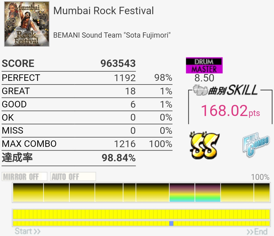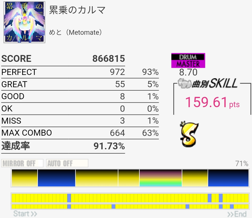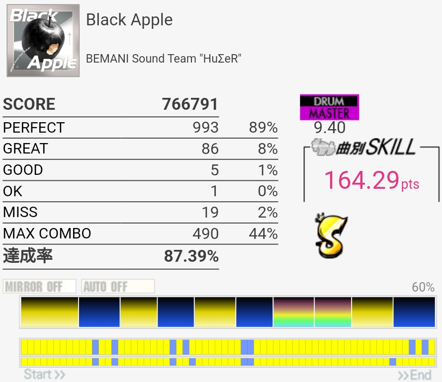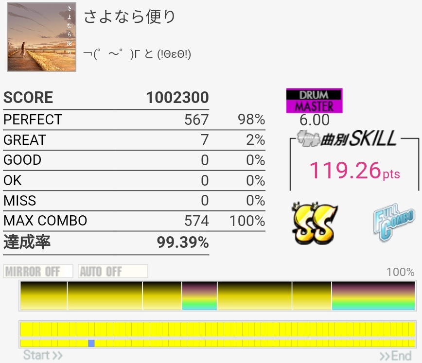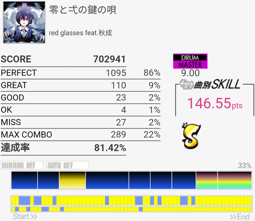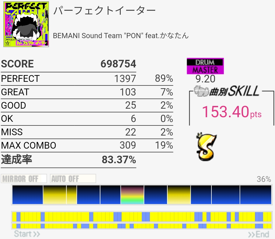 やるごとにじわじわ伸びはするけど……まずテレッテレッテレッテレッのところが意味わかんなさすぎて叩けないんだよね。LC+SN裏拍だしCYはSN2打目と同時だし意味わからん。後半は素直な形じゃないしBPM速くて追いつかないしやっぱり9.40くらいほしい。