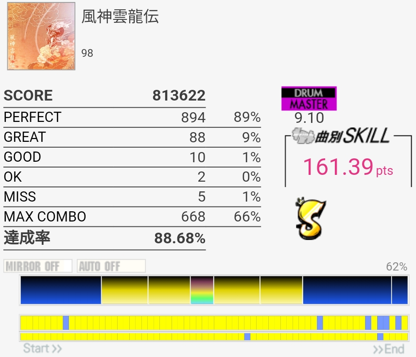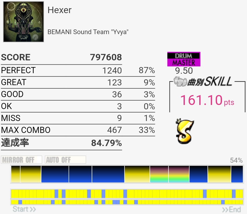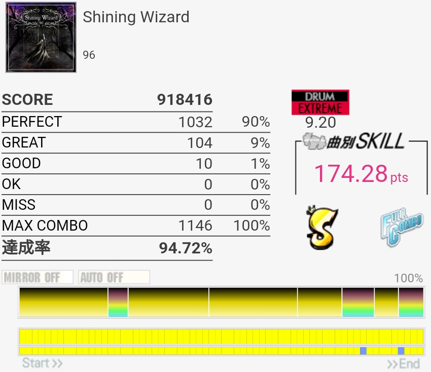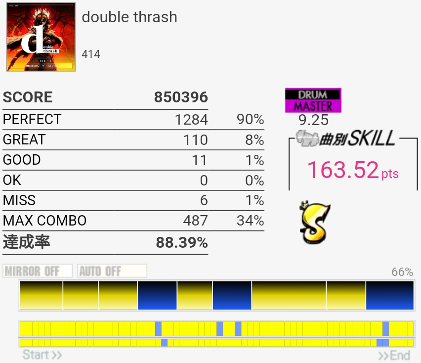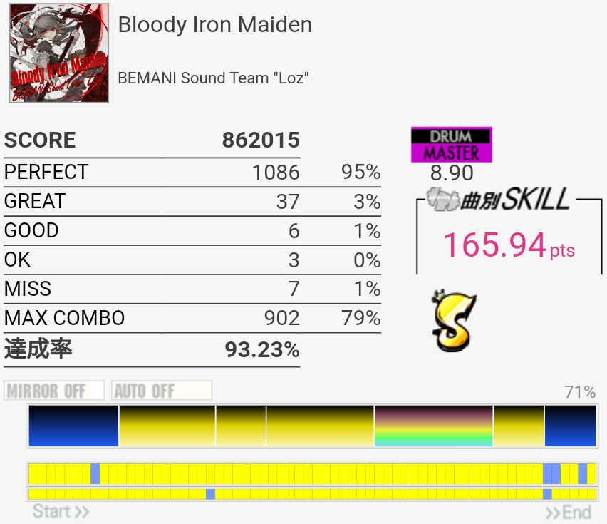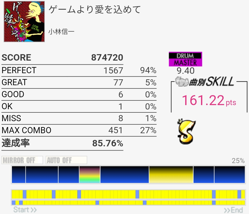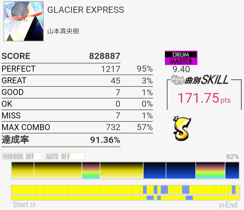 フルコン!S判定だけど。終盤の8分LP地帯でめちゃめちゃ崩れたのが痛い。ペダルの返しが弱くて感覚ズレる……というのは言い訳なのでいつかSS乗せたい、けどもうタム回し繋がる気がしないな。