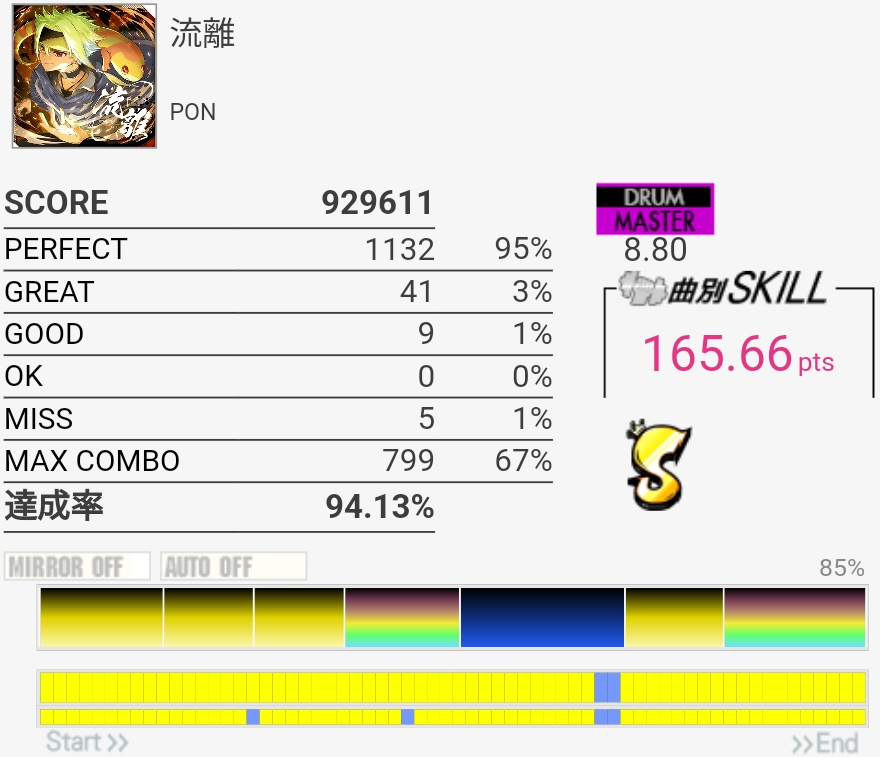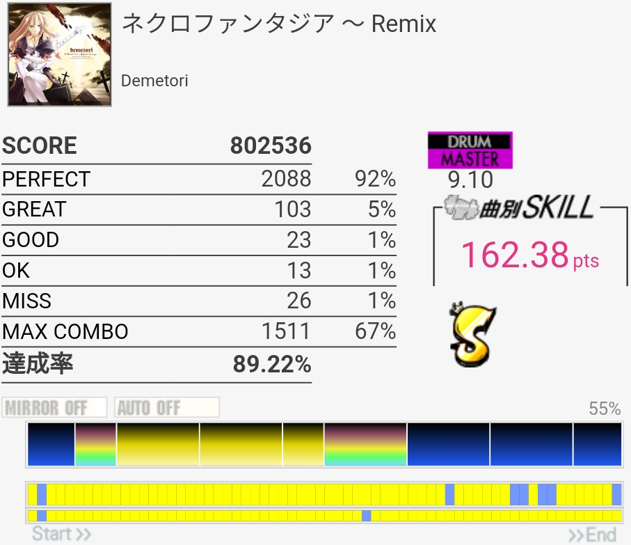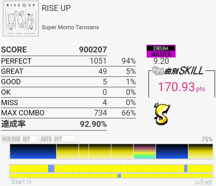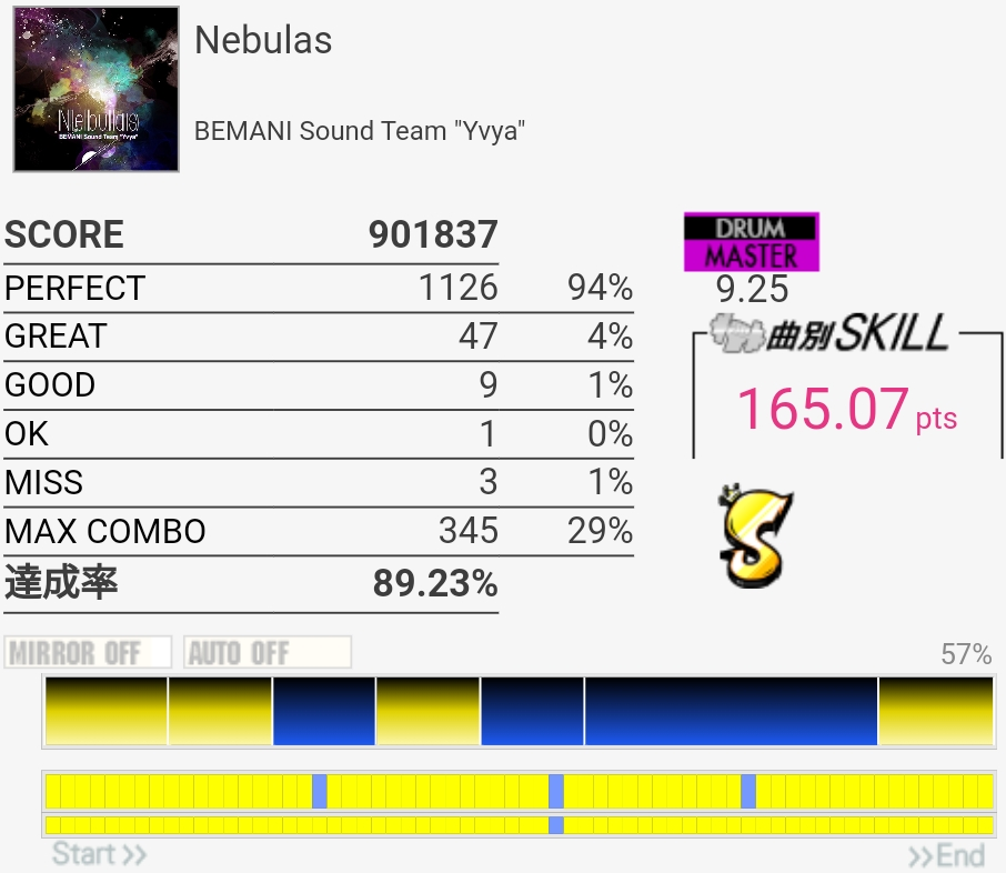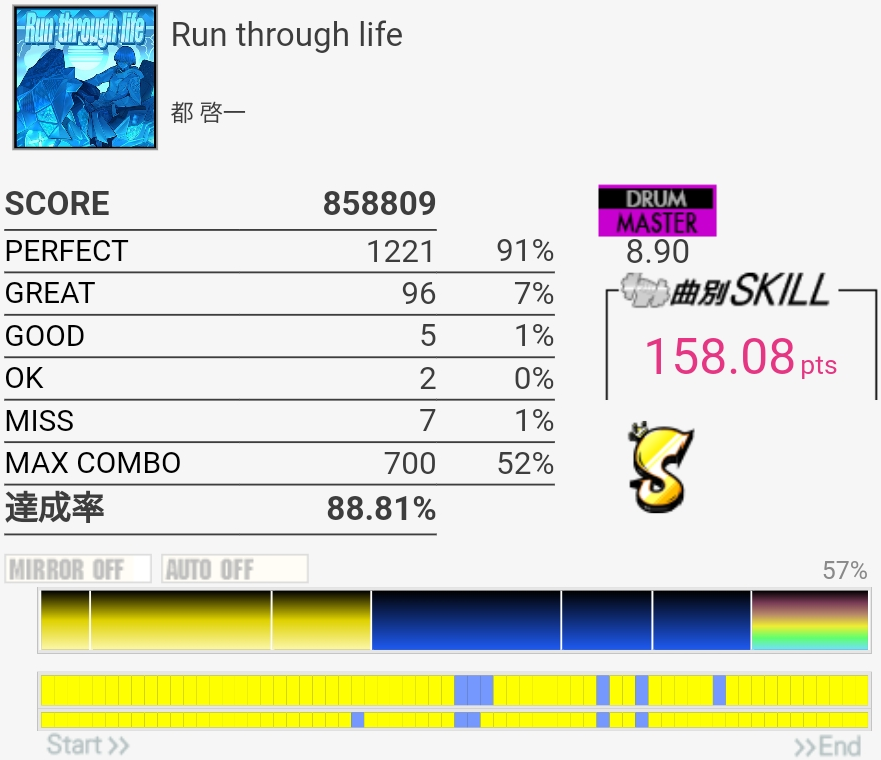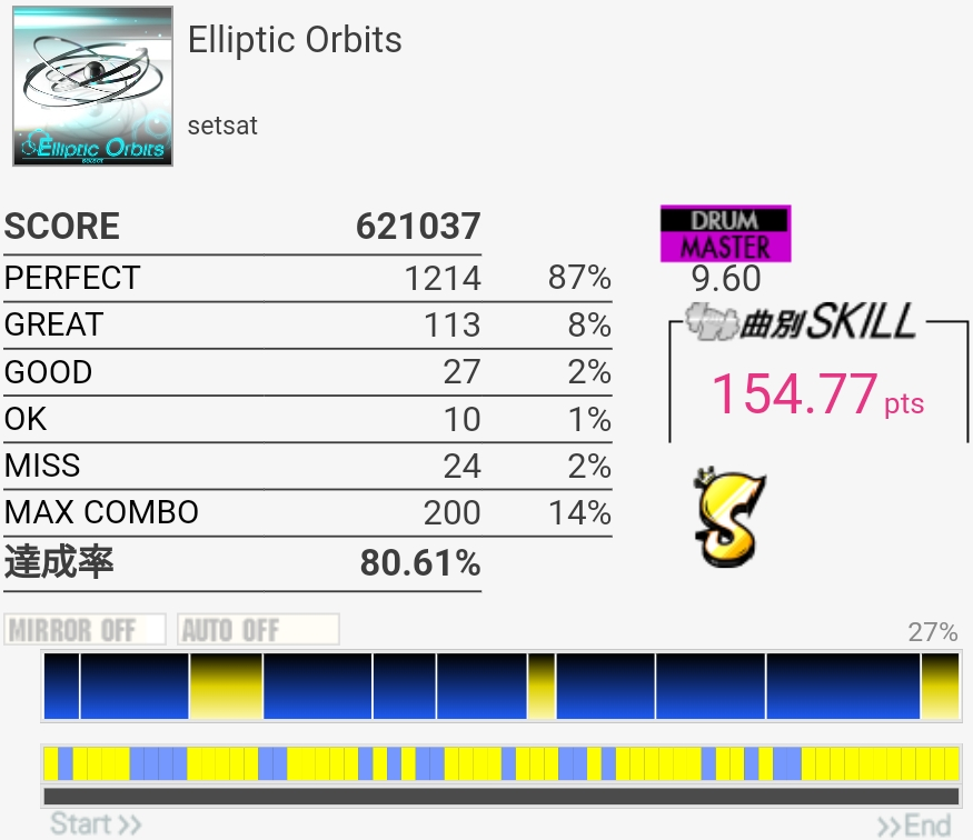 いいかげんSNの個数を覚えよう。2か所も切ったのに170点乗ってて不思議だったんだけどパフェ率けっこう高くね?ペダルがめっちゃ馴染むんだよなあ。