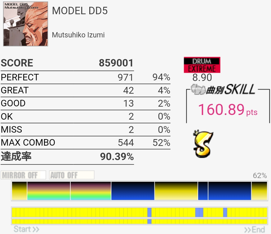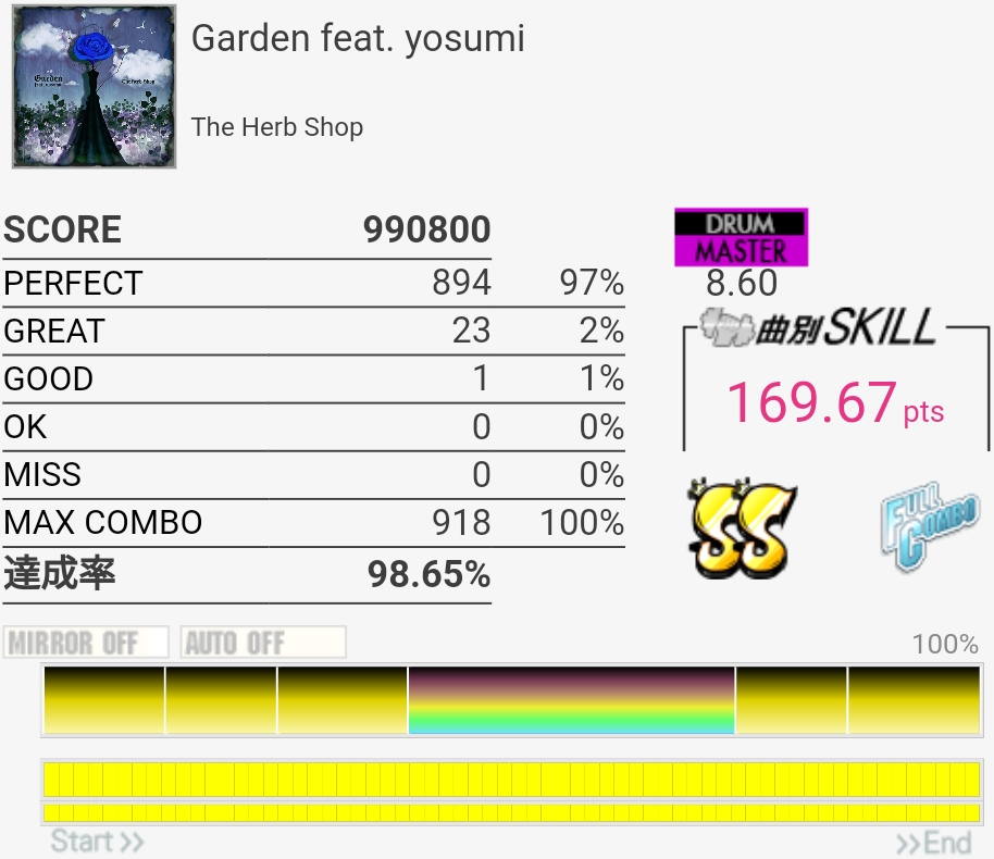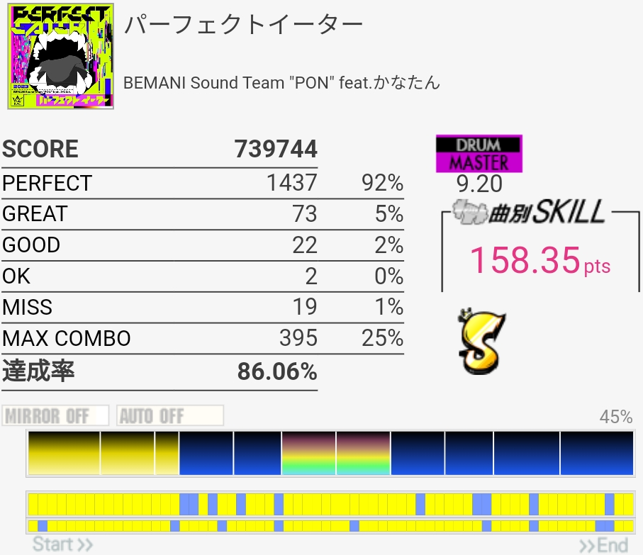 微伸び。ツーバス地帯全パフェだったりそこまではめちゃくちゃ上手かったんだけど、その後のフレーズでGREATめちゃくちゃ出た。99%乗せたいなあ。
