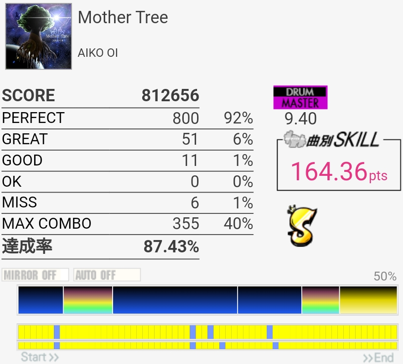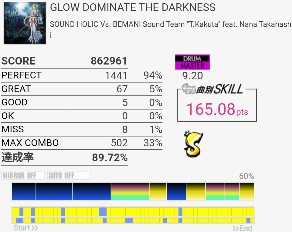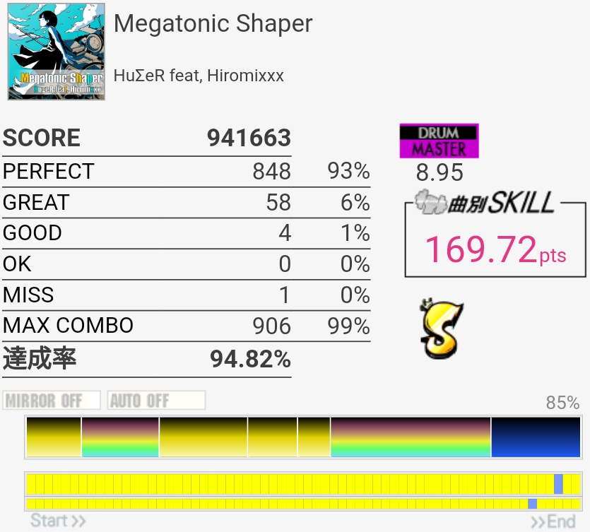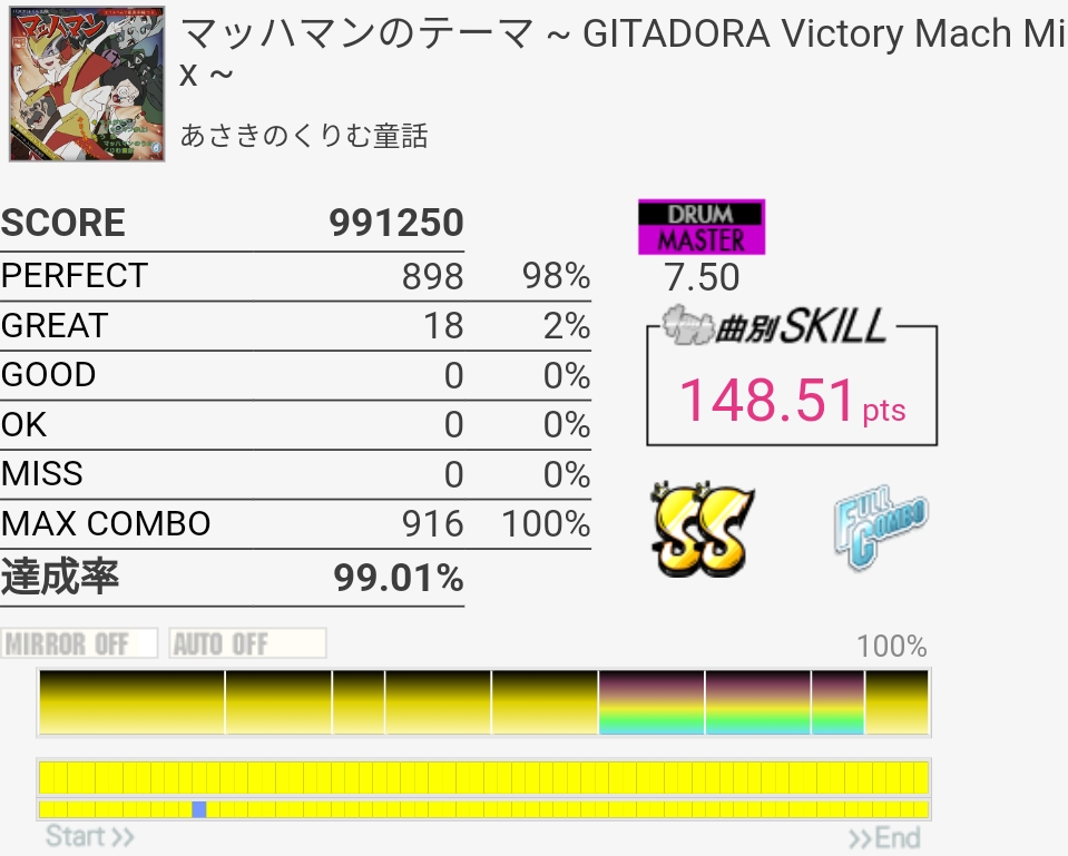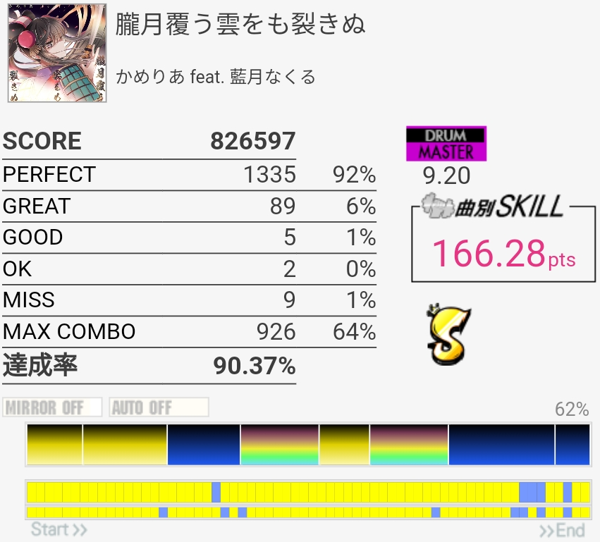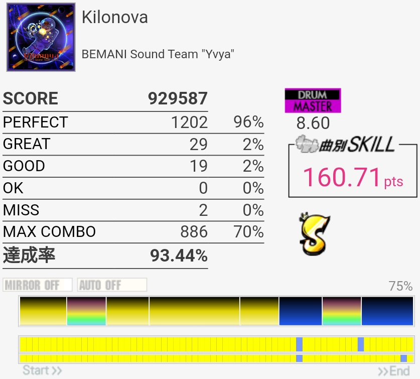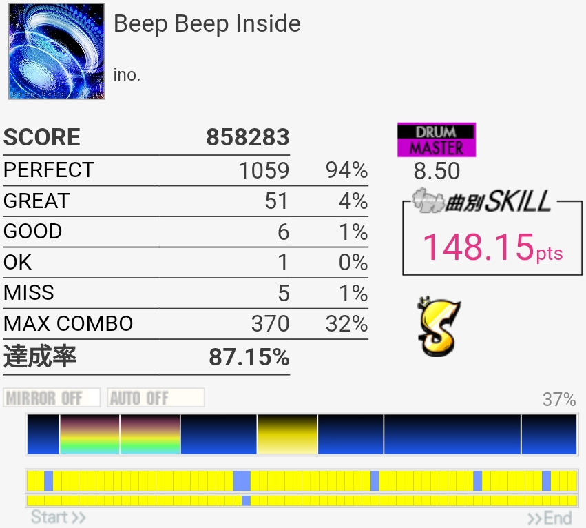 EXTの99.54%が対象から抜けてたけどMASに対象付いた!後半腕を拳一個分くらい上げる感じでやったらタムがちょっと叩きやすくなったのでBPM速い曲ではそれを意識するといいかもしれない……慣れてないからすぐ腕が疲れたけど。
