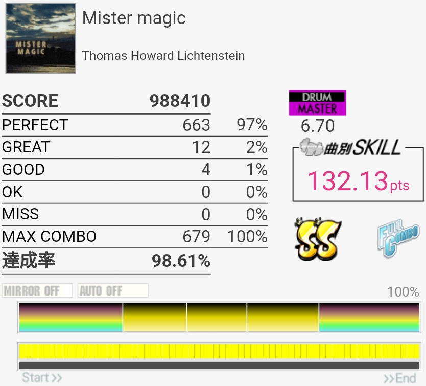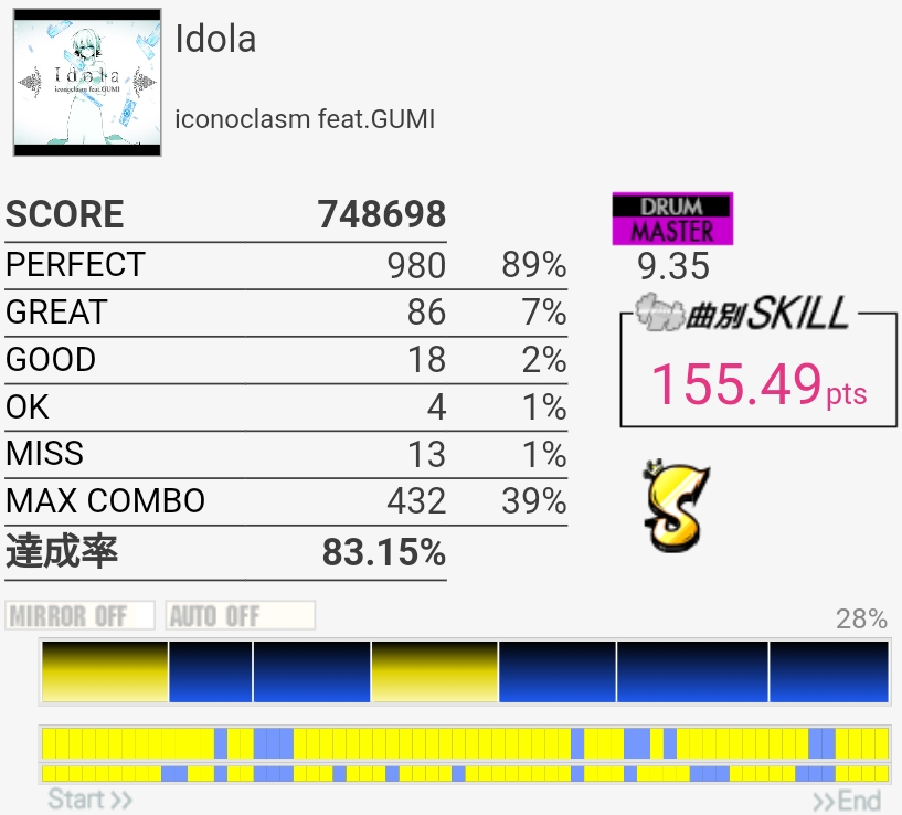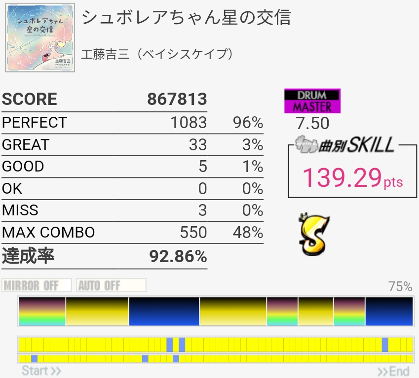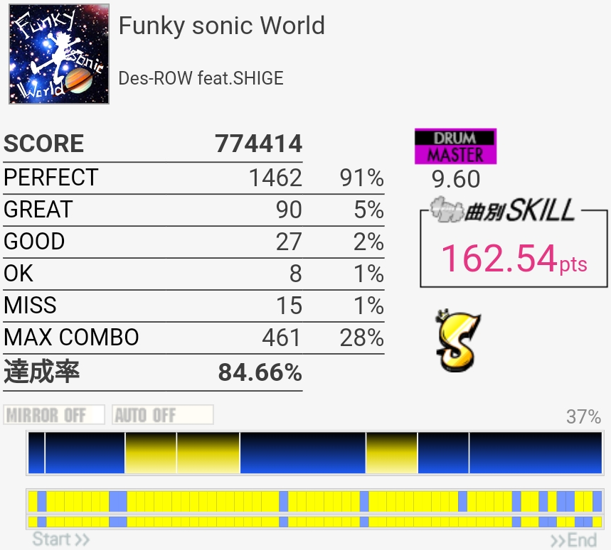 フラムがよくわかんなくて絶対GOOD出る。微妙な速さで気を抜くとGREAT出るし難度値のわりにやらしい感じ……。