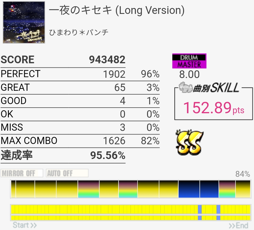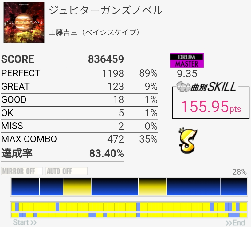 SS取得。シンバルとタム×3のところはどっちもスティックぶつかっちゃってダメ……道中苦手すぎてもうやりたくないっす。