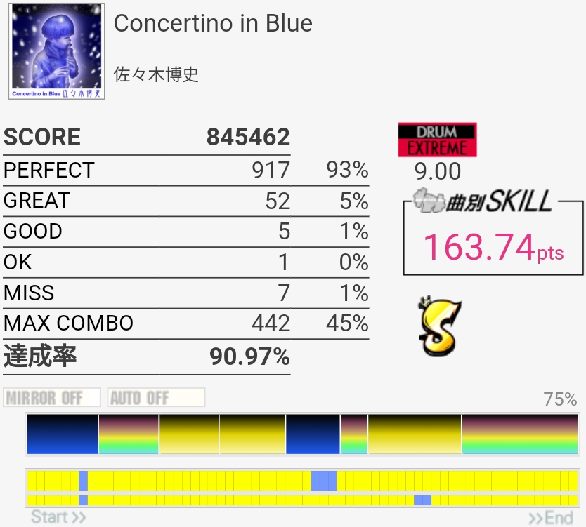 S取得。かなり苦手意識ある曲なんだけど久しぶりにやったら思っていたほどには右腕を壊されなかった。「告別を」の後のタム3個連打が全く追い付かないのとコロンビアで毎回切るのがどうにもならん。これ8.50だったって噓でしょ。